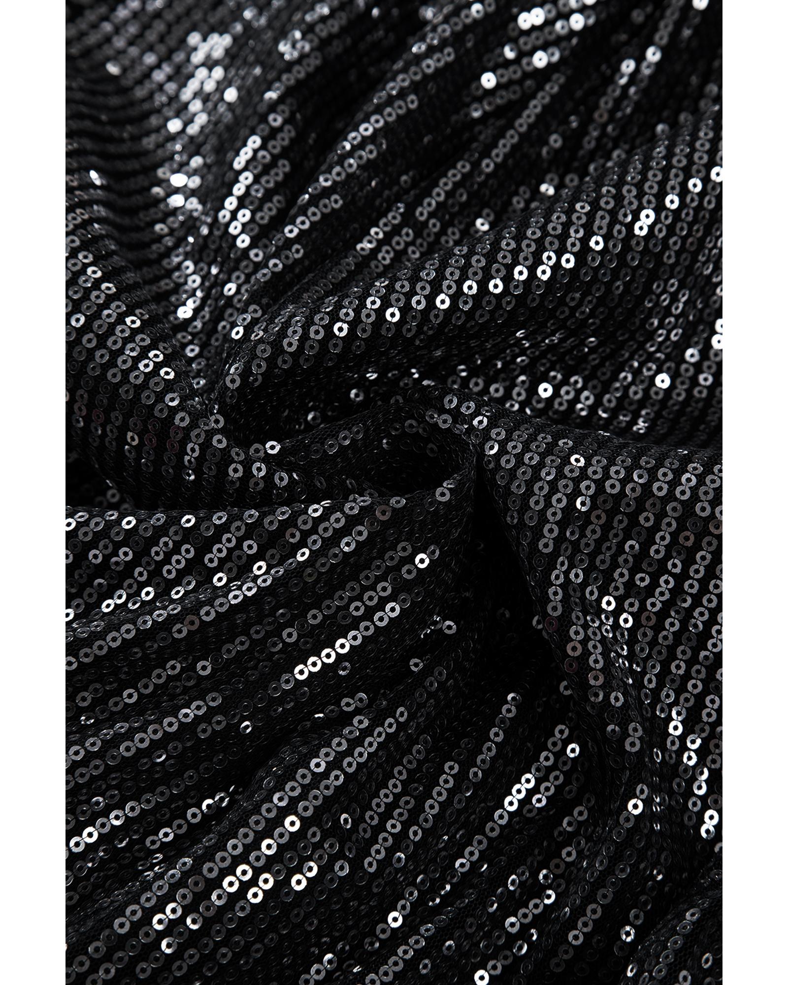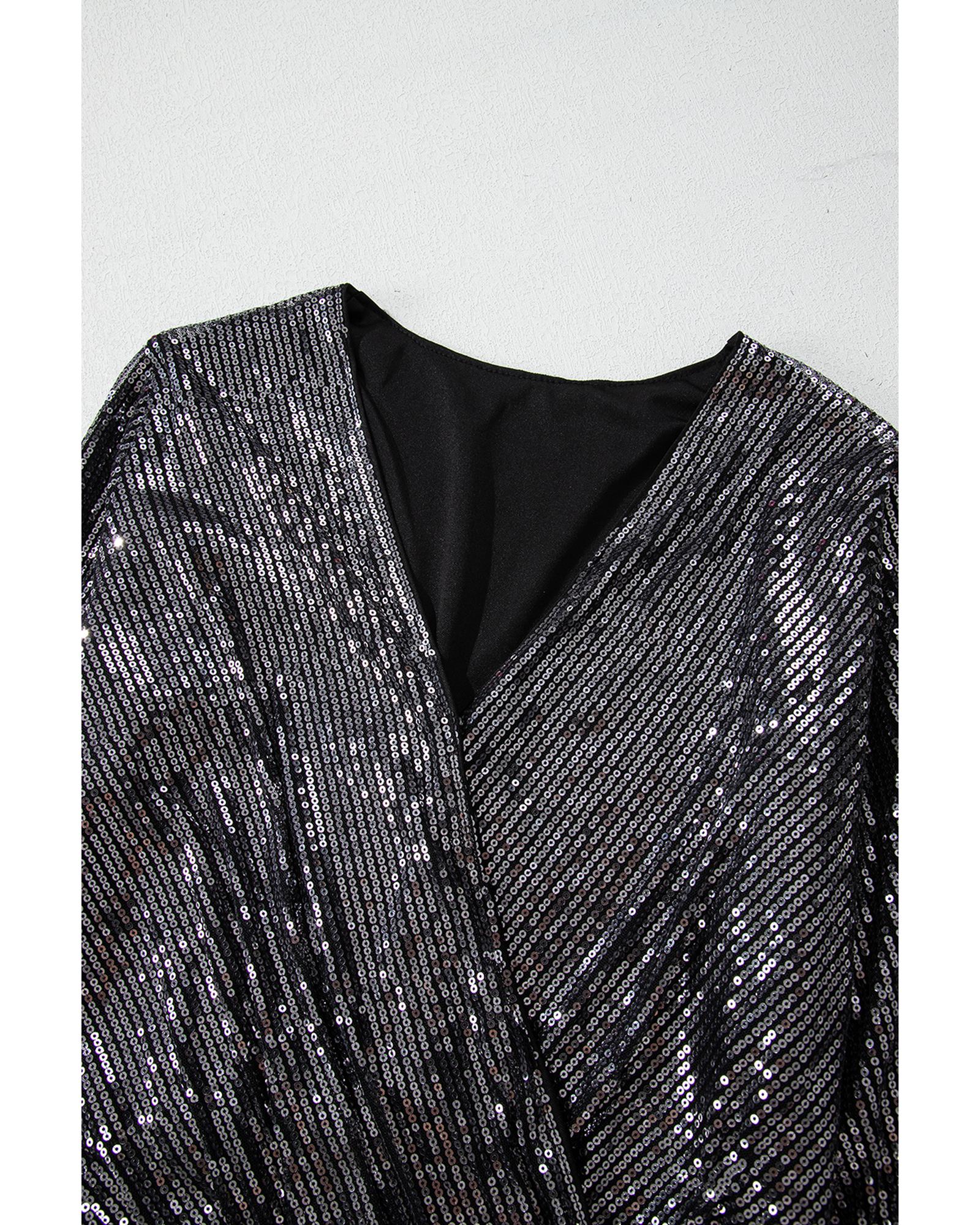 - Black Sequin Mesh Long Sleeve Surplice Neck Bodysuit