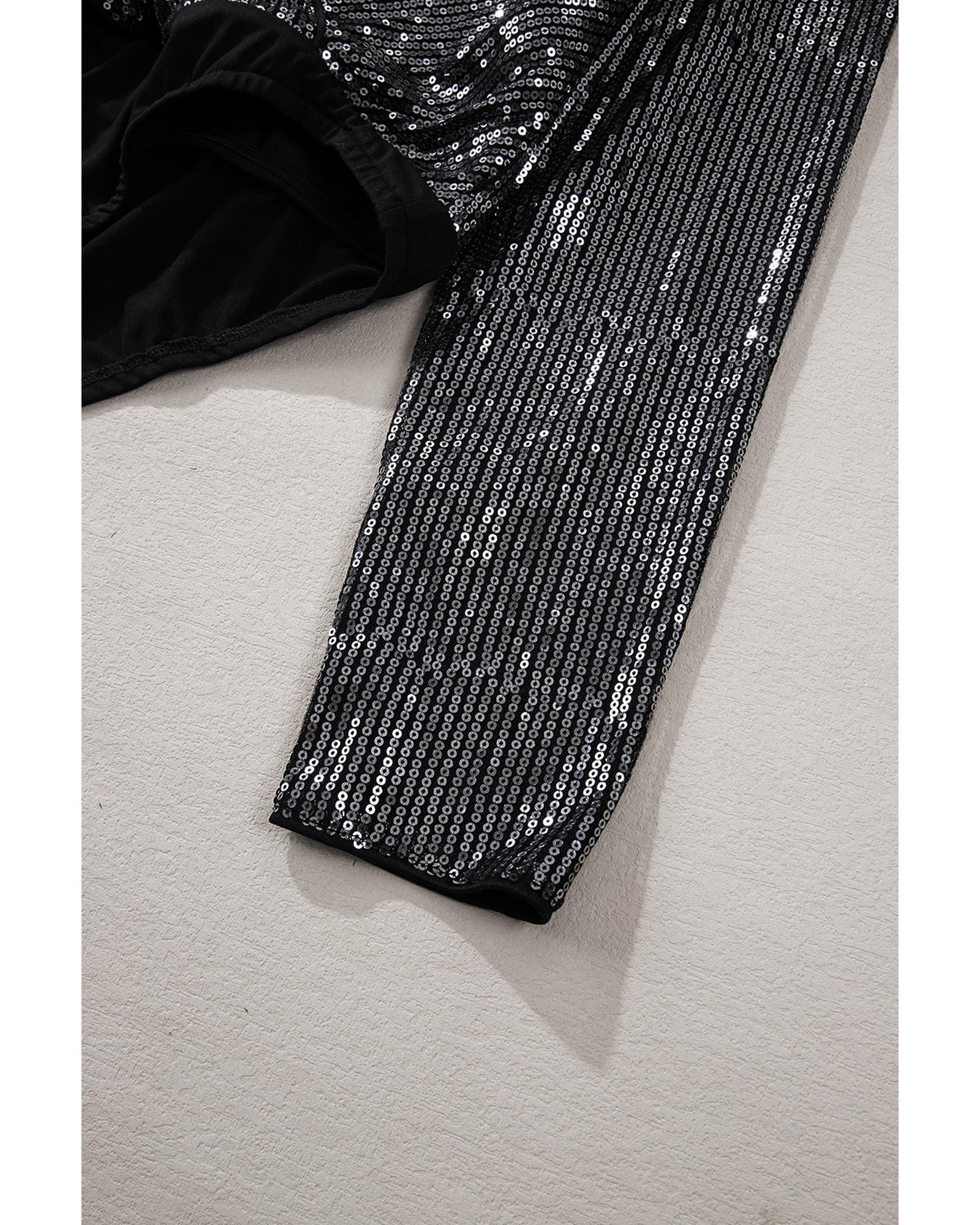 - Black Sequin Mesh Long Sleeve Surplice Neck Bodysuit