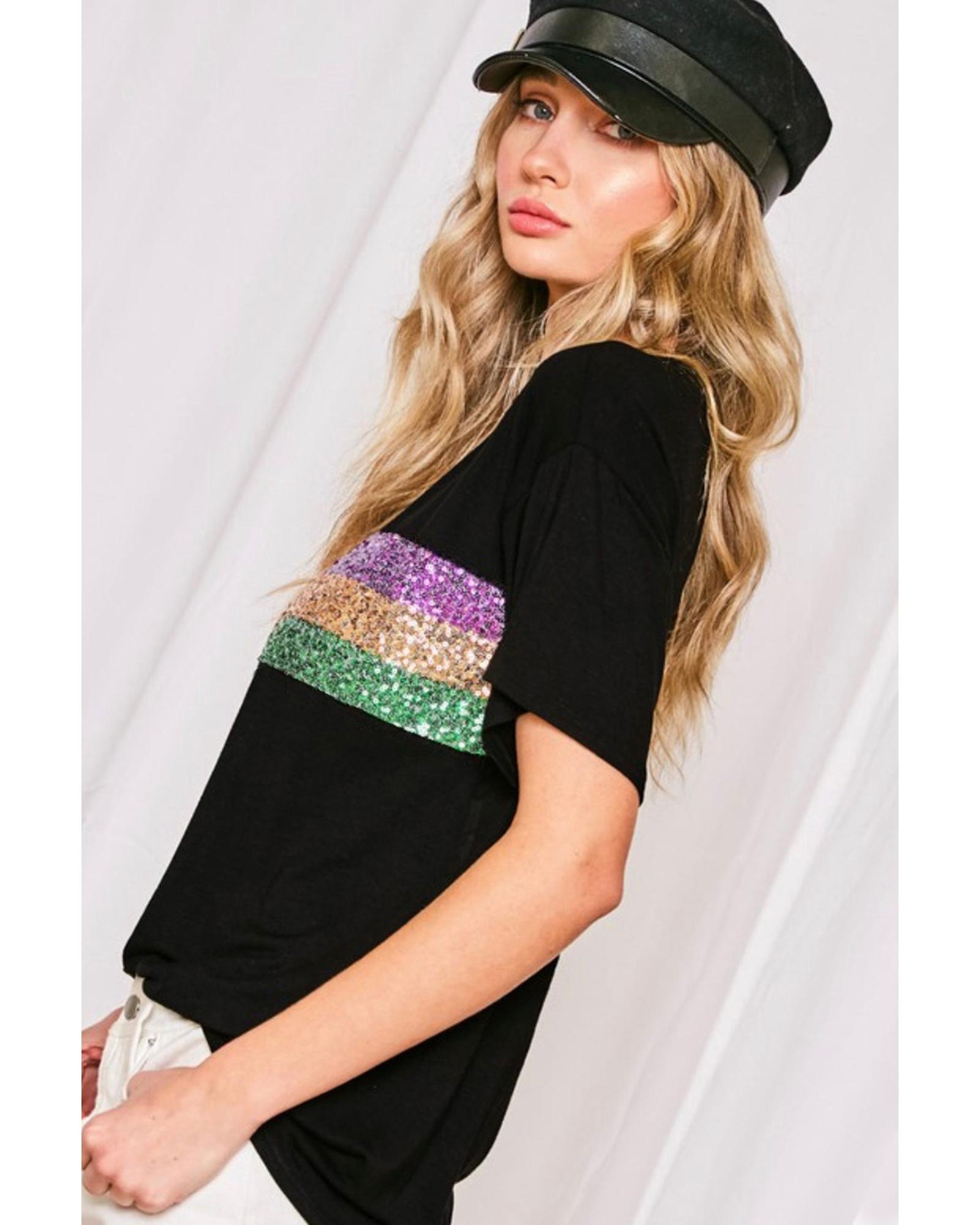 - Black Sequin Stripes Patchwork Mardi Gras Crew Neck T