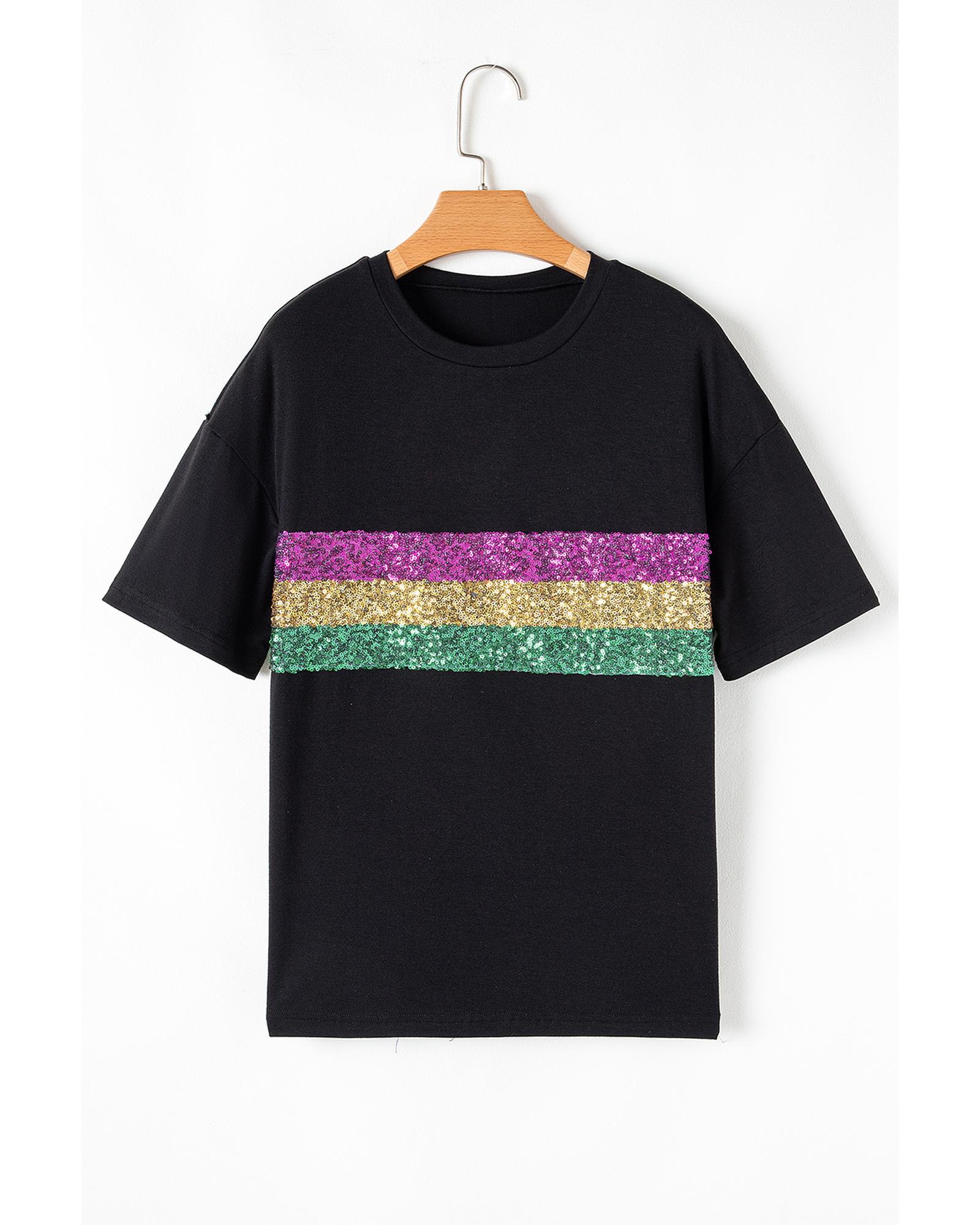 - Black Sequin Stripes Patchwork Mardi Gras Crew Neck T