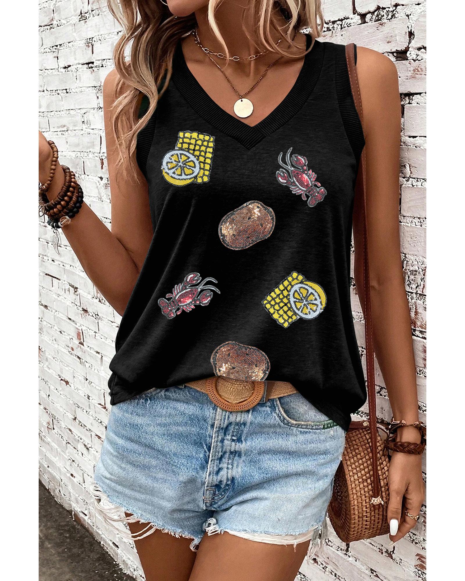 Black Sequined Crawfish Ribbed V Neckline Tank Top – L