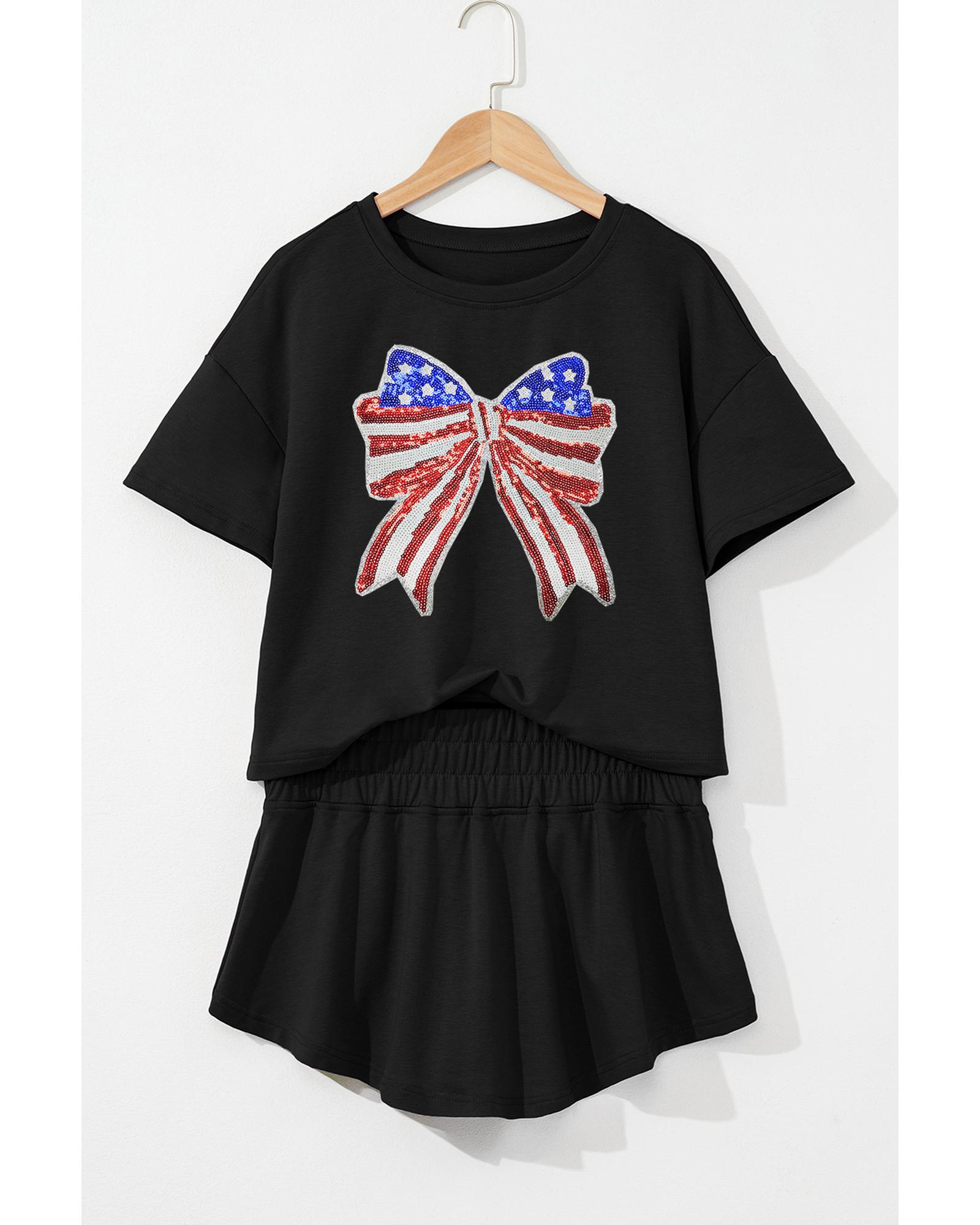 Black Sequined Flag Bow Pattern Short 2pcs Skort Set – L