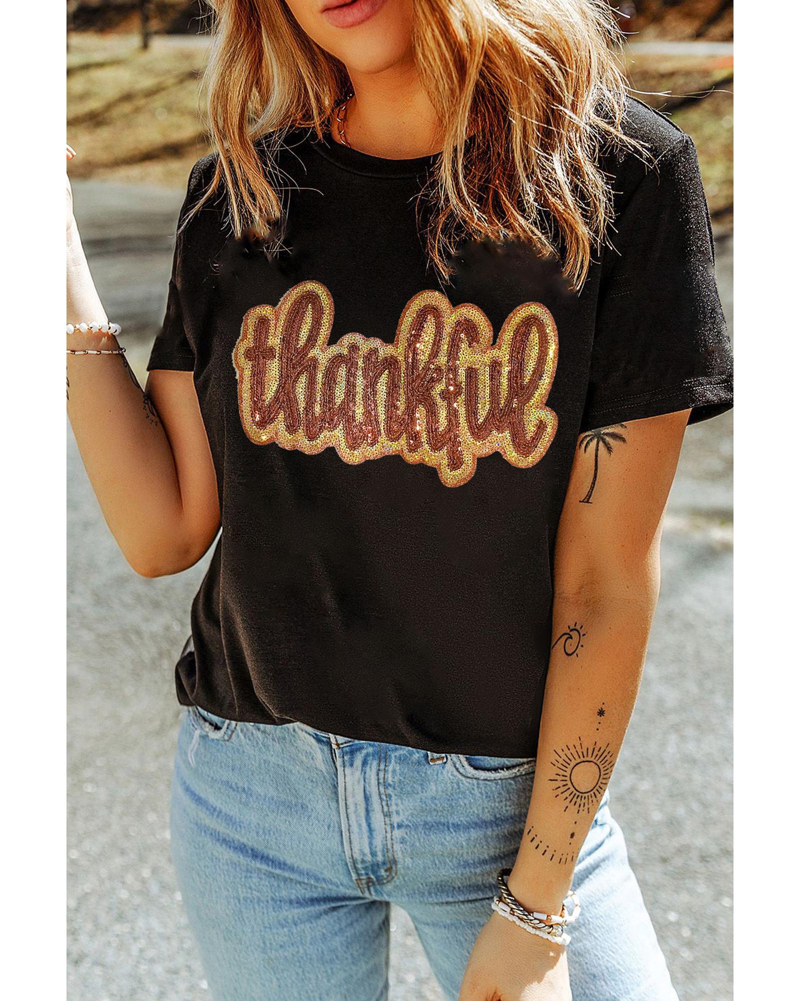 - Black Sequined Thankful Round Neck Graphic Tee