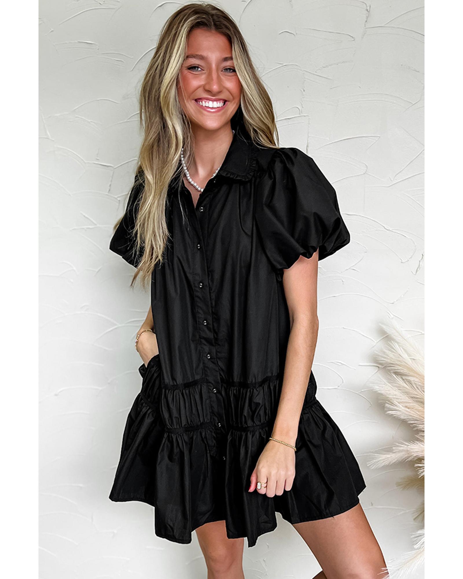 Black Shirt Style Button Down Puff Sleeve Ruffle Hem Dress – L