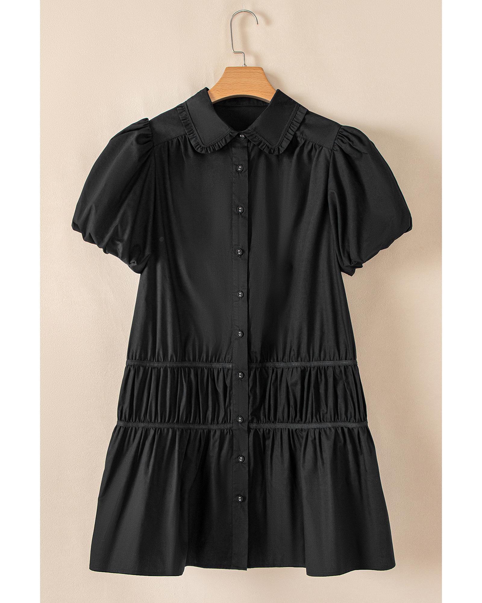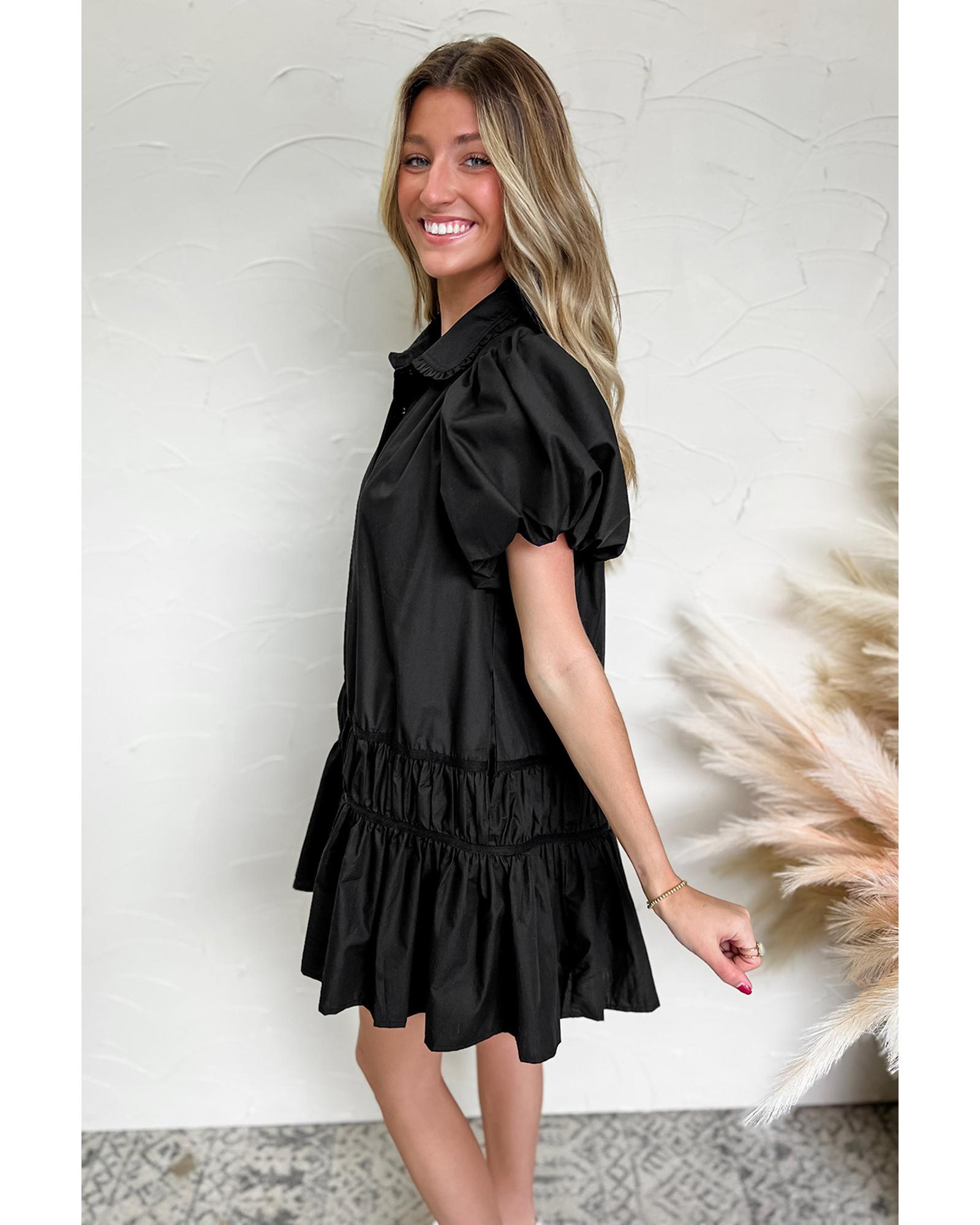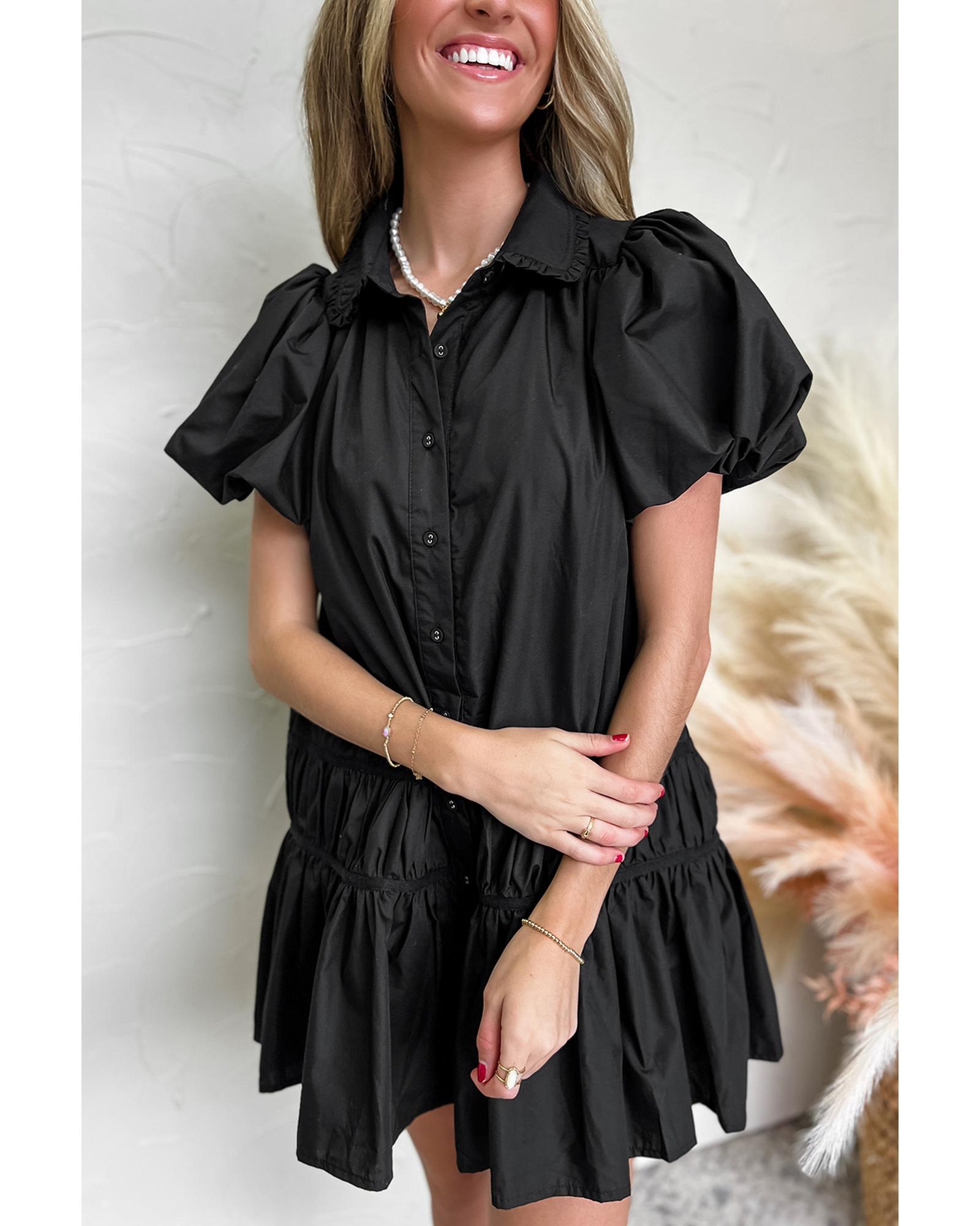 Black Shirt Style Button Down Puff Sleeve Ruffle Hem Dress – M