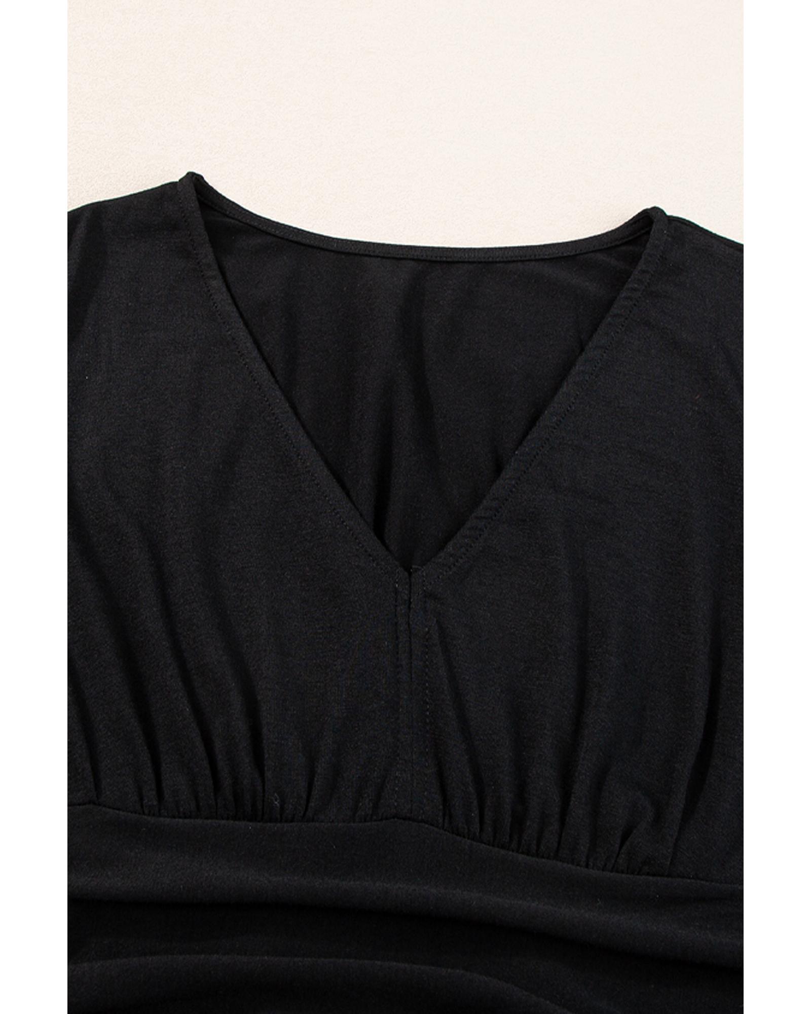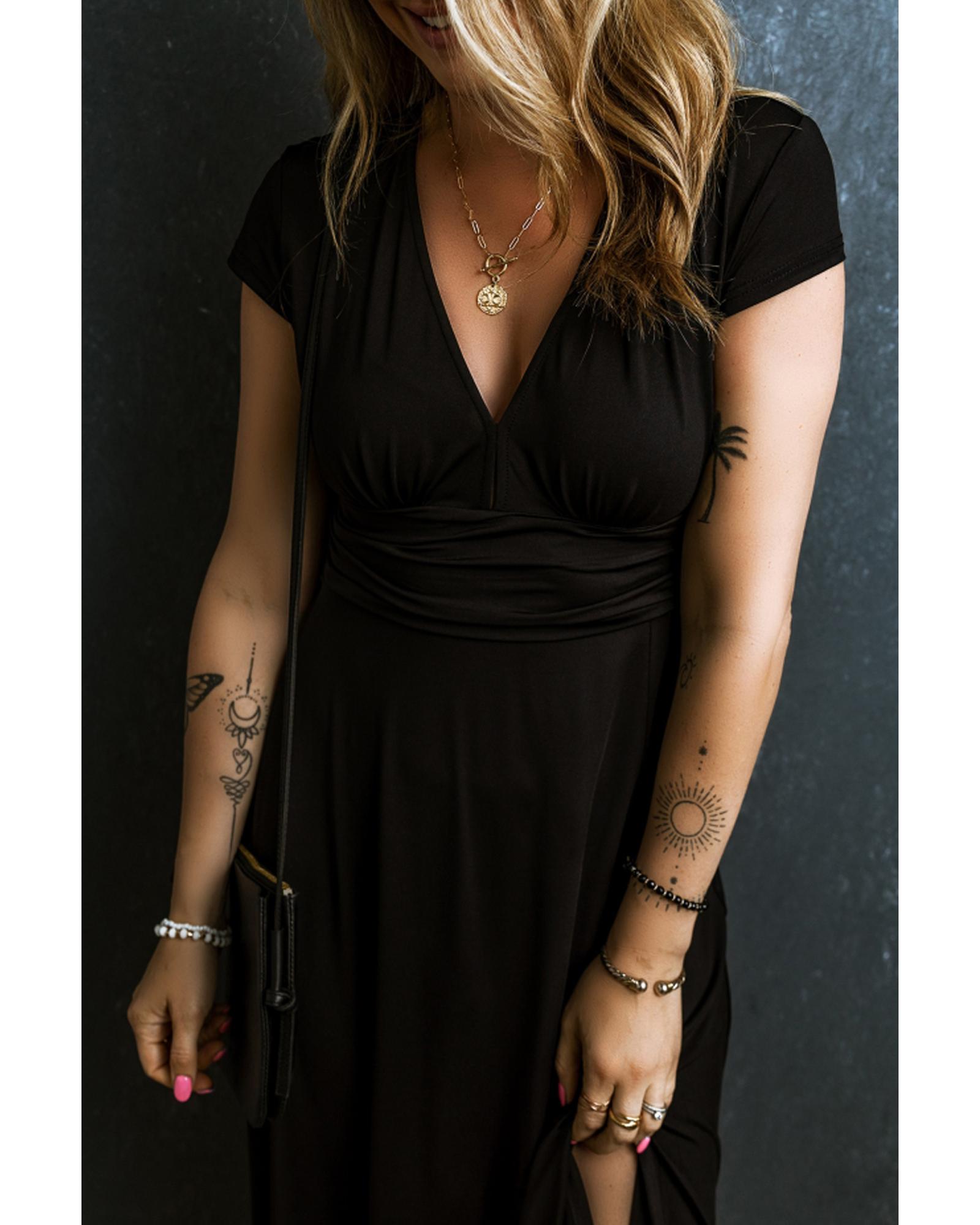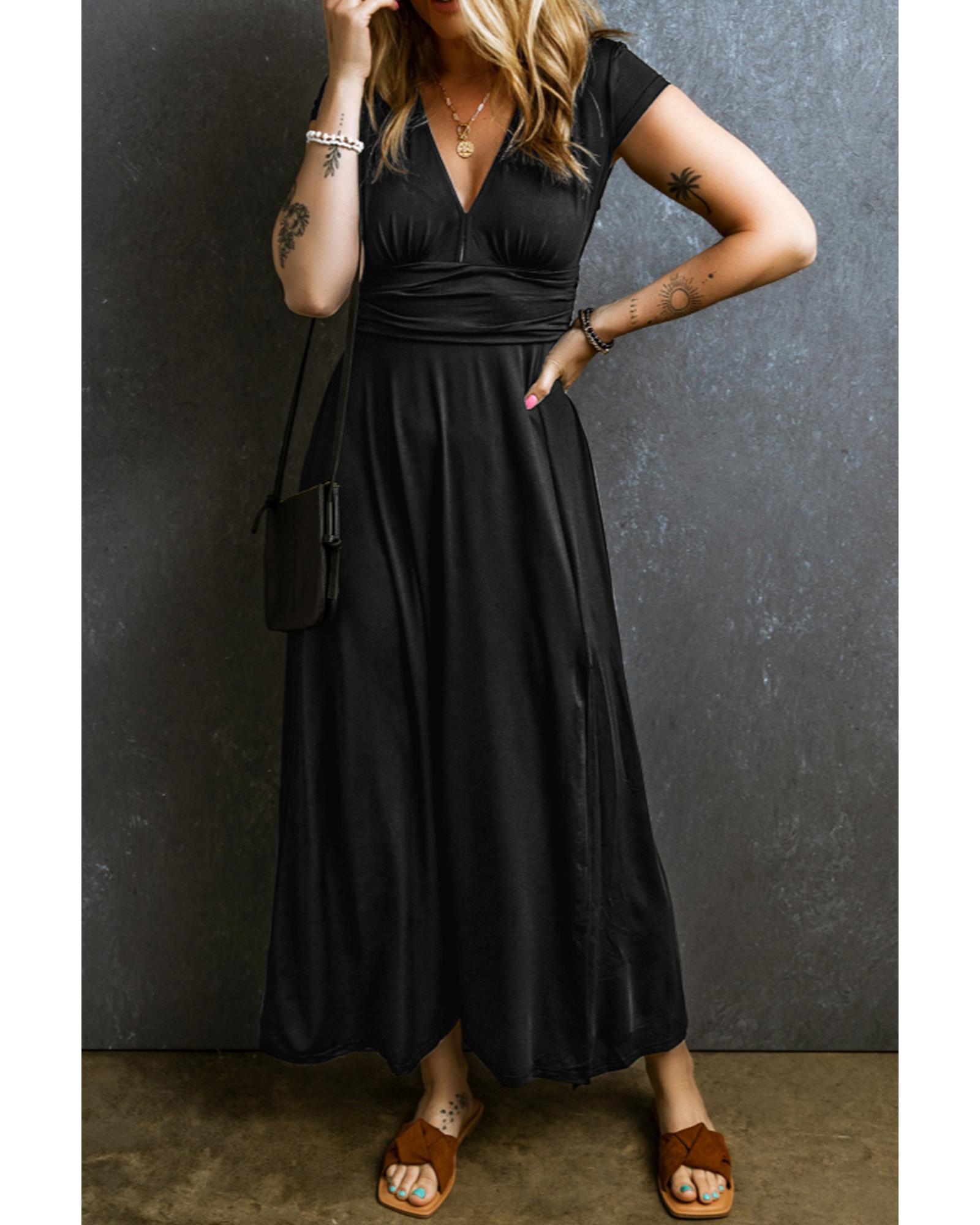- Black short sleeve shirred high waist v neck maxi dress