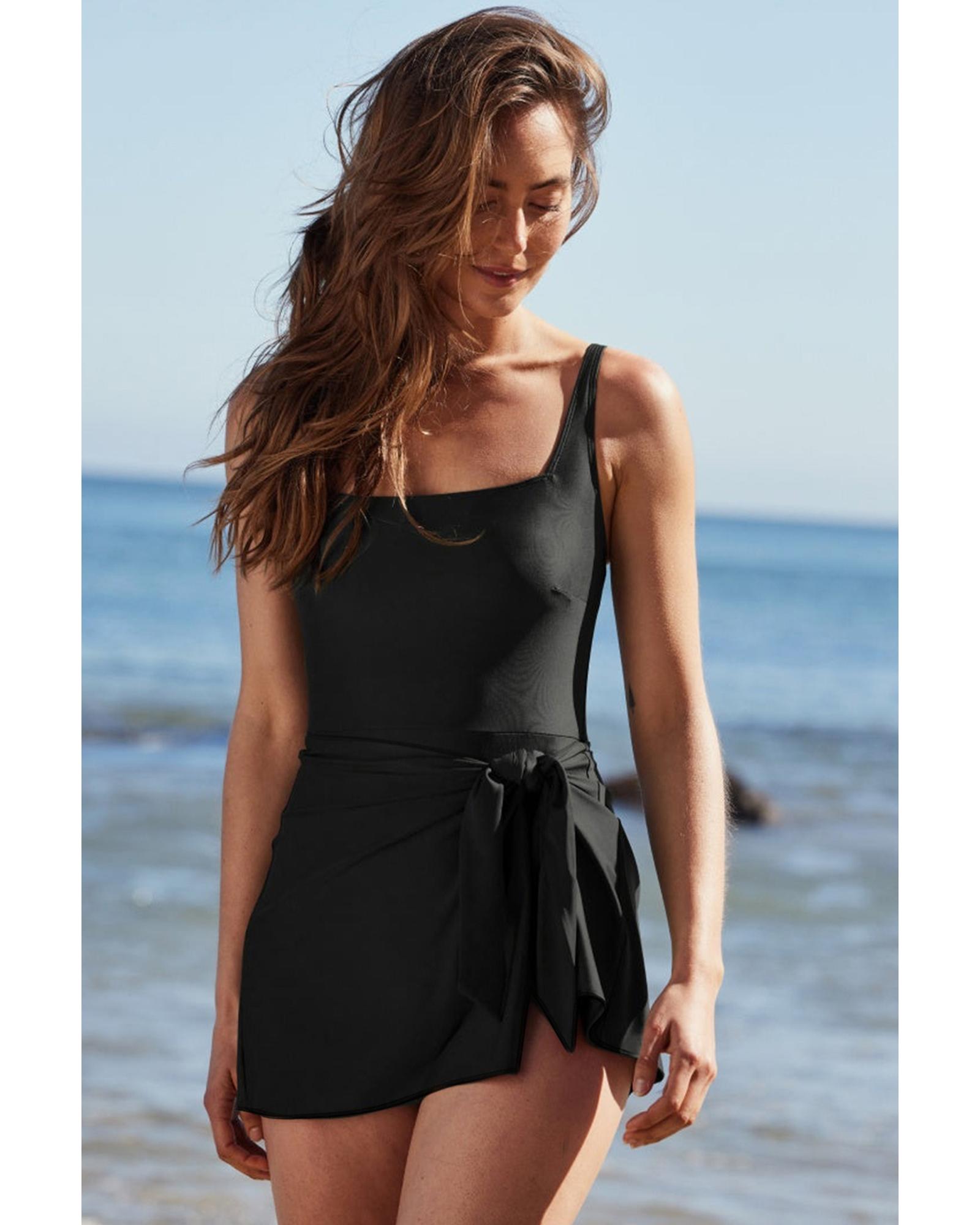- Solid black one piece swim dress