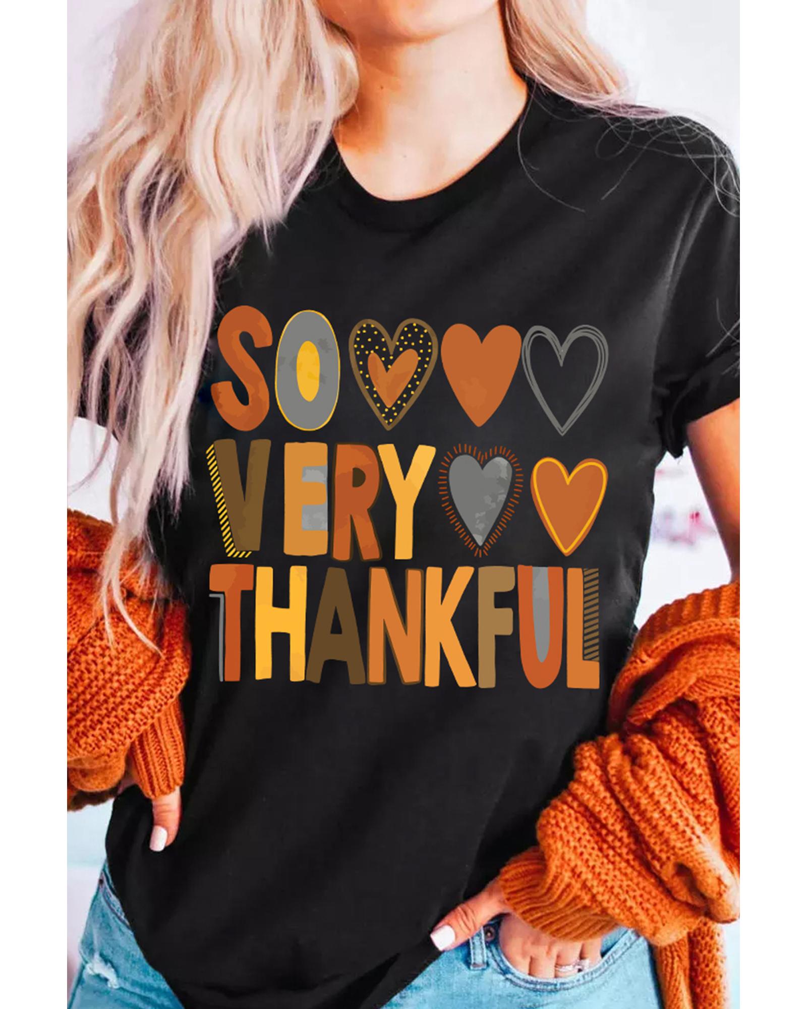 Black So Very Thankful Heart Printed Crewneck Thanksgiving T Shirt – 2XL