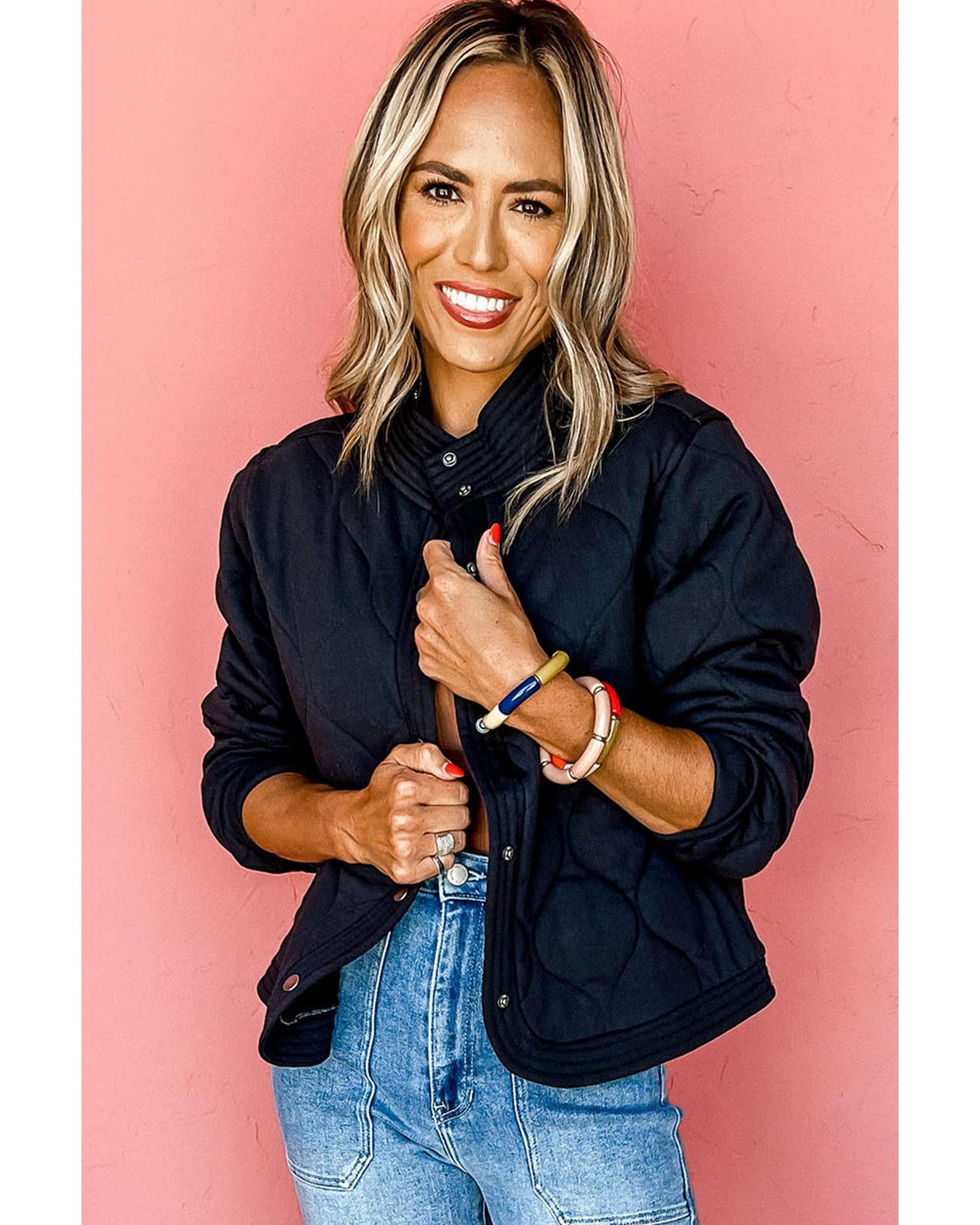 Black Solid Color Quilted Snap Button Jacket – L