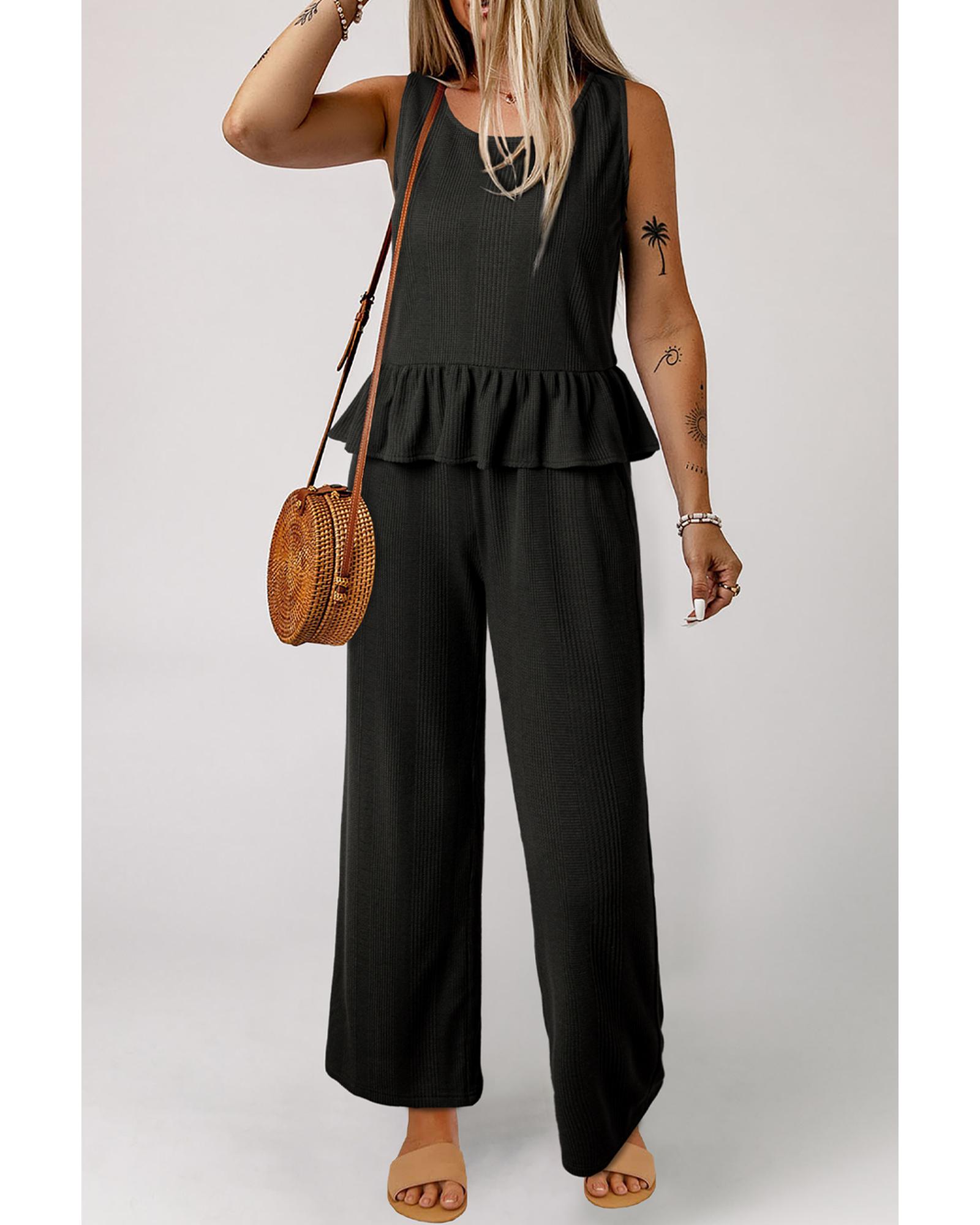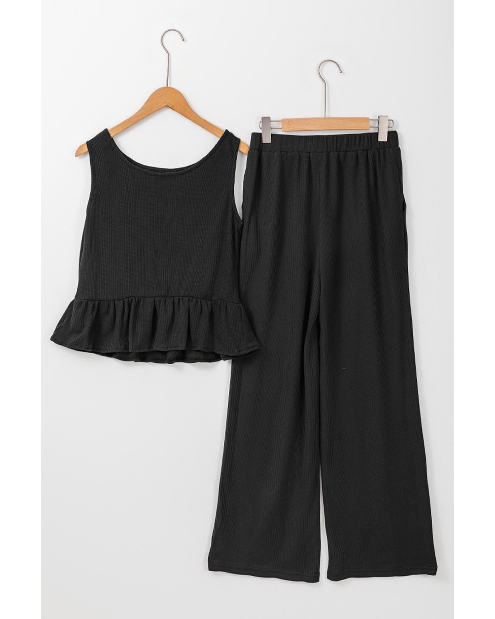 - Black Solid Color Ribbed Ruffle Tank Top and Pants Set