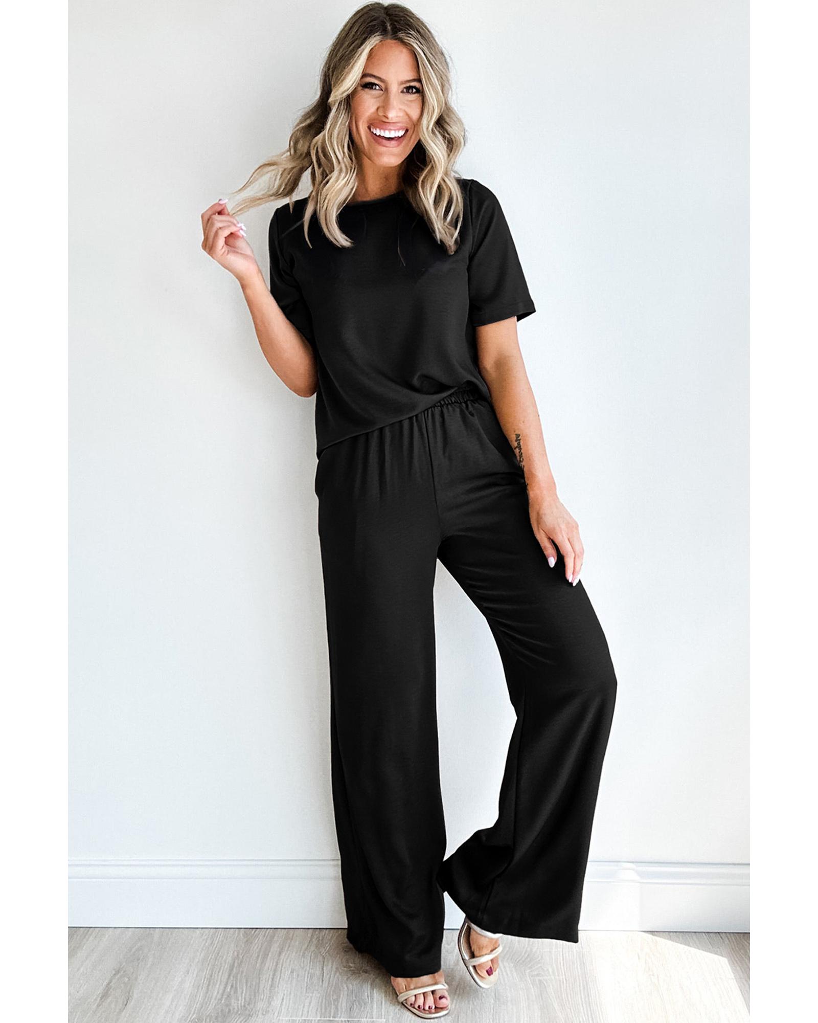 Black Solid Color T Shirt 2pcs Wide Leg Pants Set – M