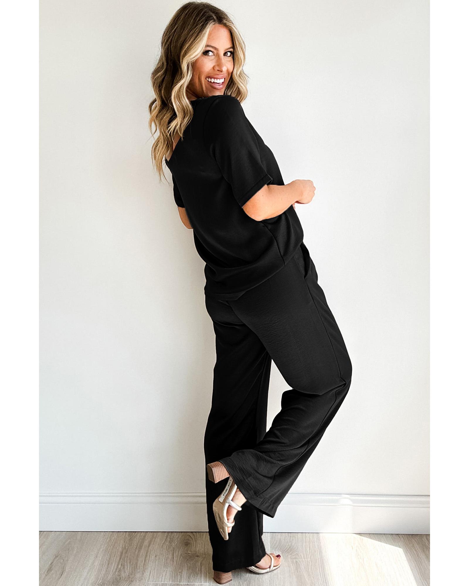 Black Solid Color T Shirt 2pcs Wide Leg Pants Set – S