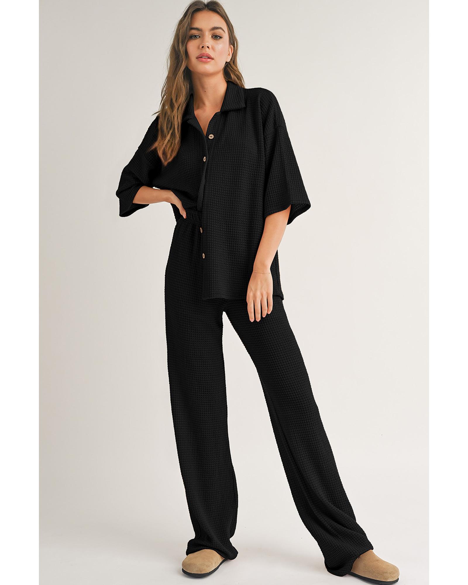 Black Solid Color Textured Buttoned Shirt and Casual Pants Set – M