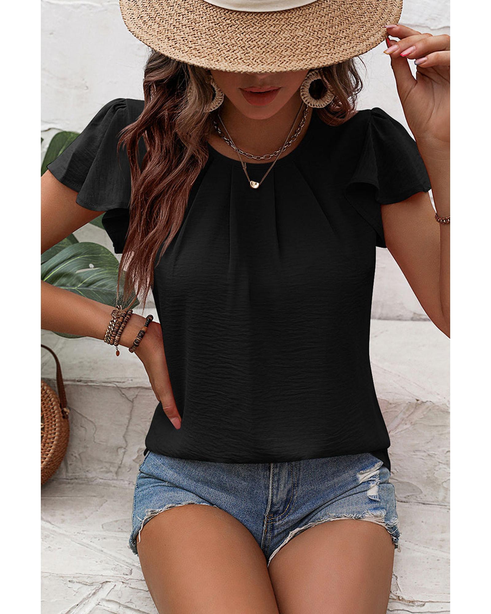 • Black Solid Color Textured Pleated Flutter Sleeve Blouse