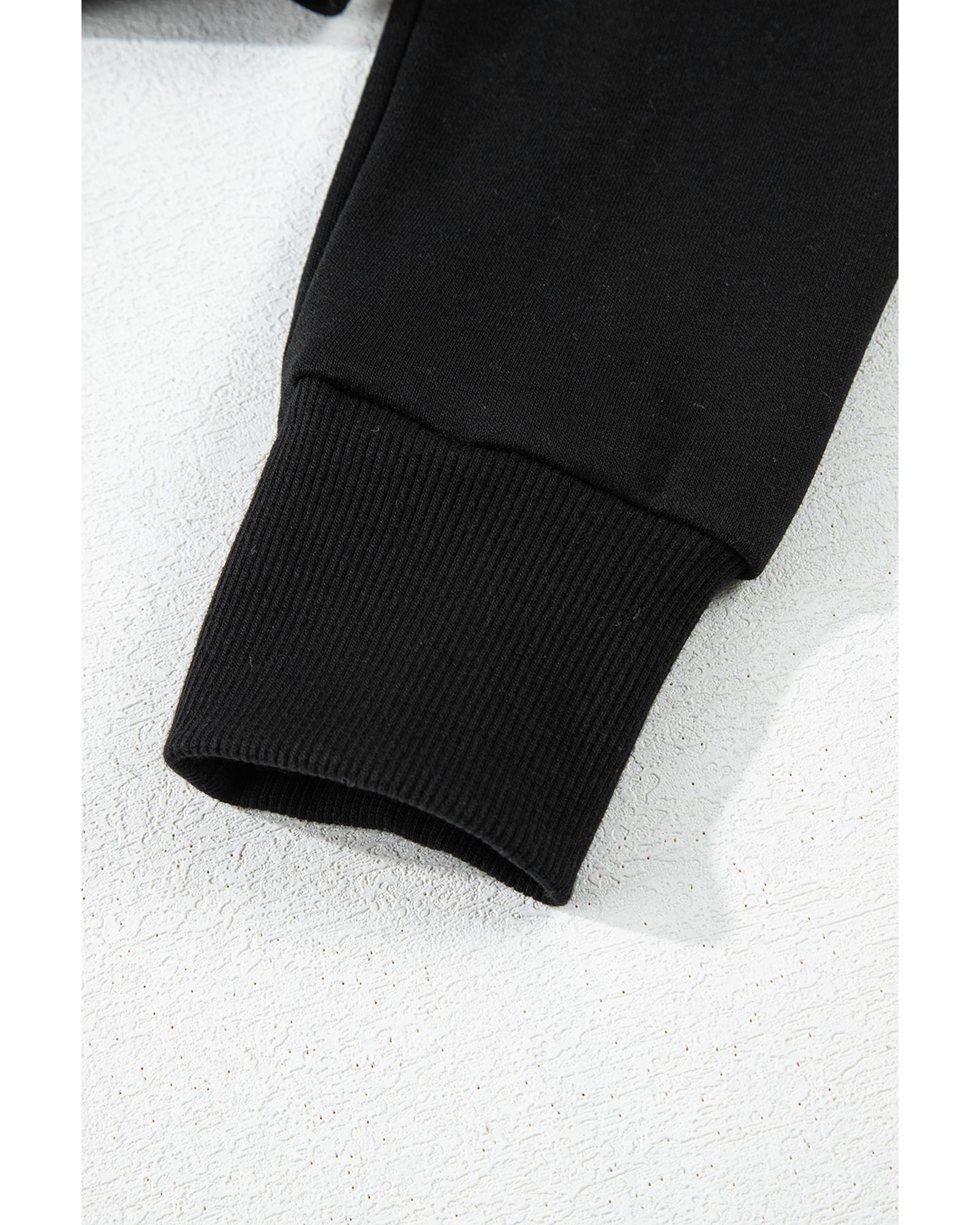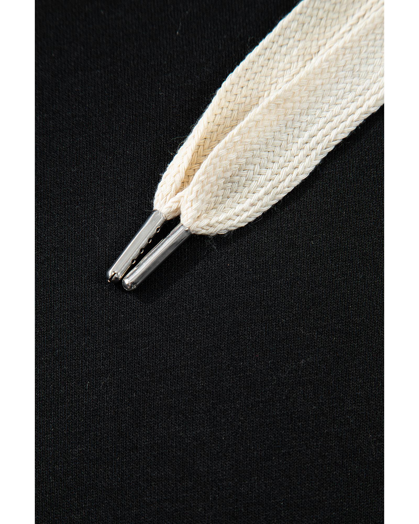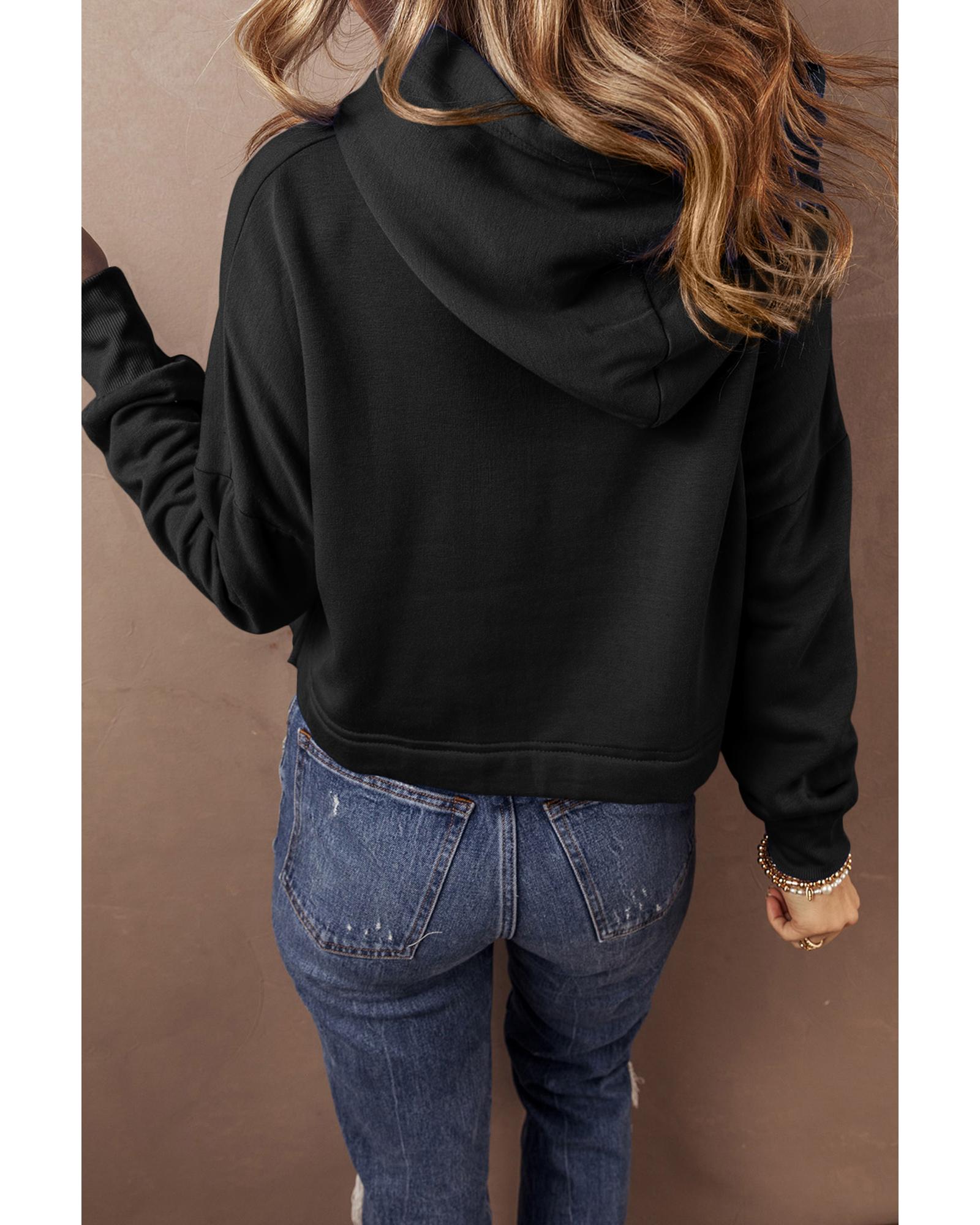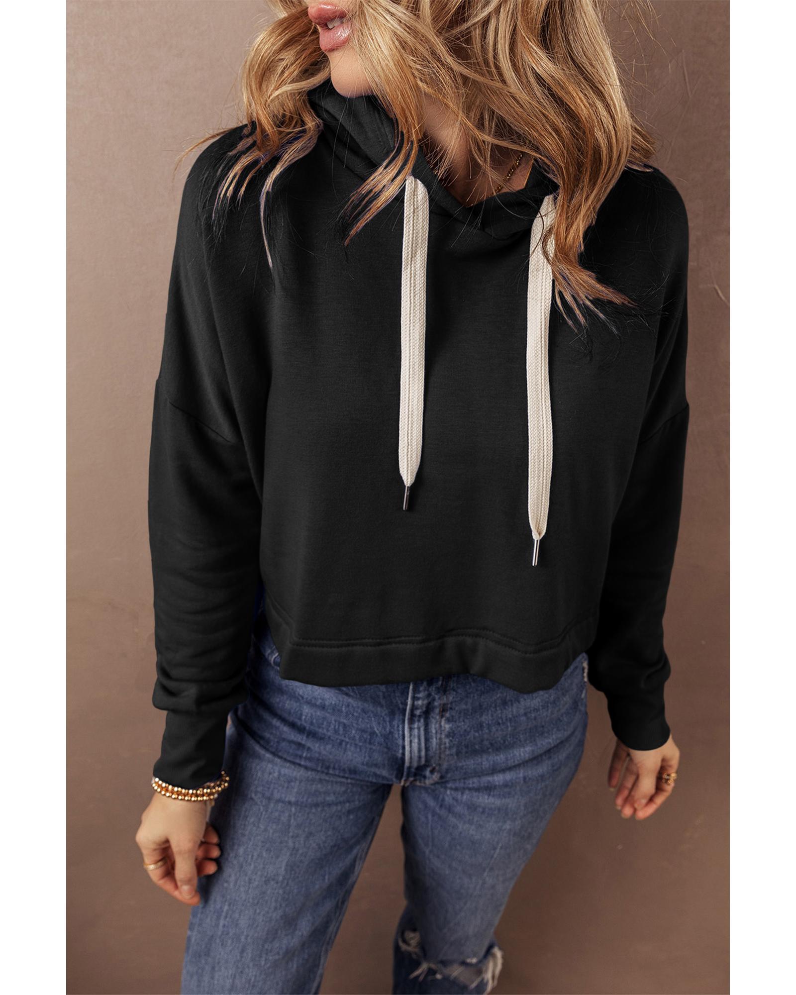 Black Solid Drop Shoulder Drawstring Cropped Hoodie – S