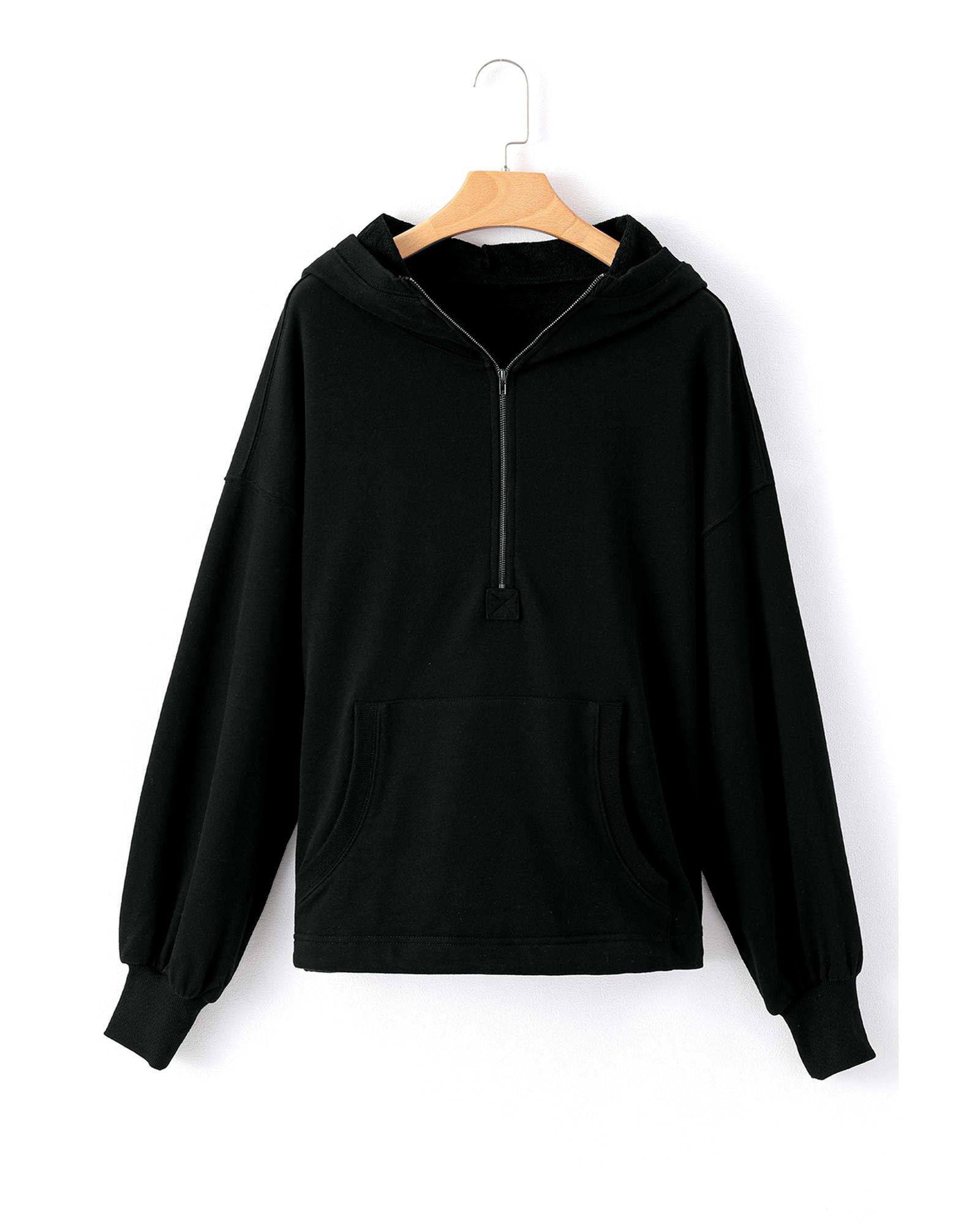 Black Solid Kangaroo Pocket Half Zipper Oversized Hoodie – M