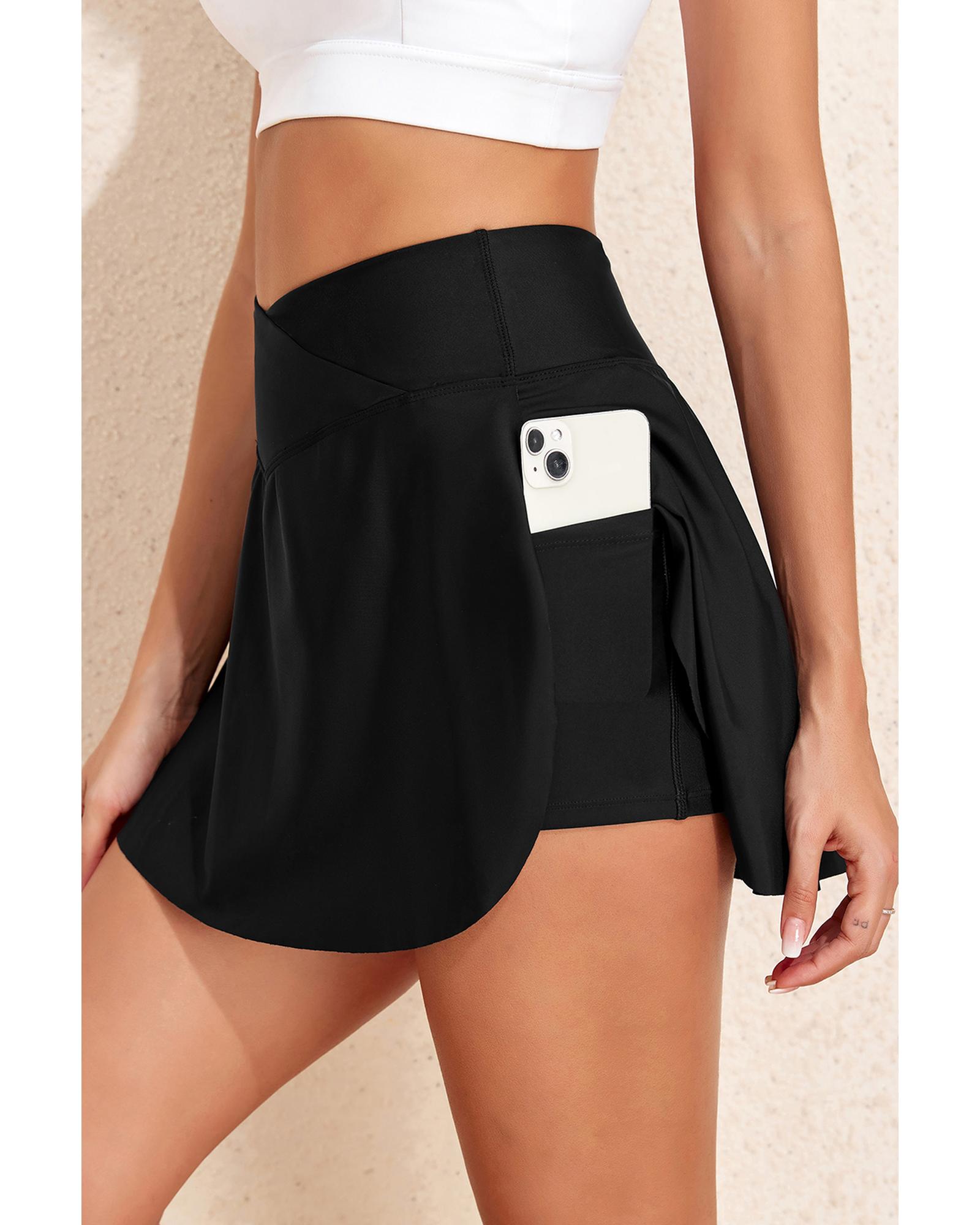 Black Solid Pocketed Crossover High Waist Swim Skort - XL