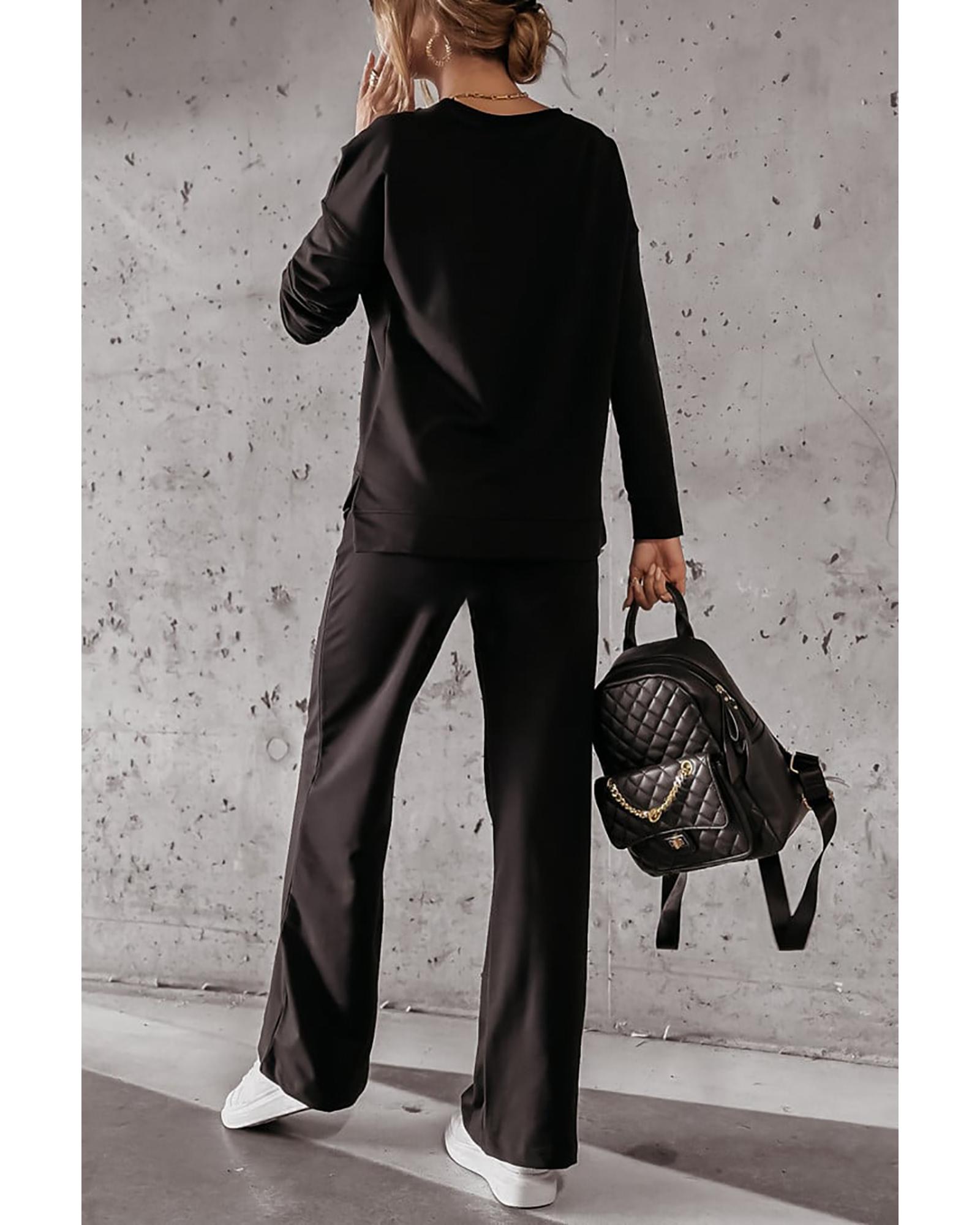 Black Solid Pullover and Seamed Casual Pants Set – S