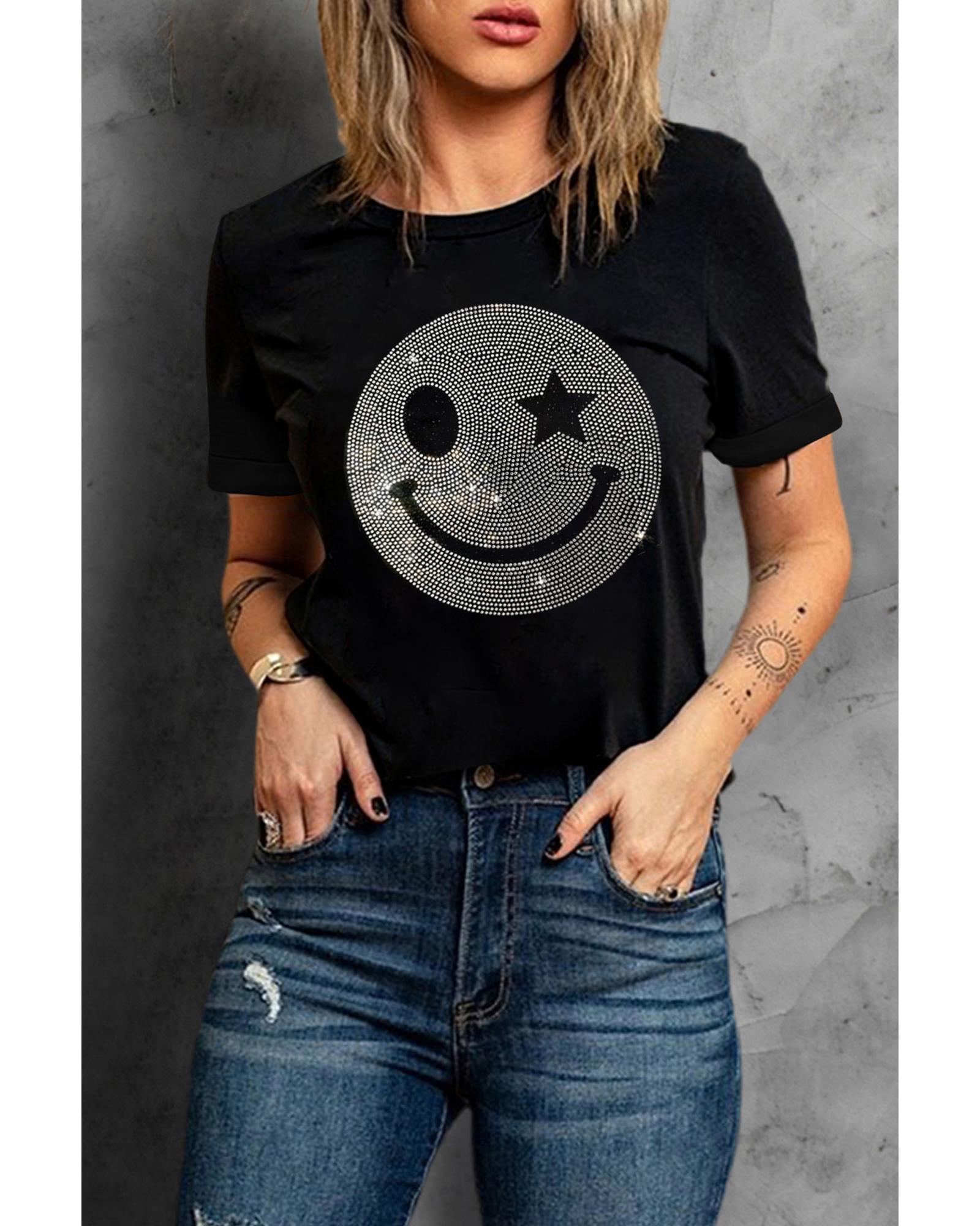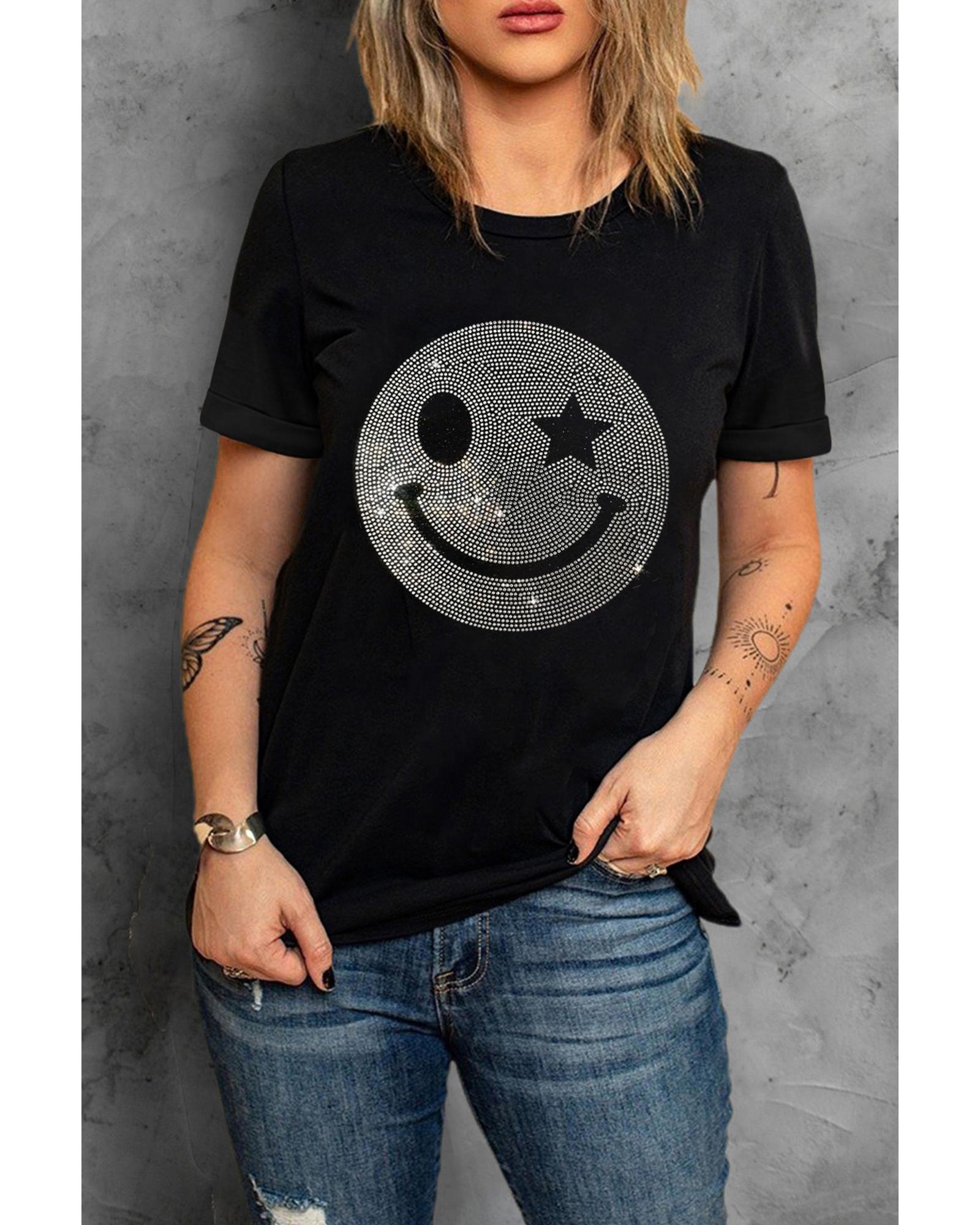 - Black Sparkle Rhinestone Smile Face Graphic T Shirt