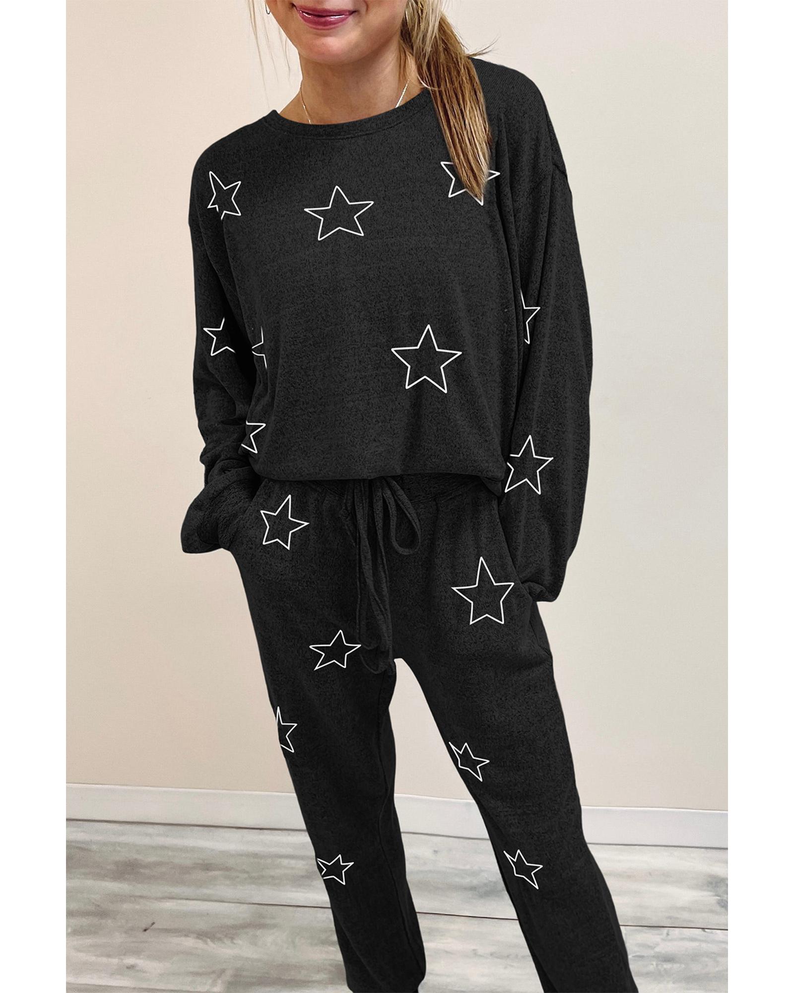 Black Stars Print Long Sleeve Drawstring High Waist Lounge Set – L