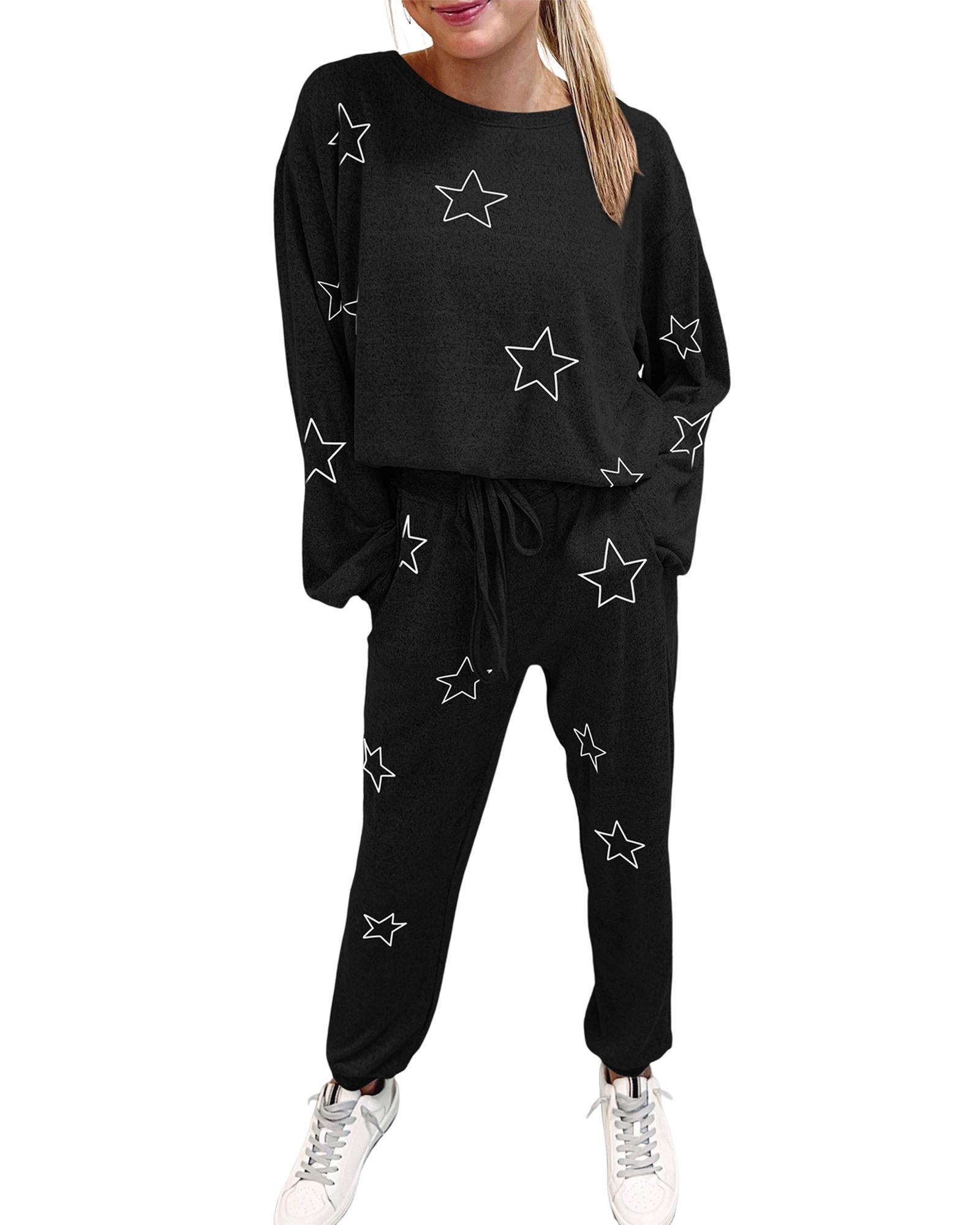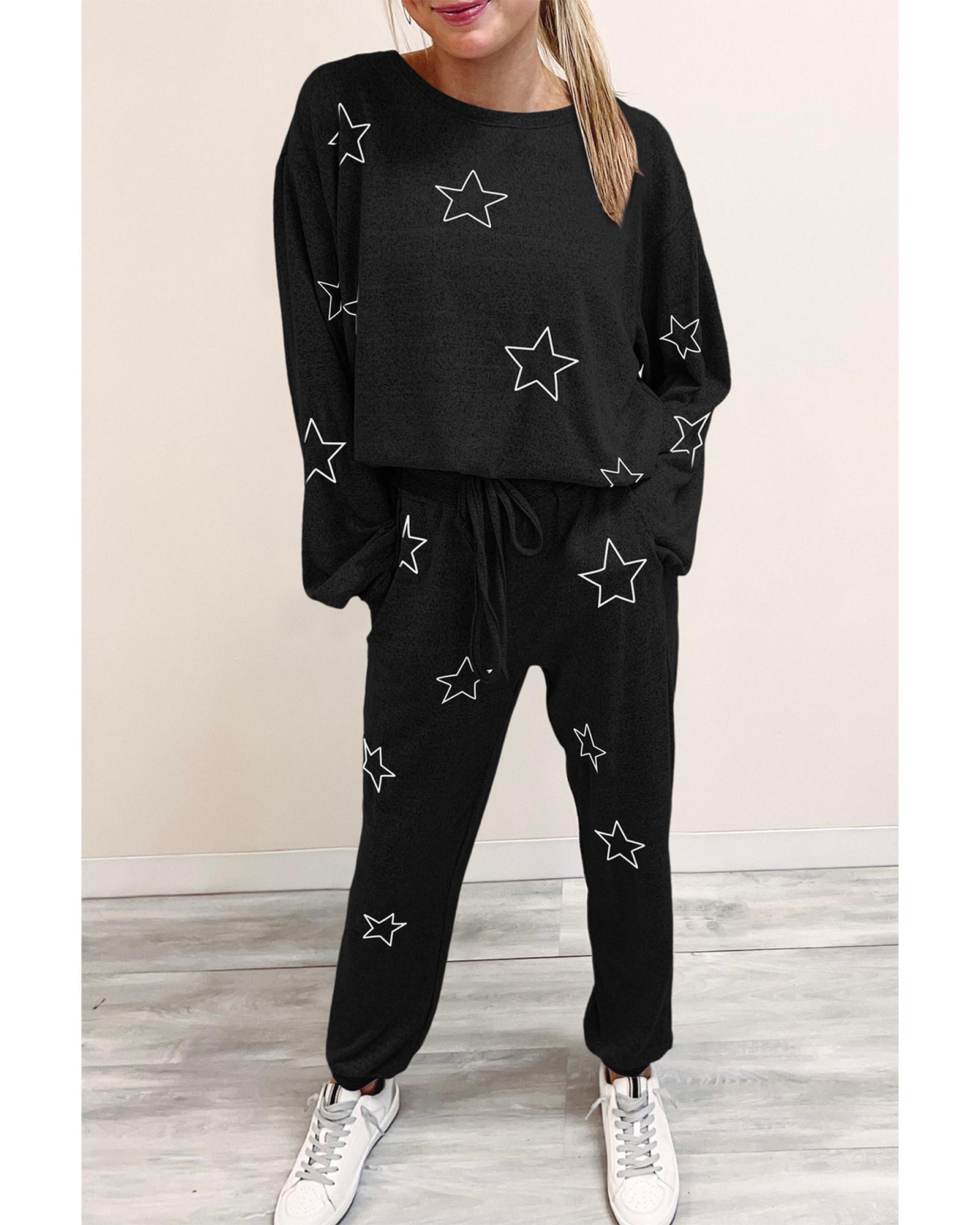 Black Stars Print Long Sleeve Drawstring High Waist Lounge Set – M