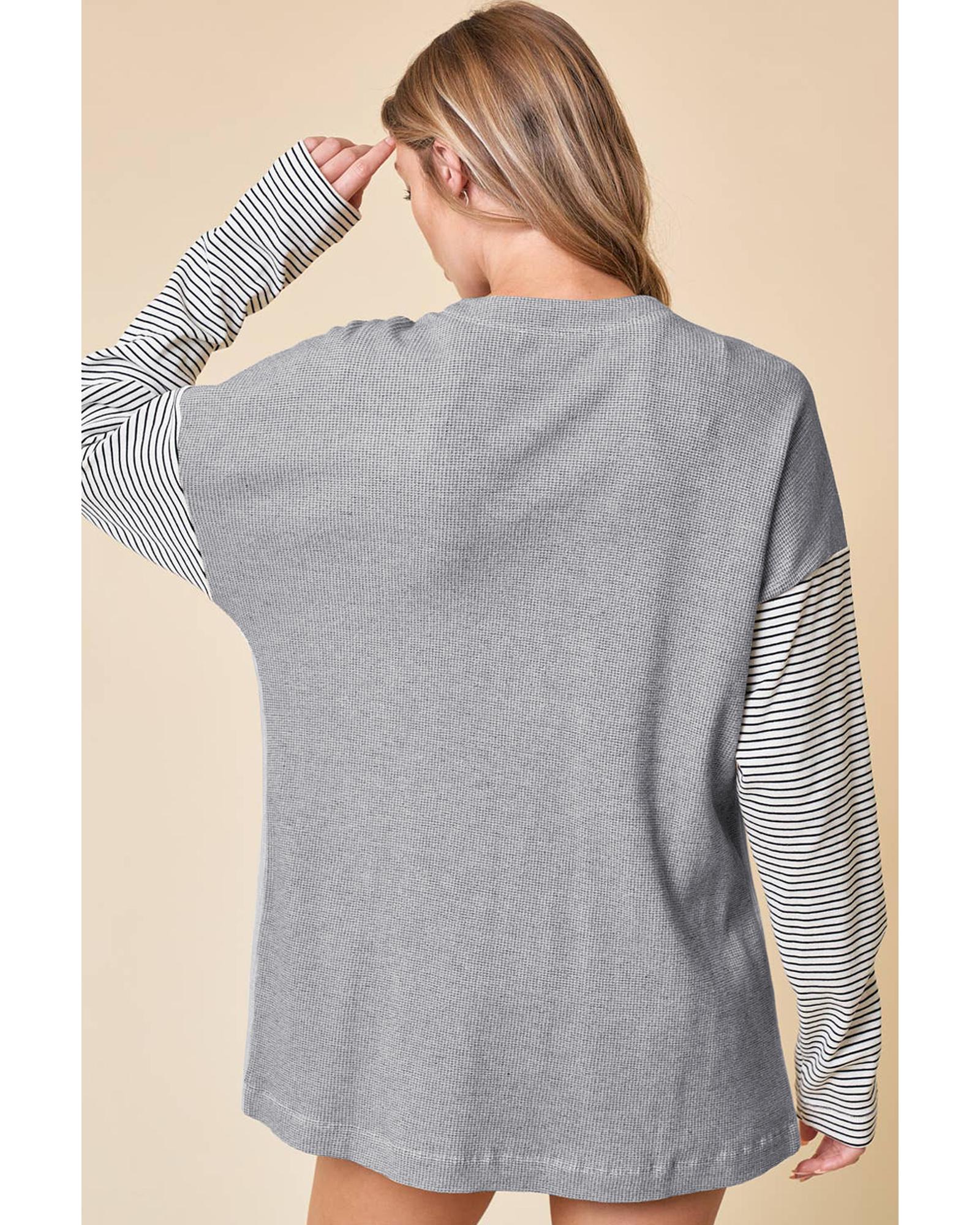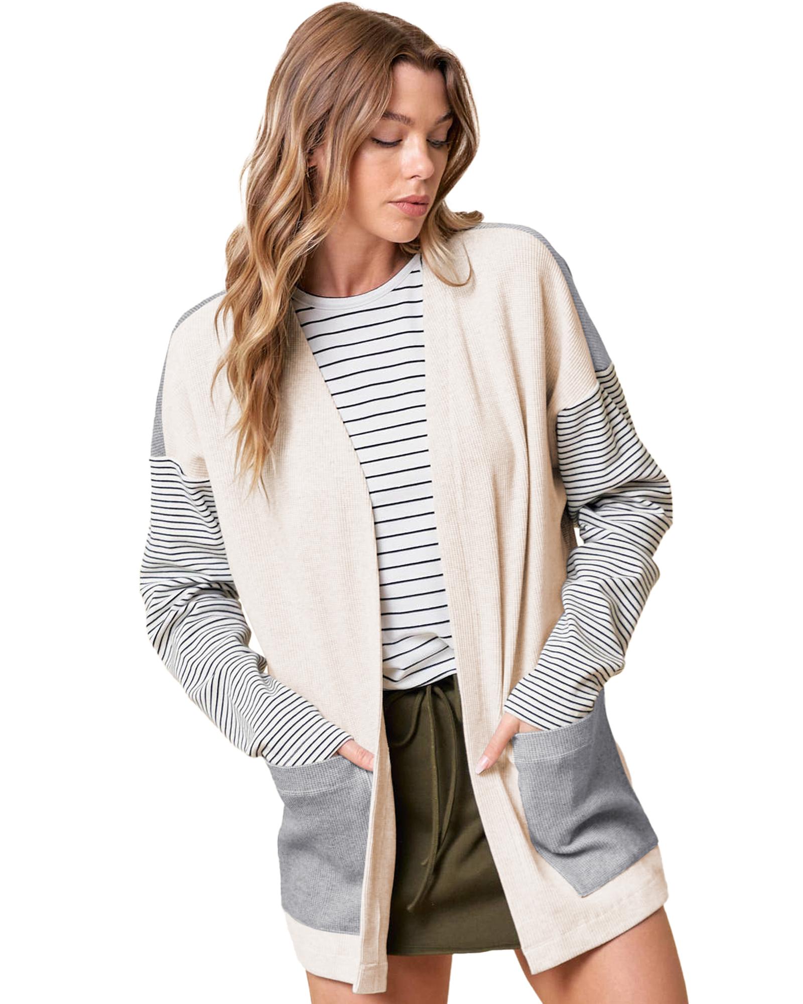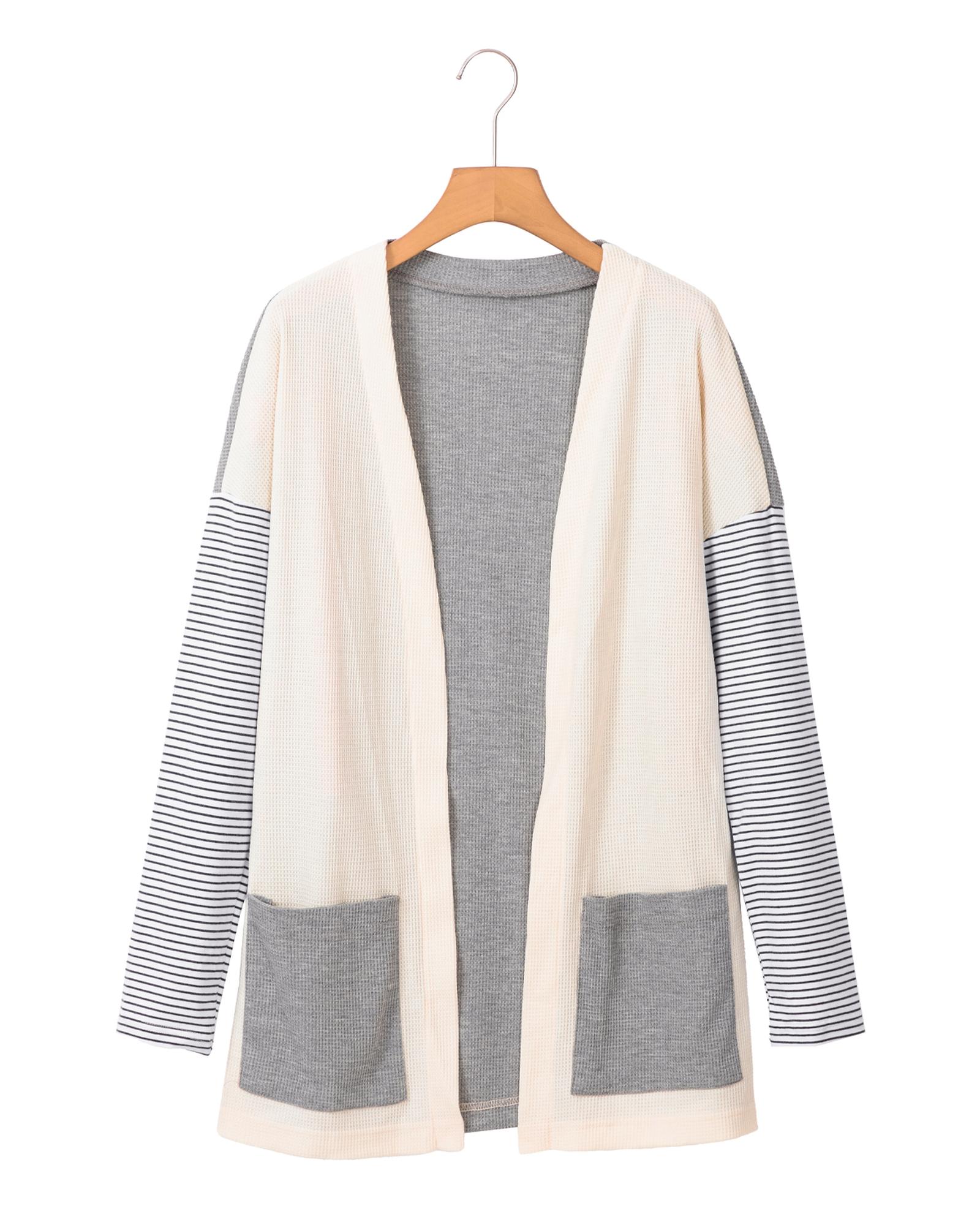 Black Stripe Colorblock Patchwork Open Front Cardigan with Pocket – L