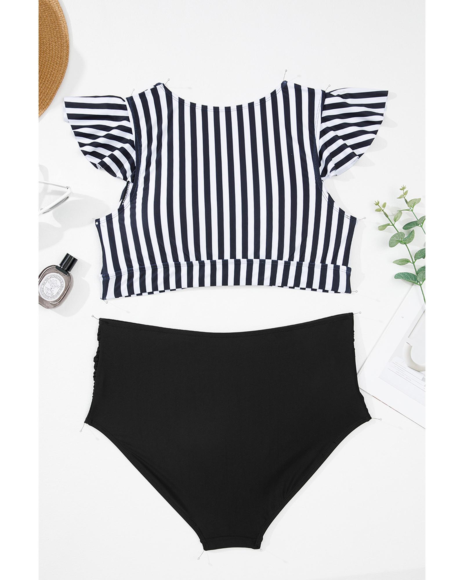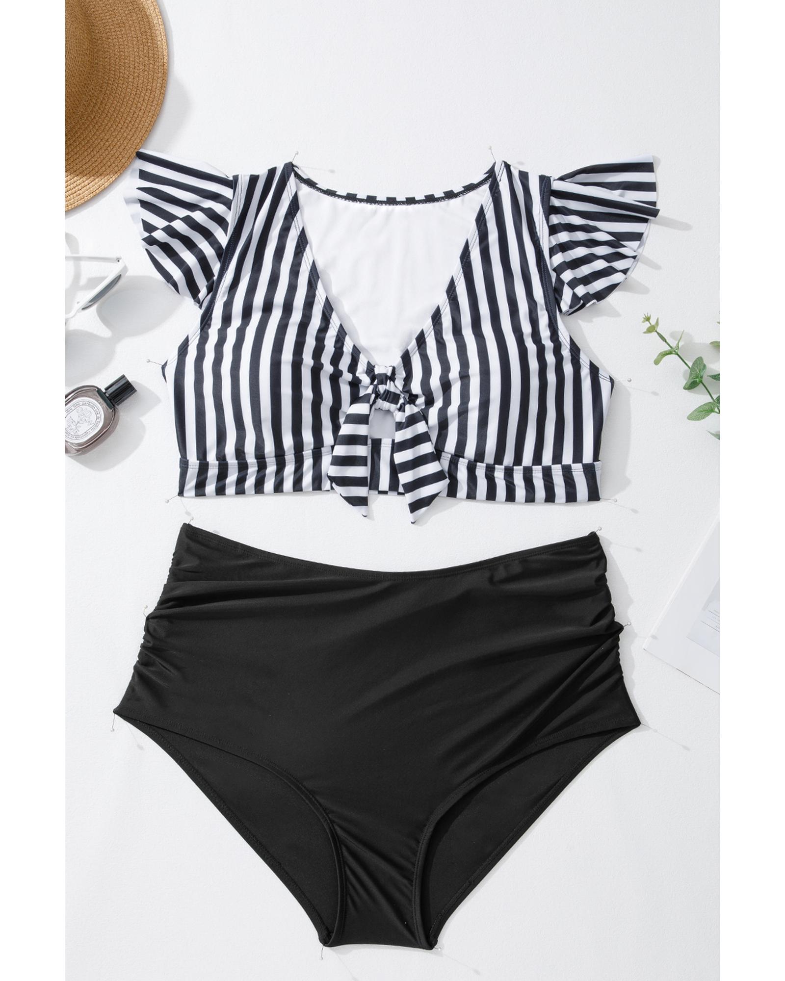 Black Stripe Plus Size Knot Cutout Ruffle Sleeve and High Waisted 2pcs Swimsuit – 4X