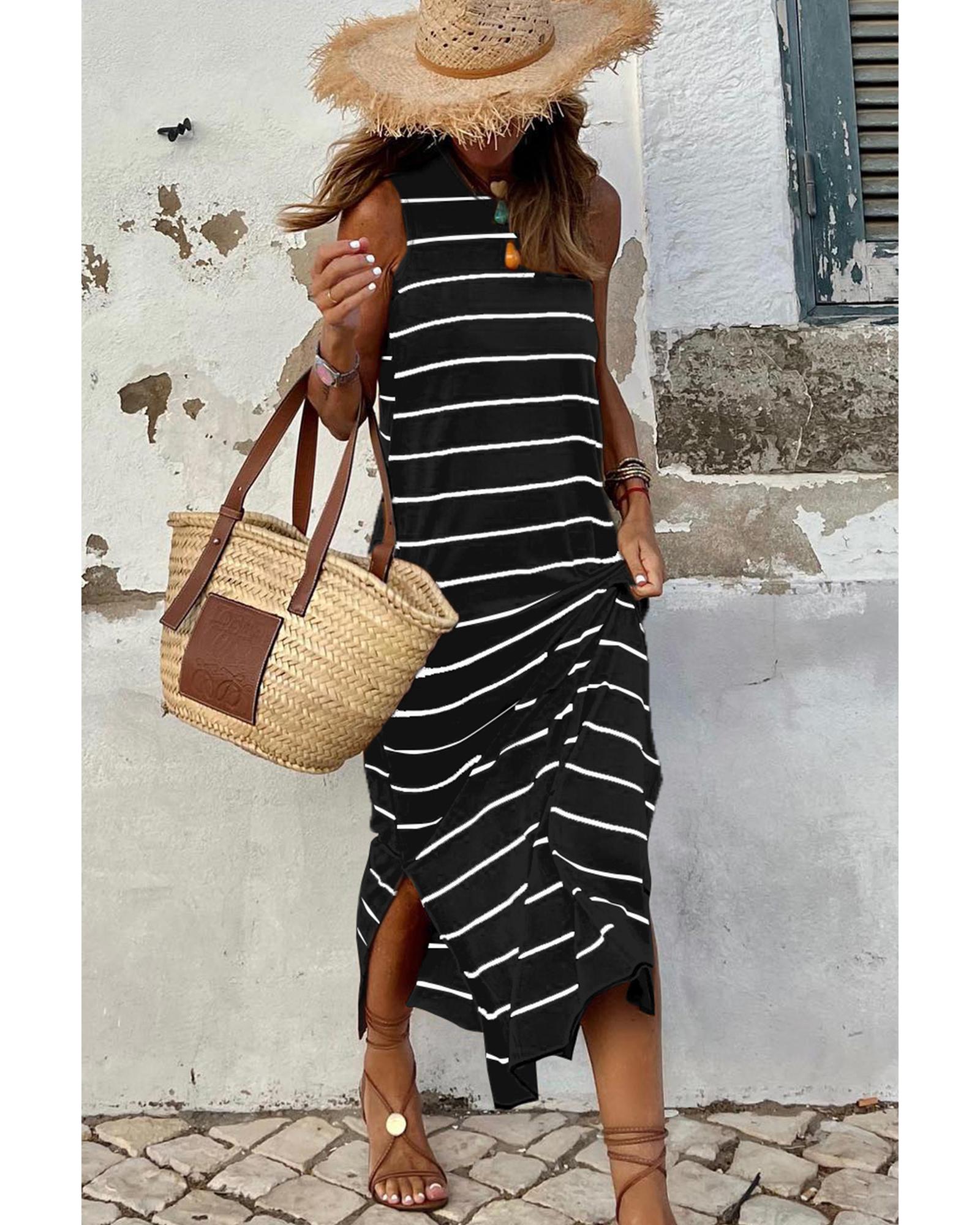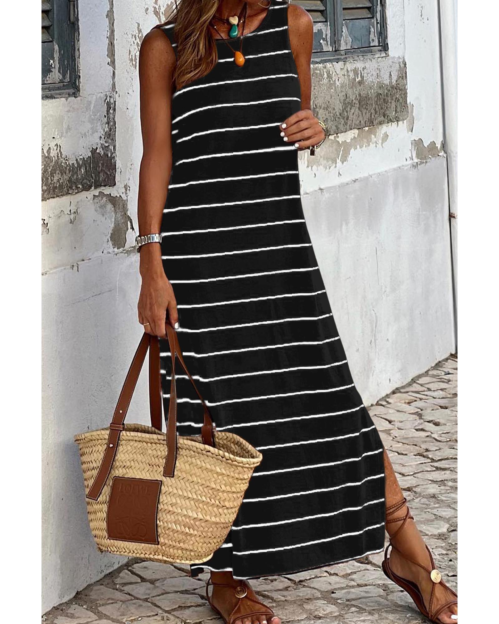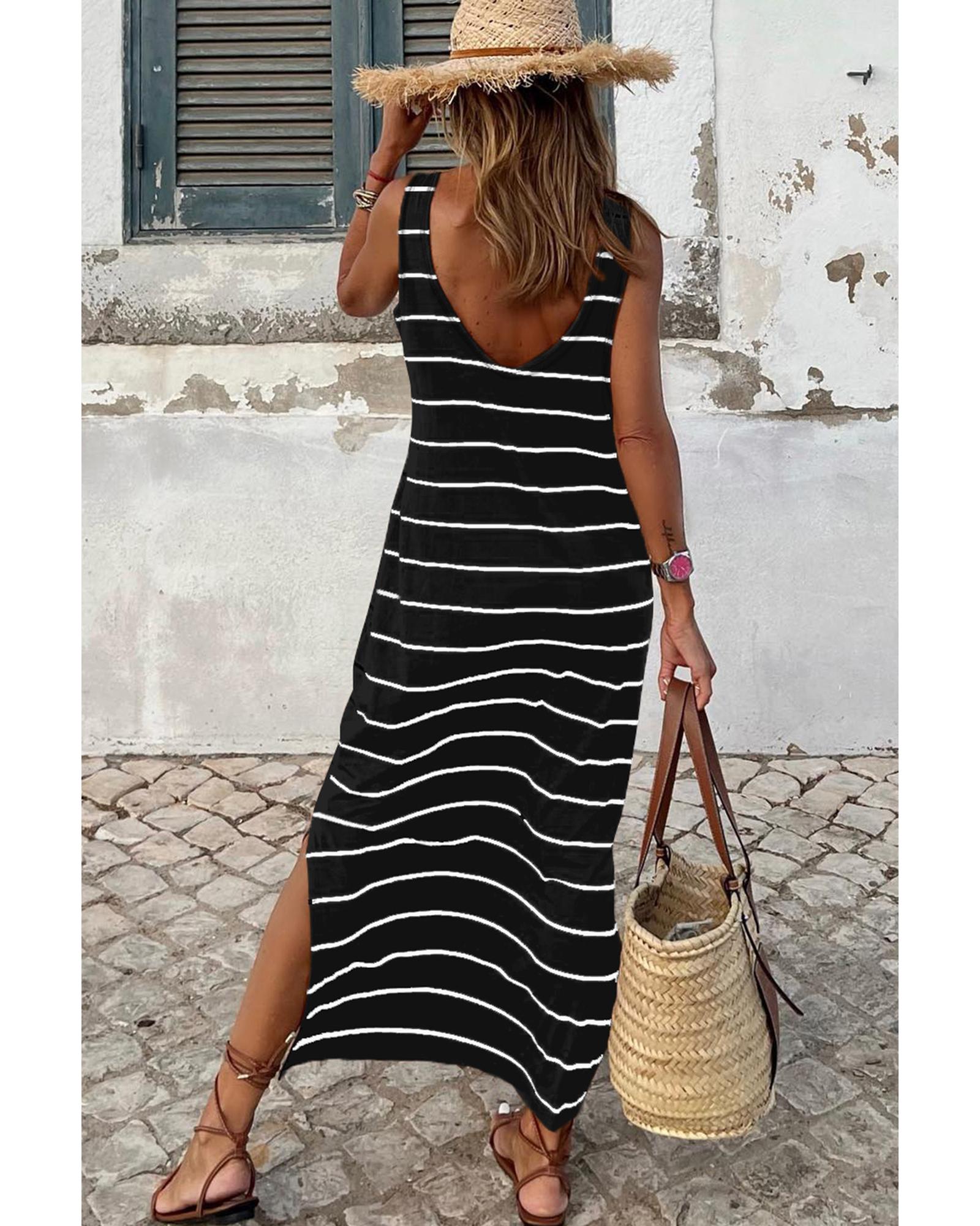 Black Stripe Print Open Back Sleeveless Maxi Dress with Slits – M