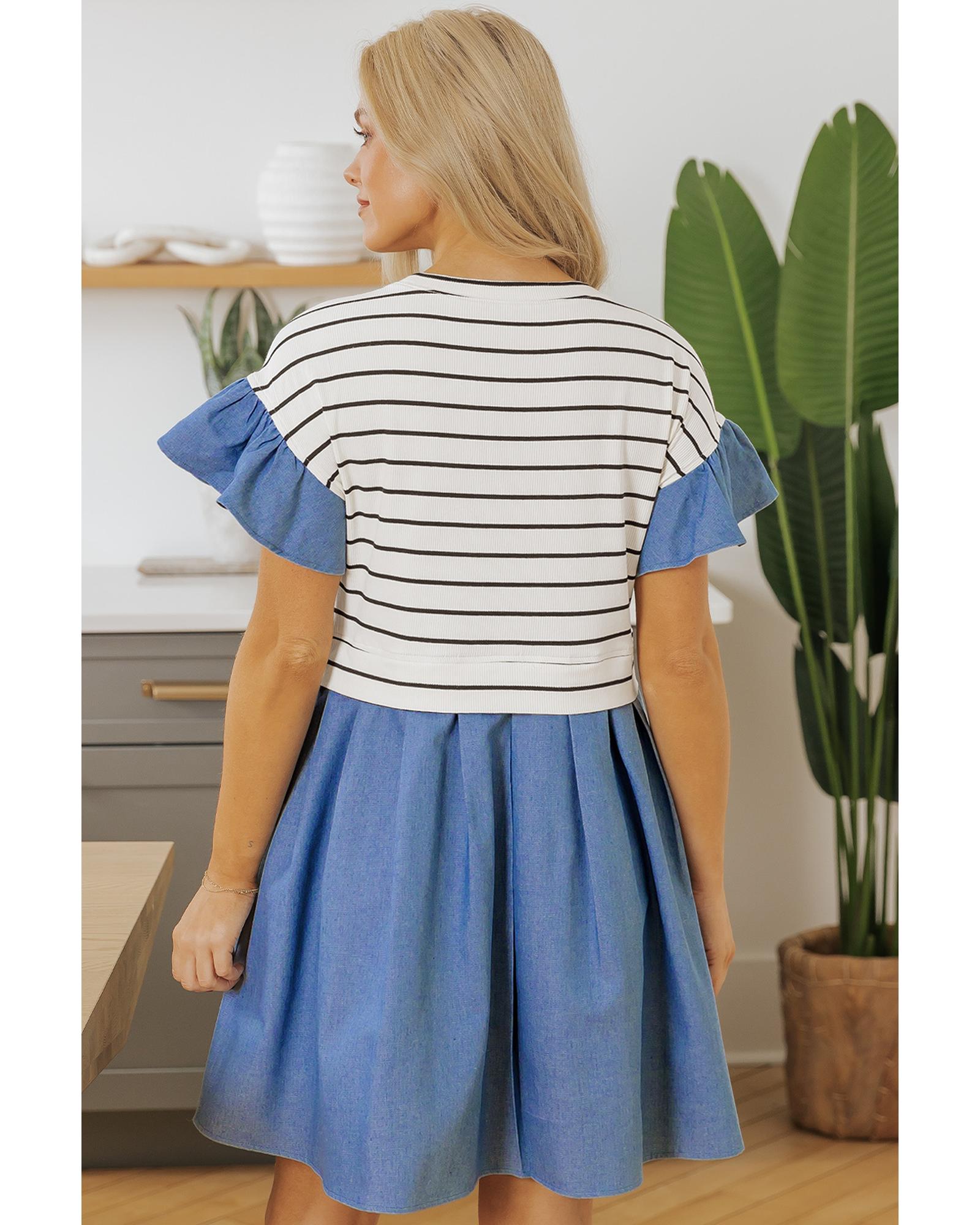 Black Stripe Ruffle Denim Patchwork Round Neck Mini Dress – XL