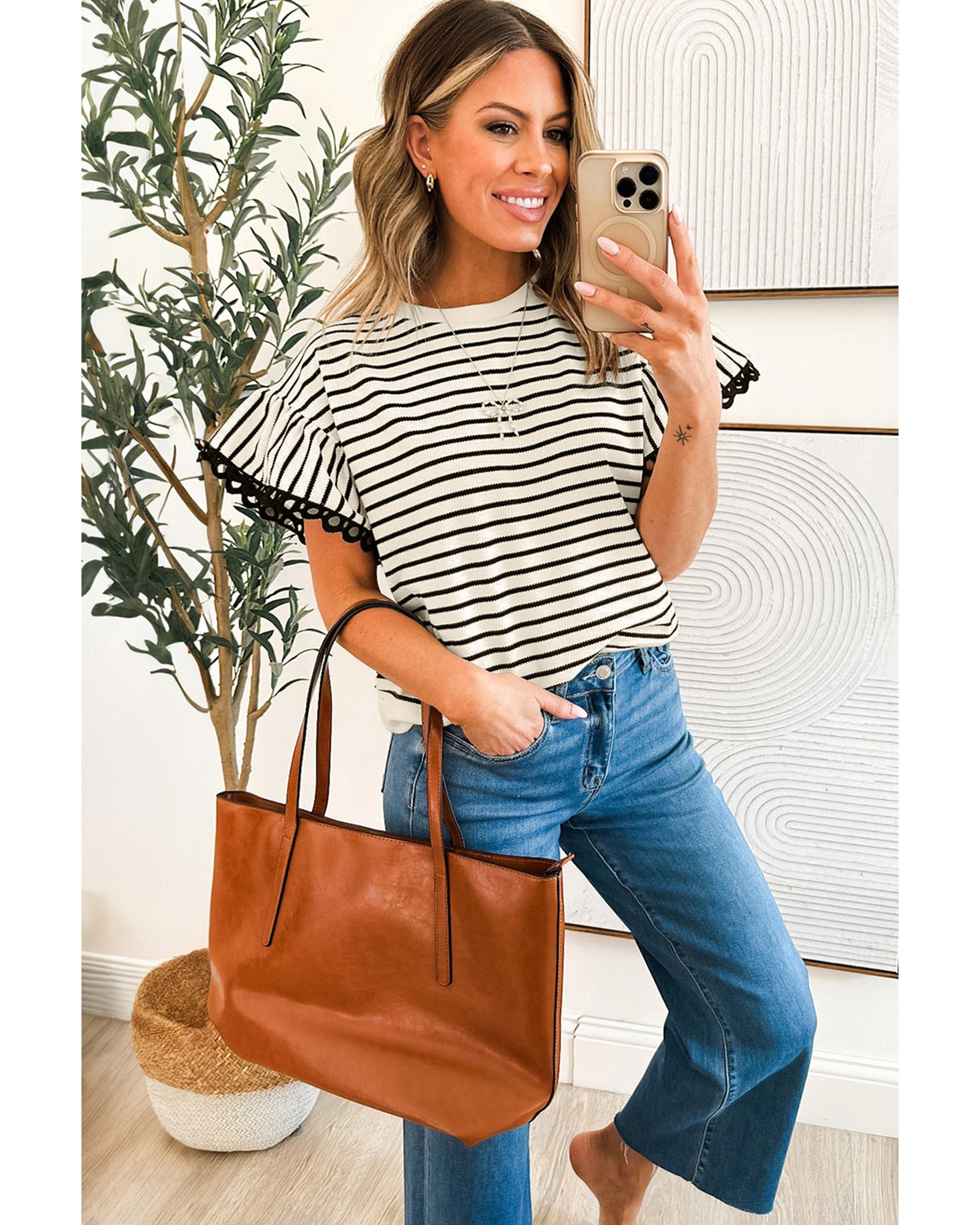 Black Stripe Scallop Lace Trim Ruffle Short Sleeves Crewneck Top – S