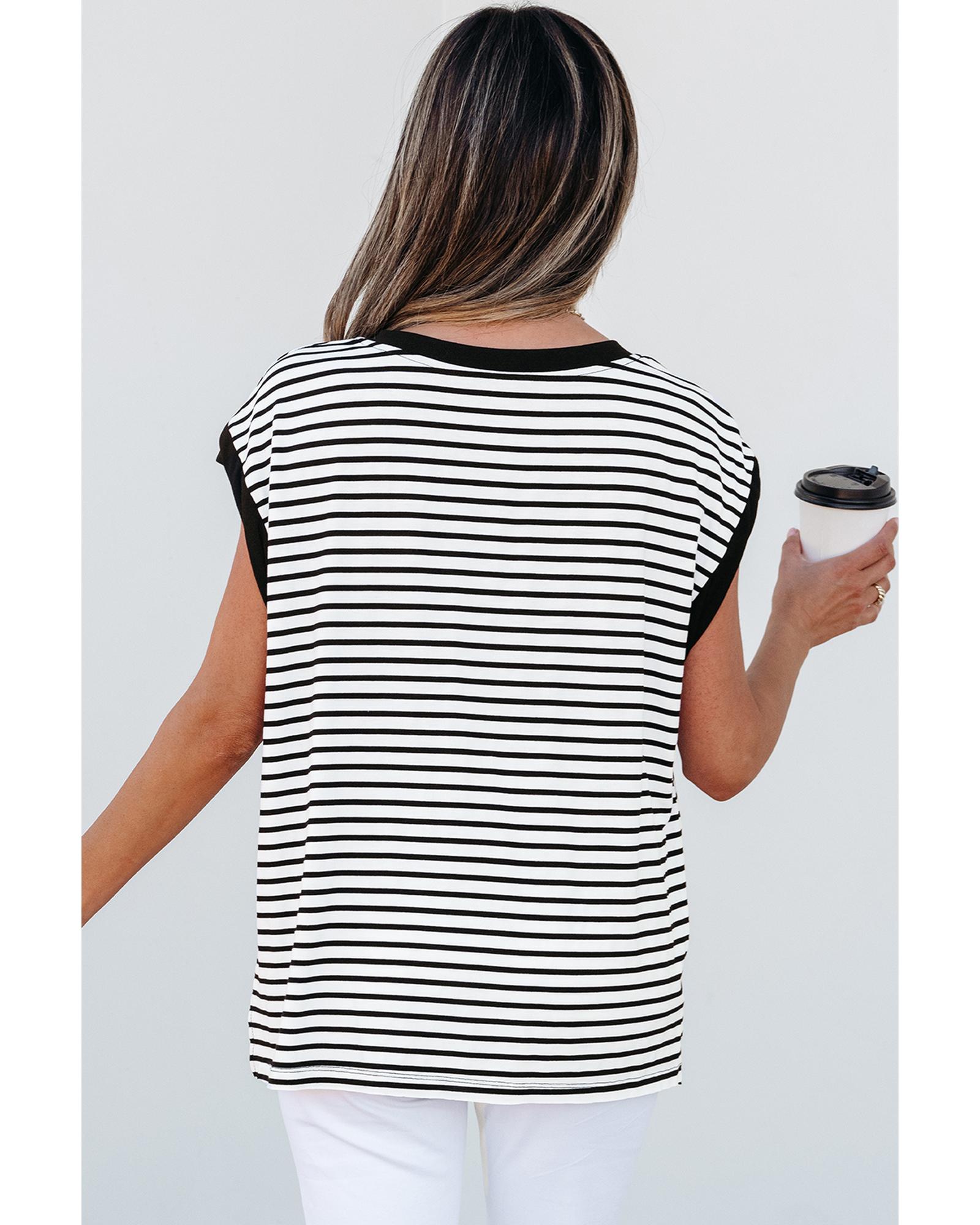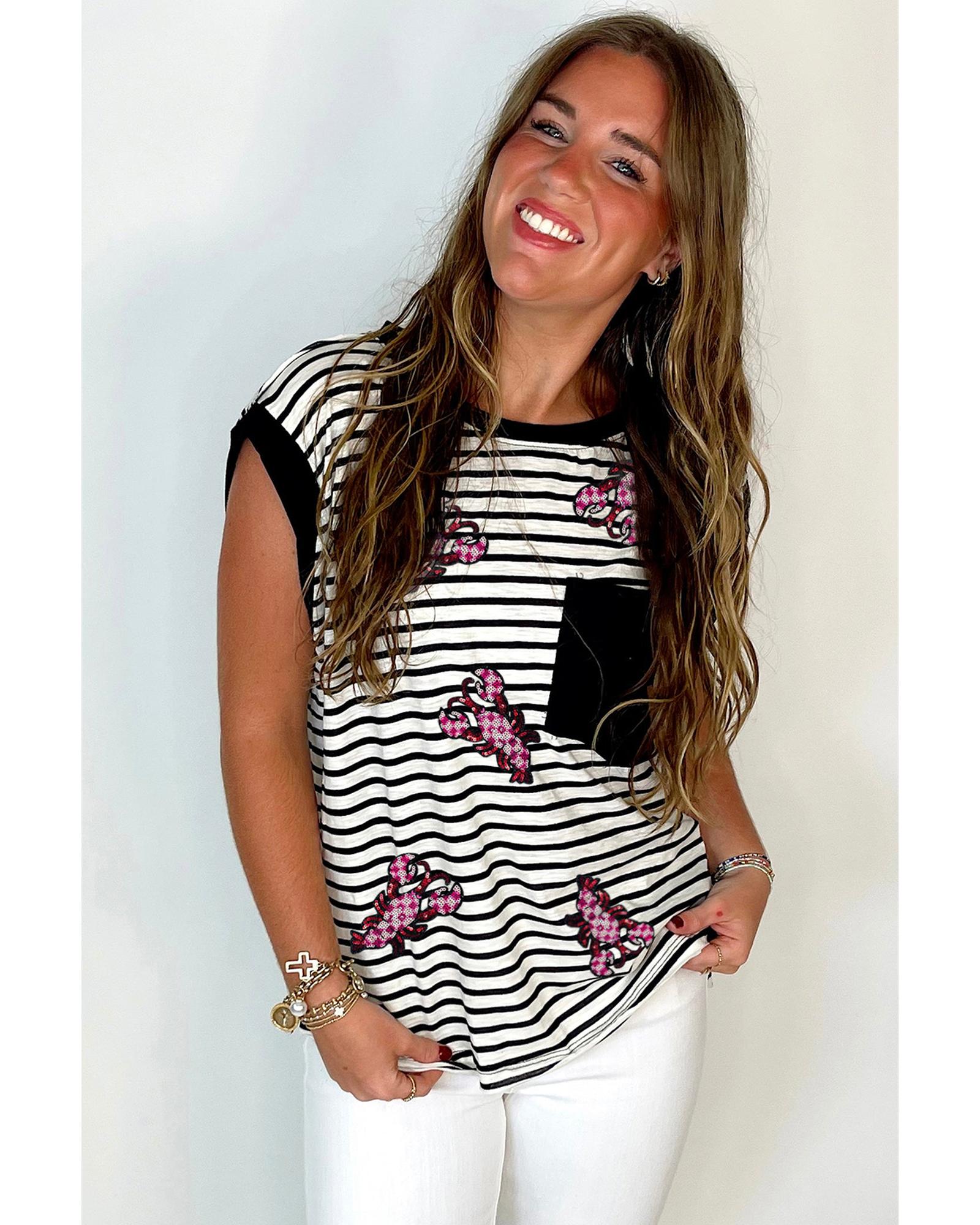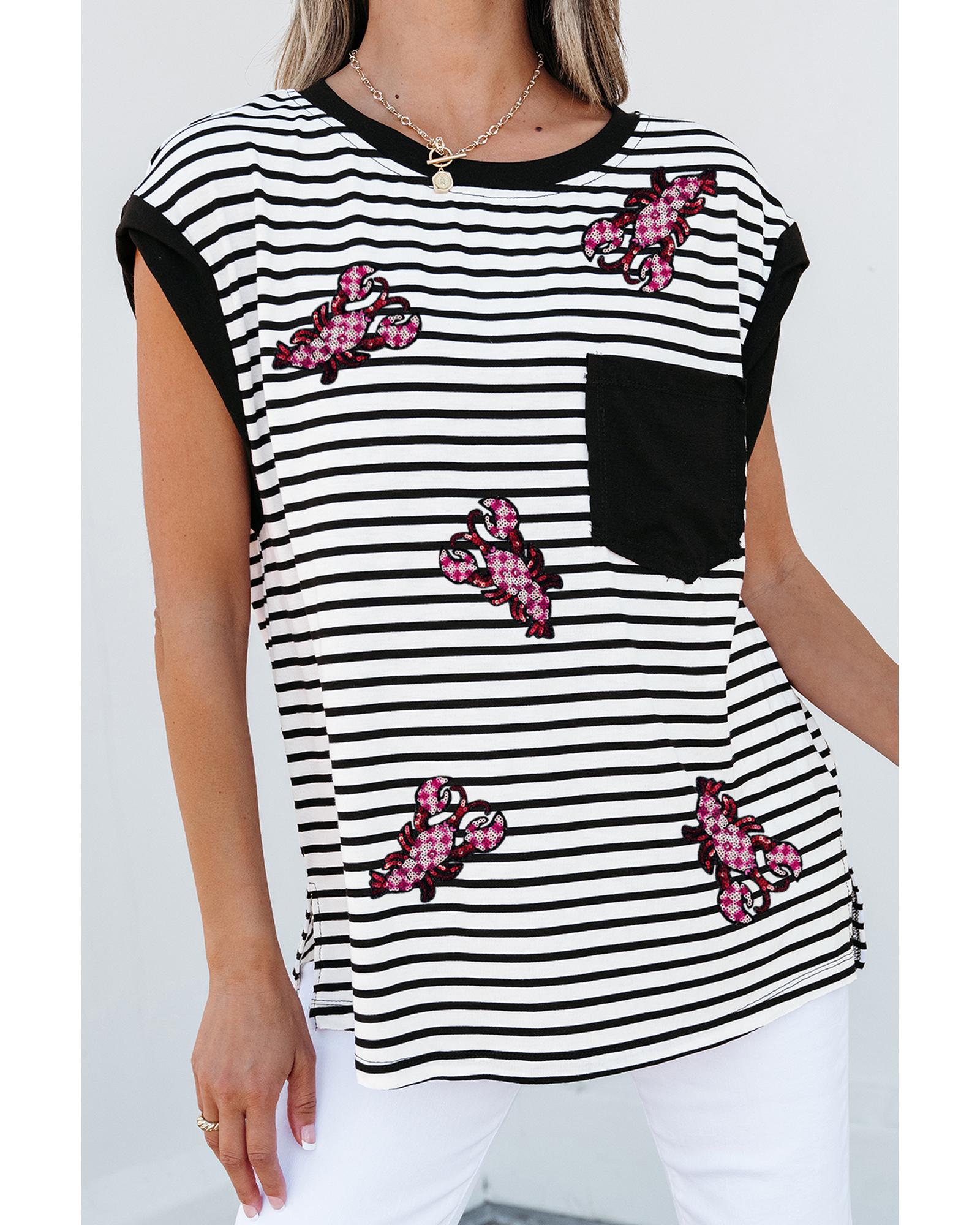 Black Stripe Sequined Lobster Patched Pocket Casual Tank Top – L