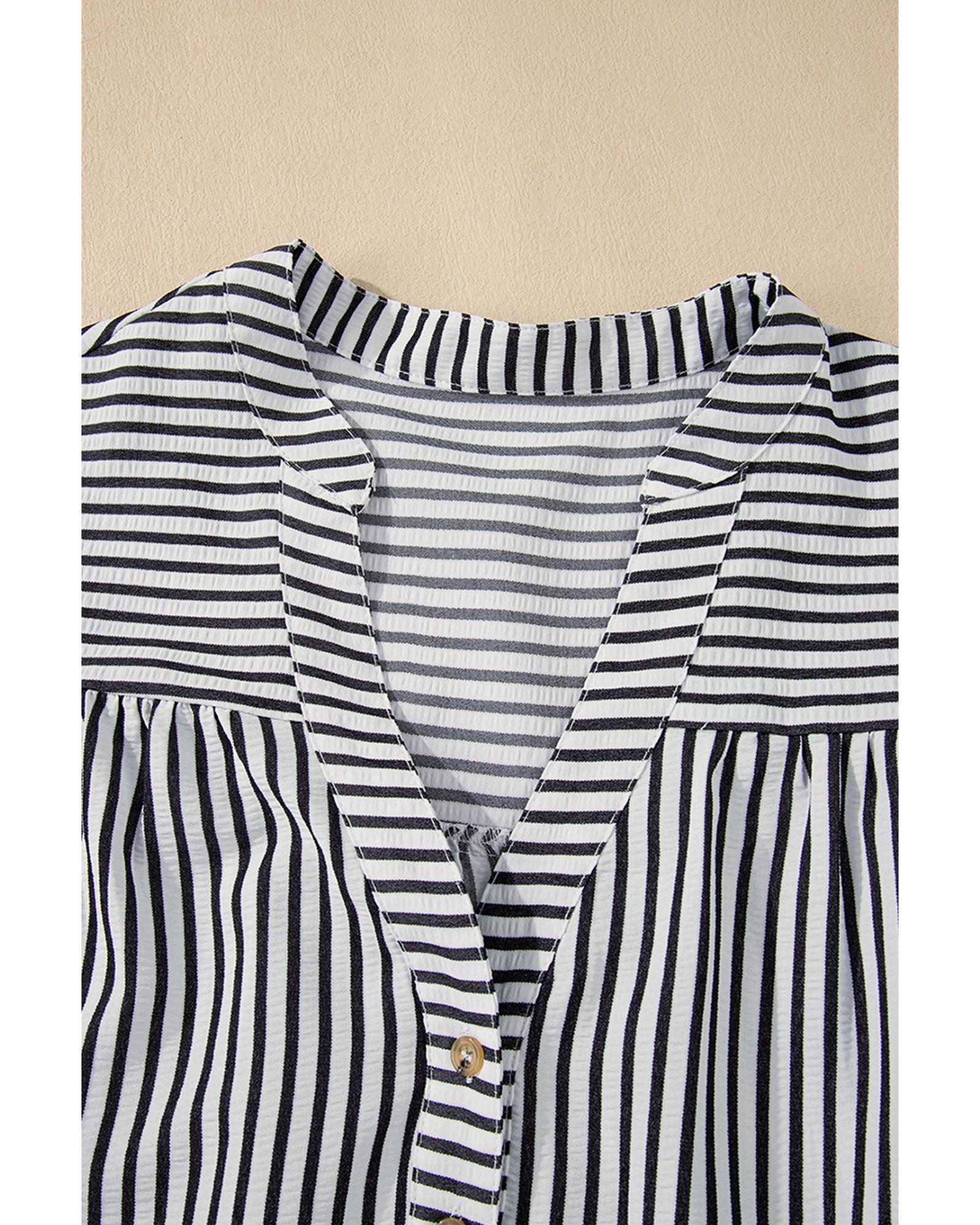 Black Stripe Short Sleeve Buttoned V Neck Pocketed Plus Size Mini Dress – 3X