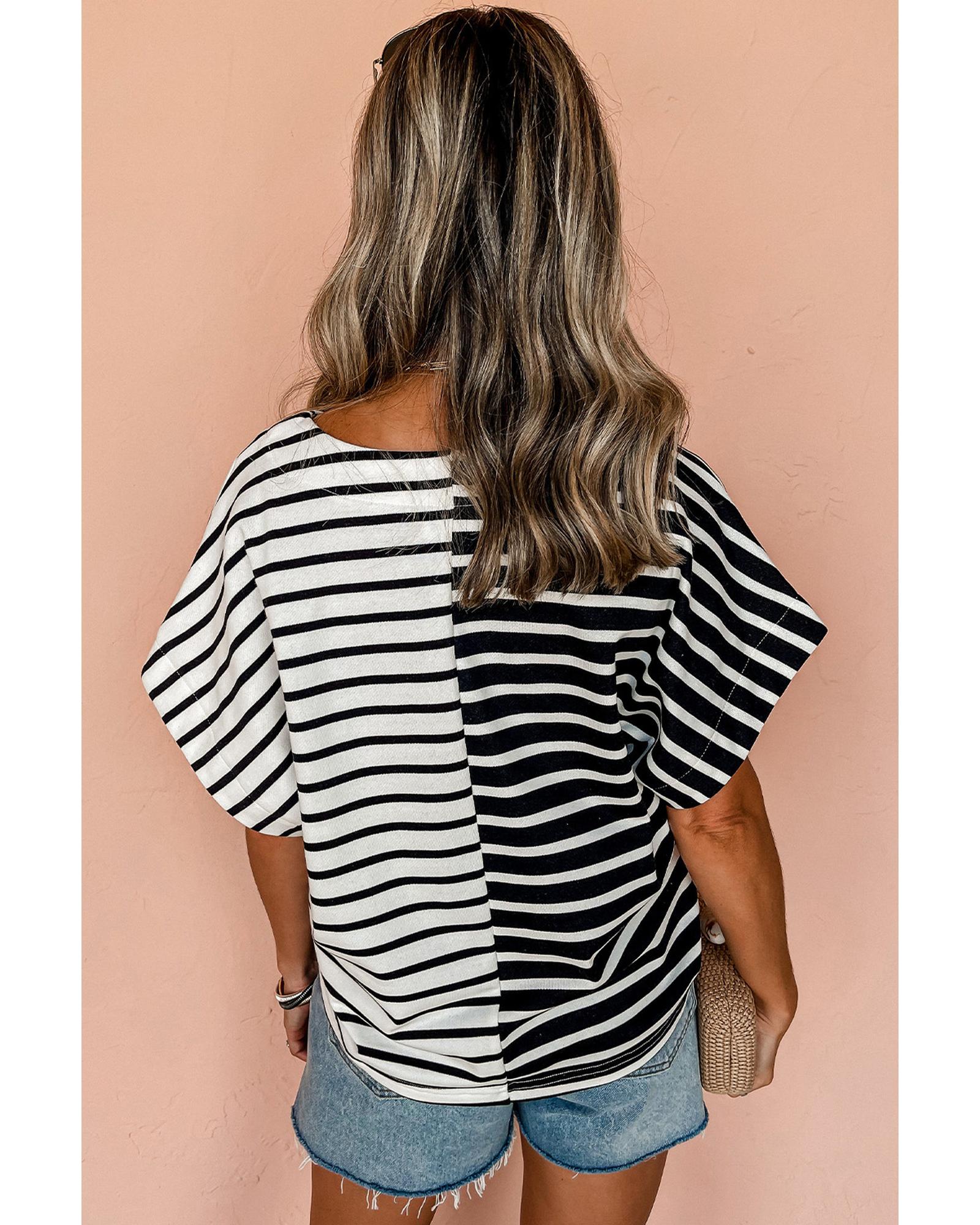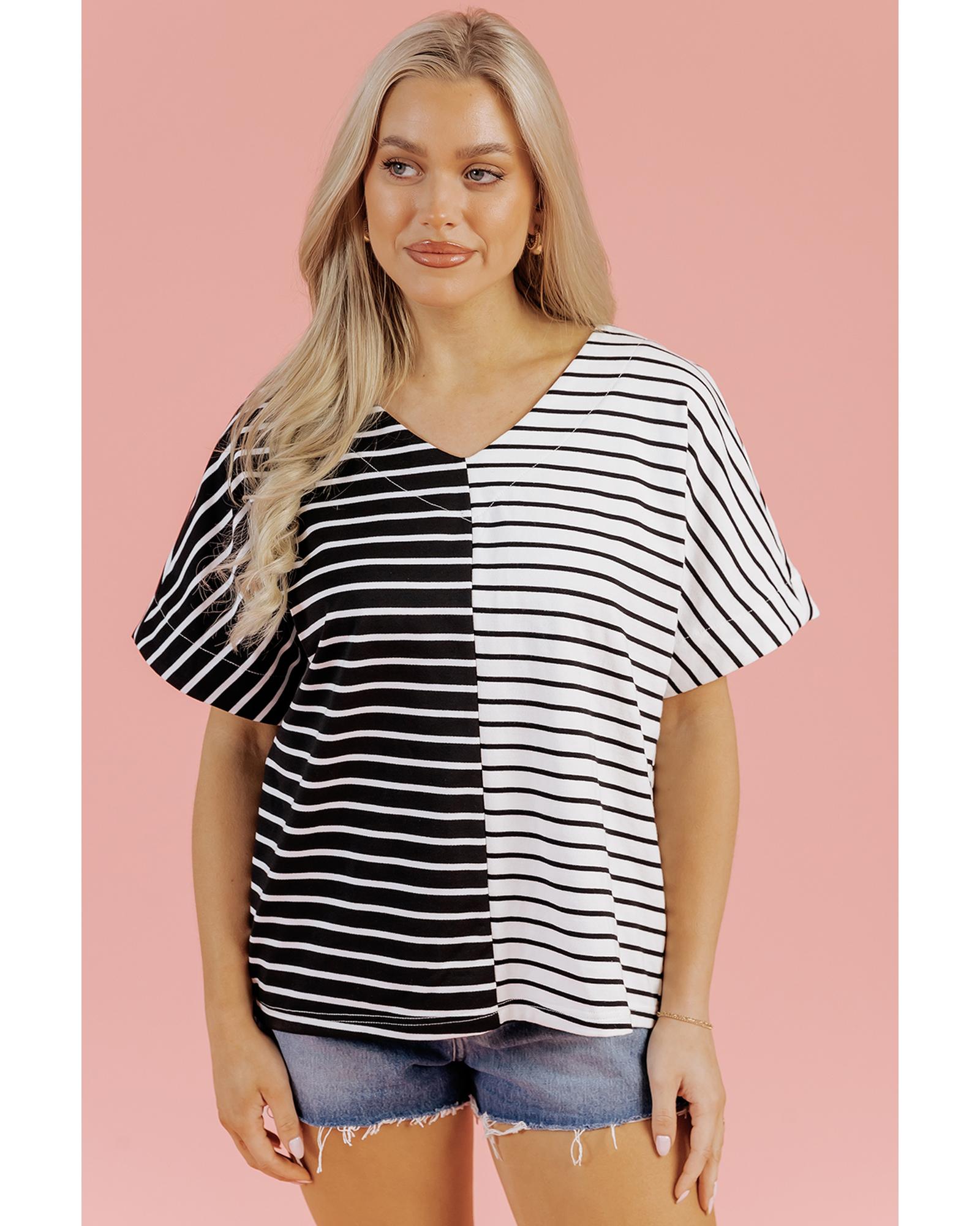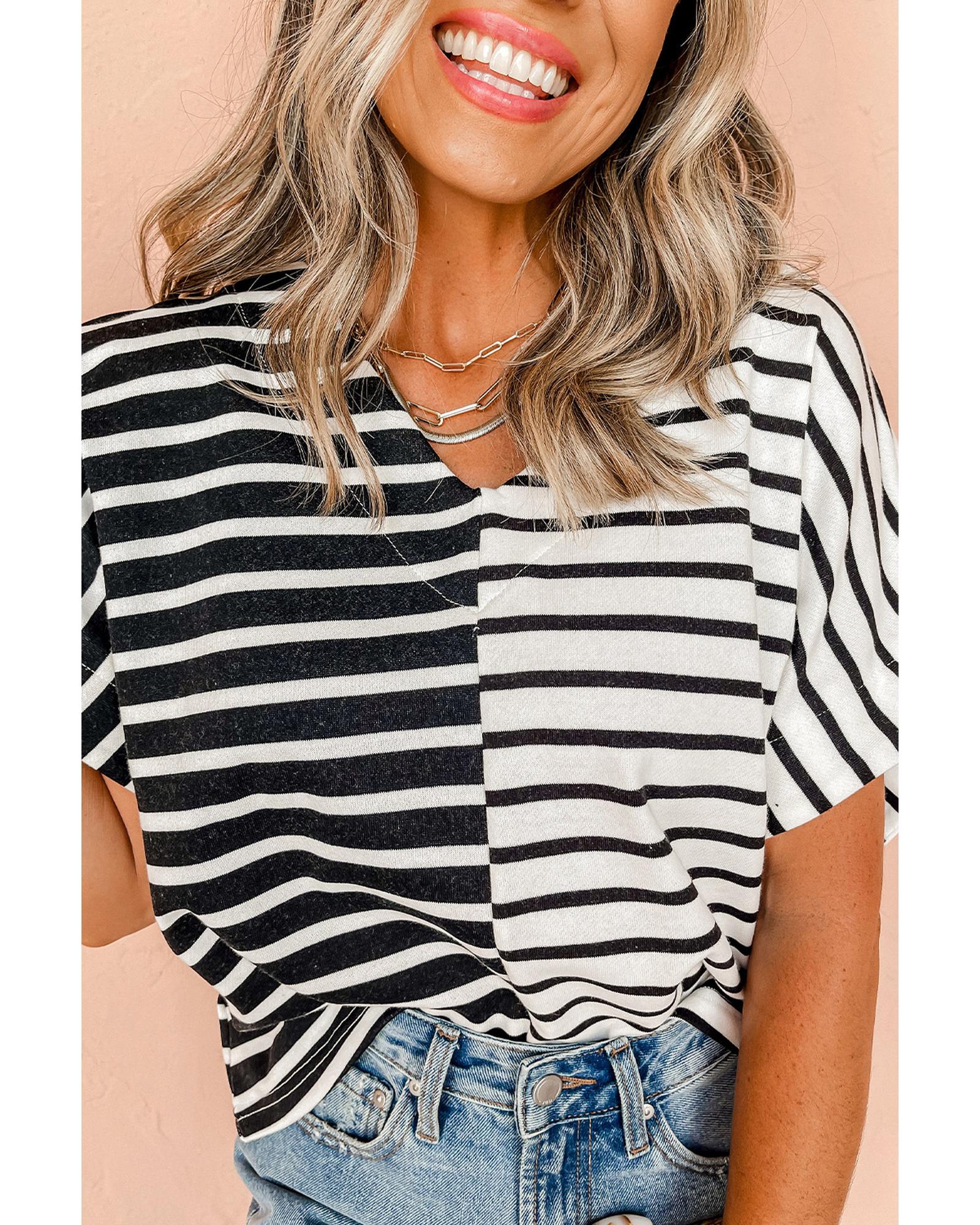 Black Stripe Two Tone Colorblock V Neck T Shirt – M