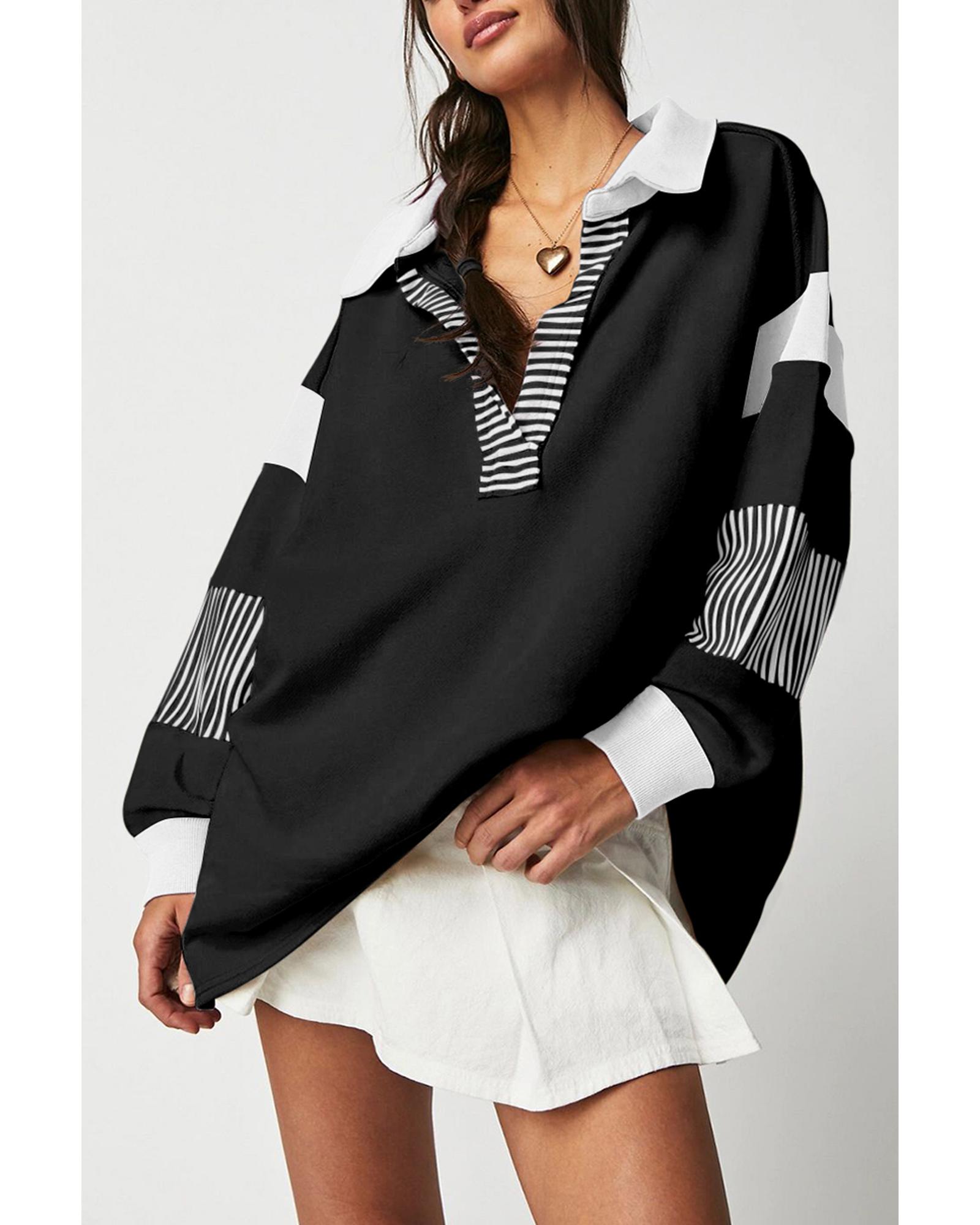 - Trendy Black Striped Colorblock Patchwork Collar Sweatshirt