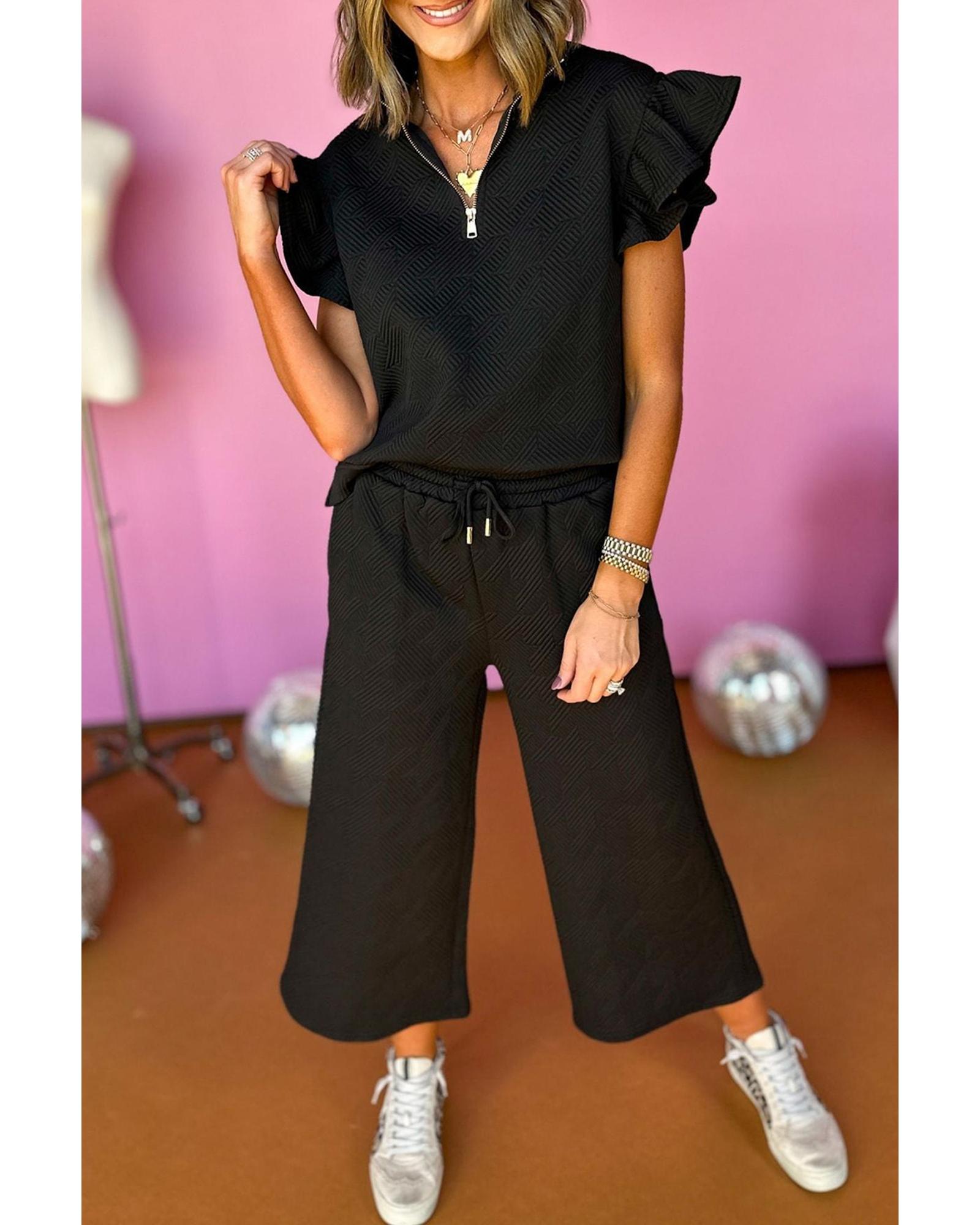 - Black textured top with flutter sleeves and wide leg pants set