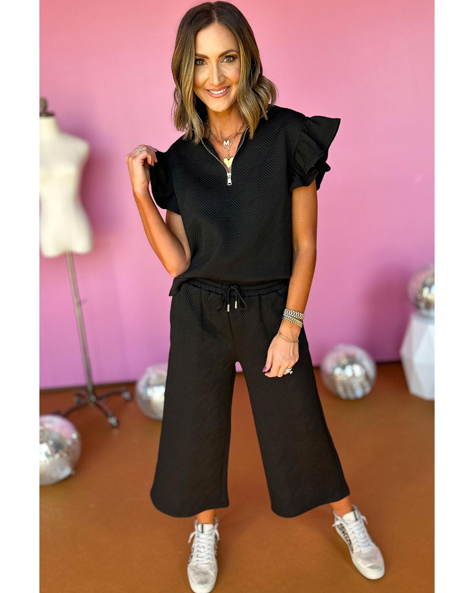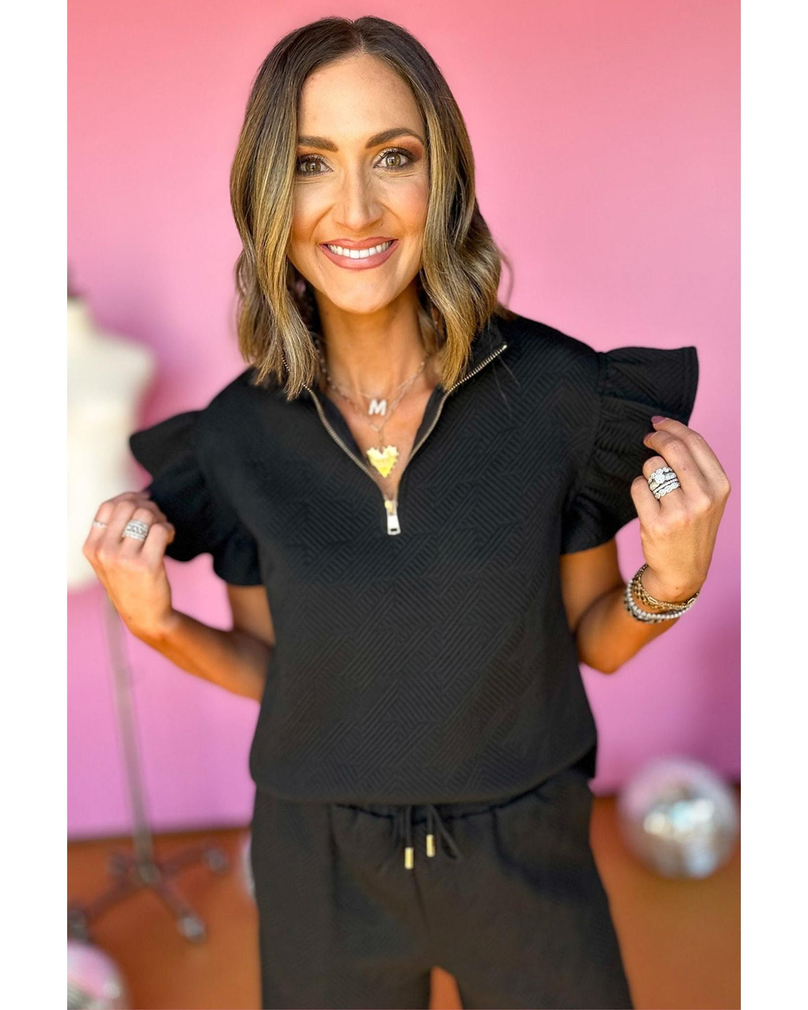 Black Textured Flutter Sleeve Top Wide Leg Pants Set – M