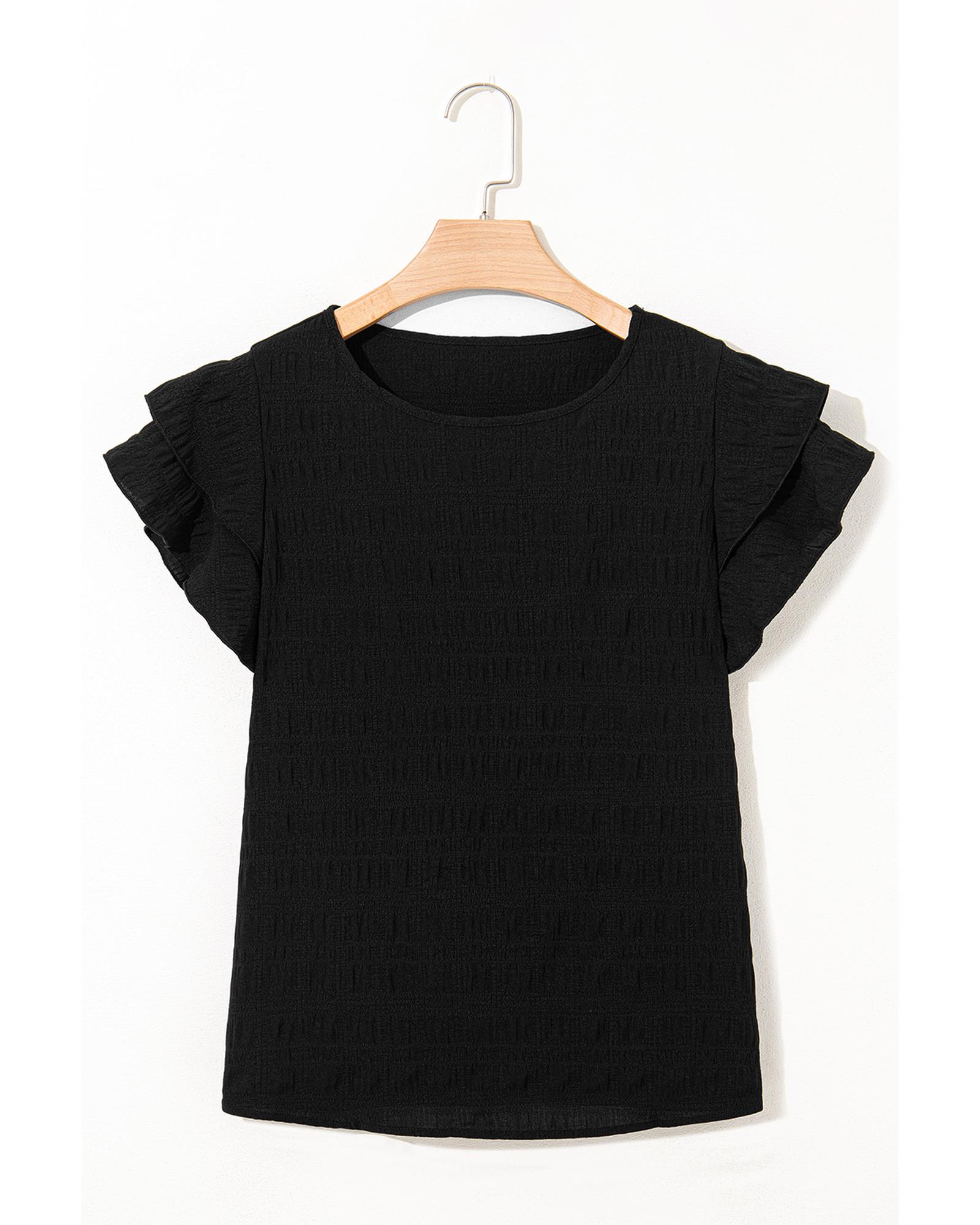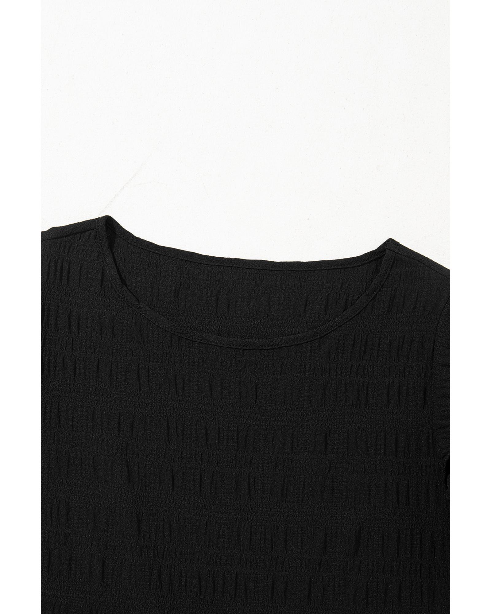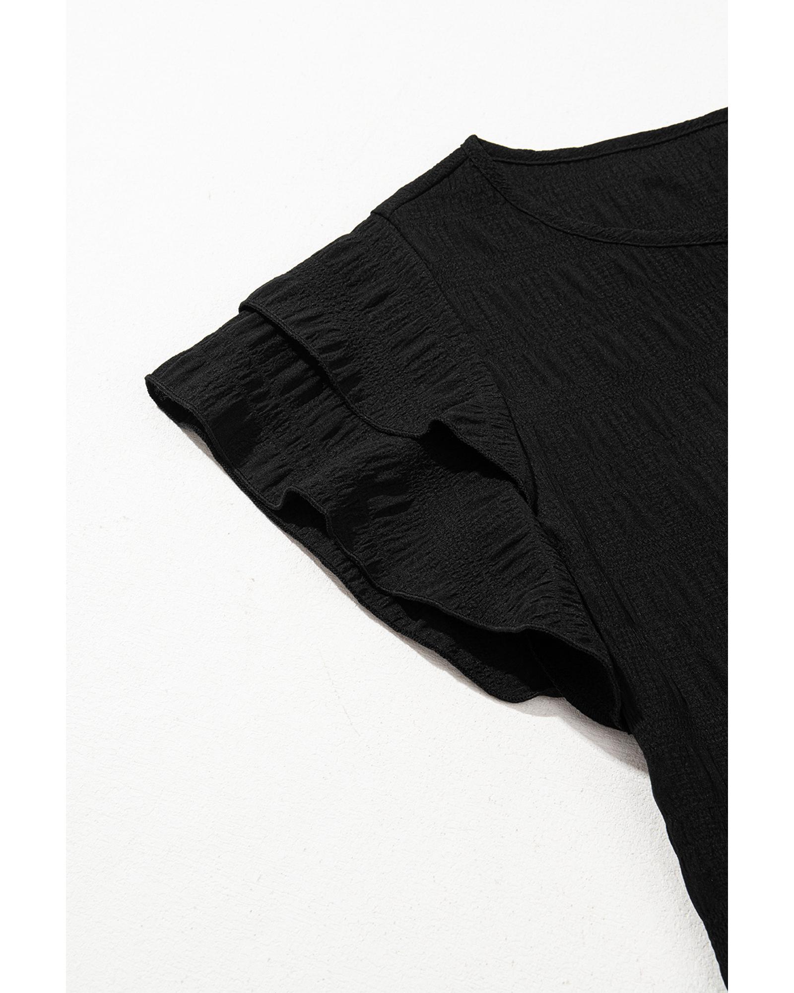 Black Textured Ruffled Sleeve Round Neck Top – S