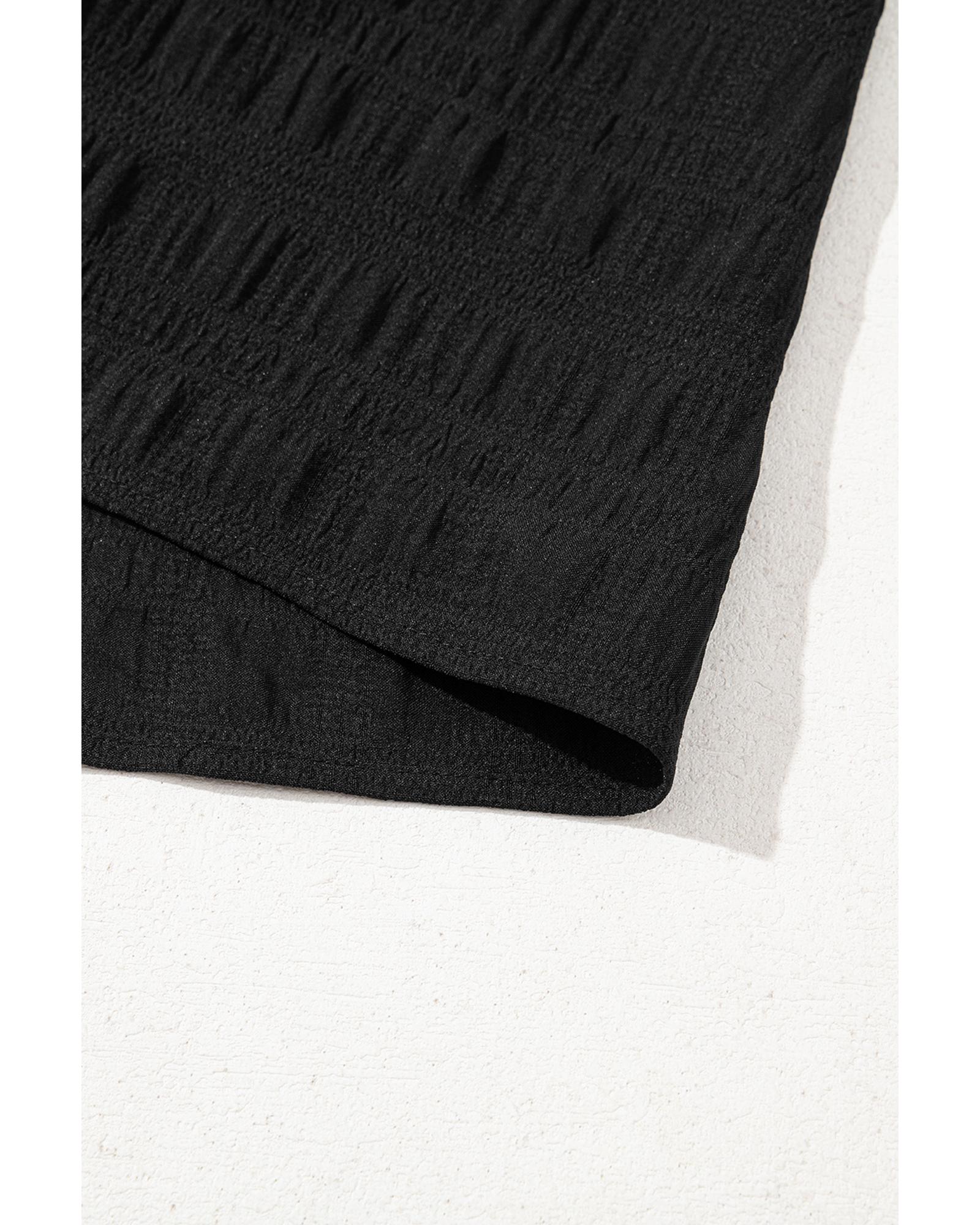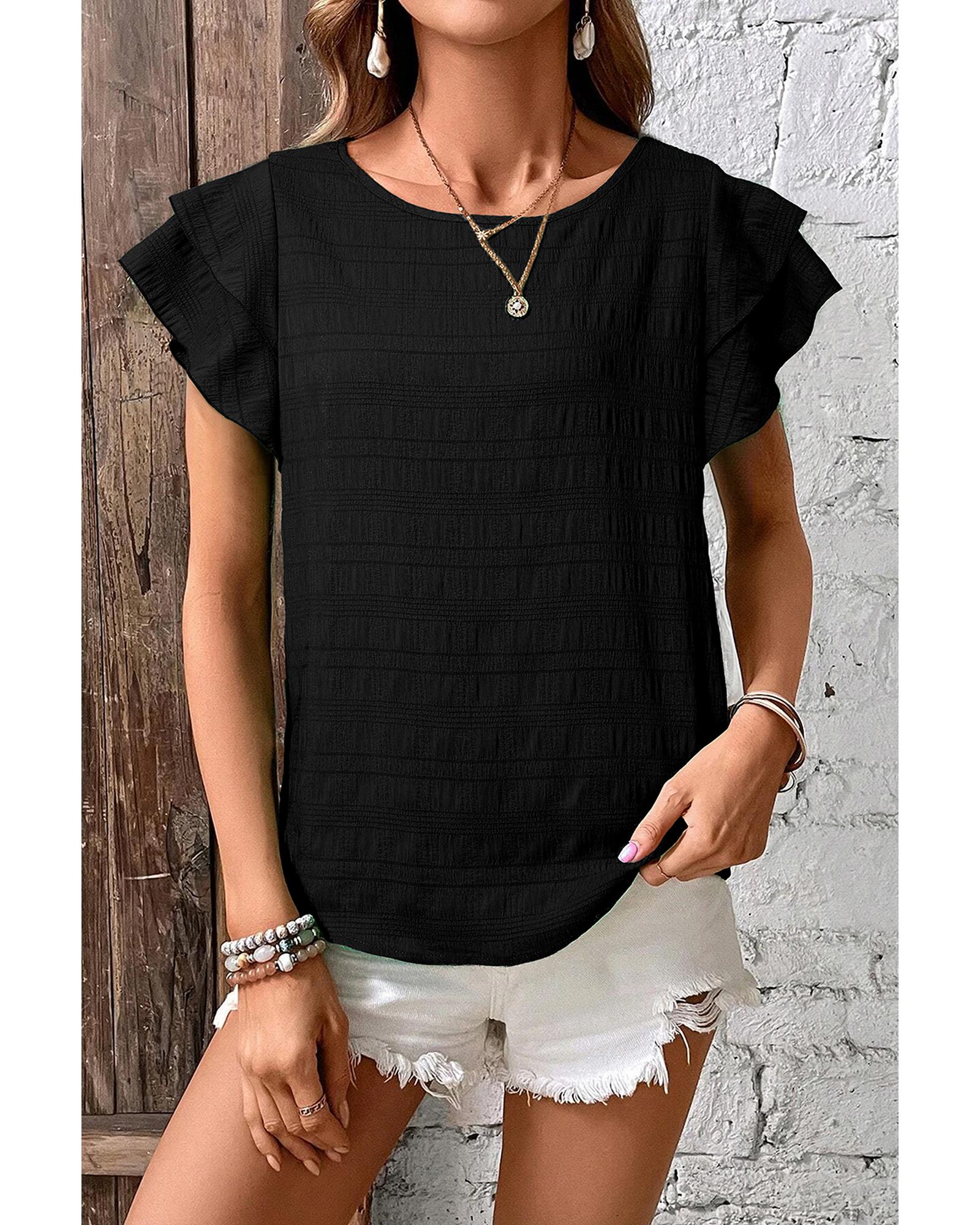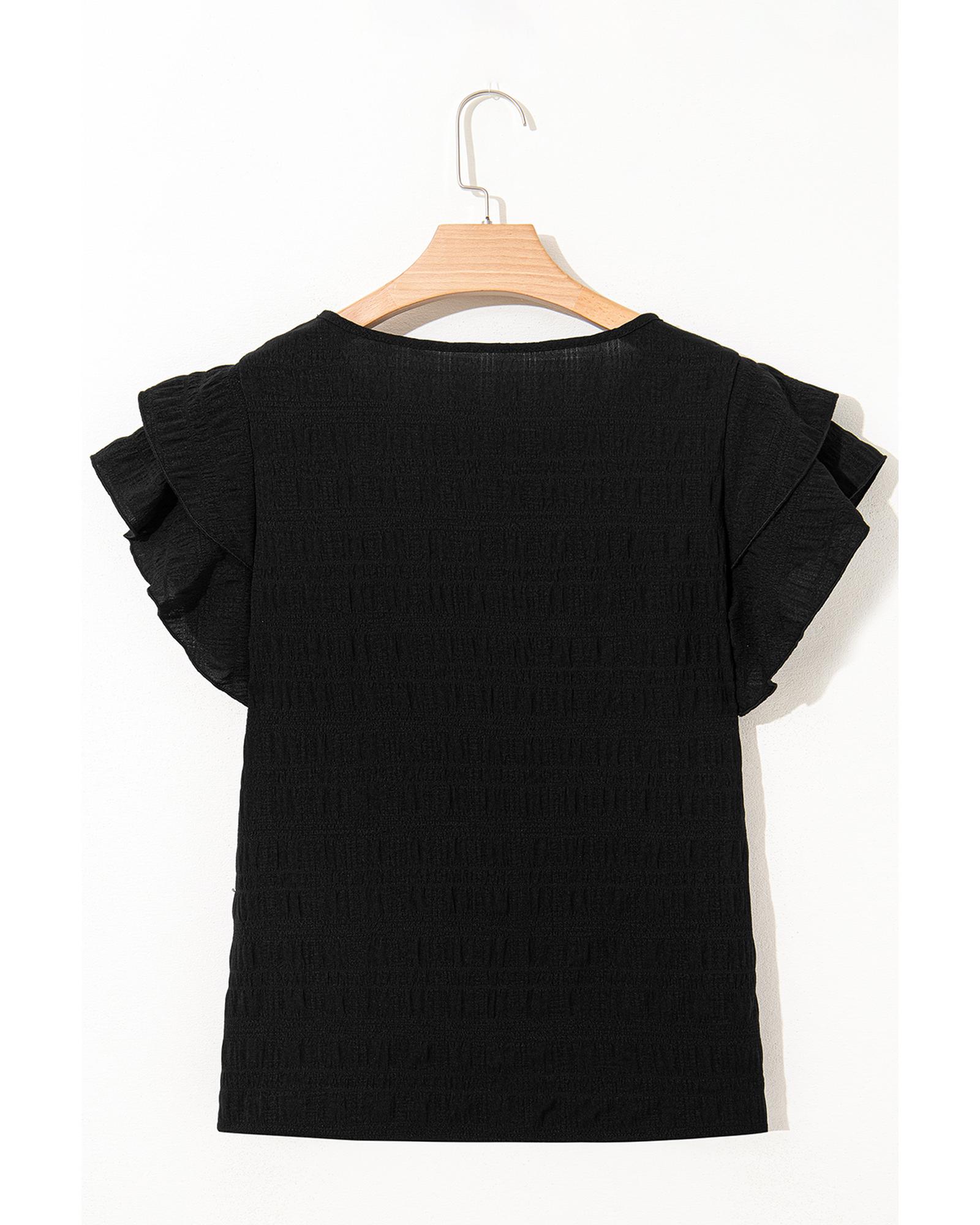 Black Textured Ruffled Sleeve Round Neck Top – S