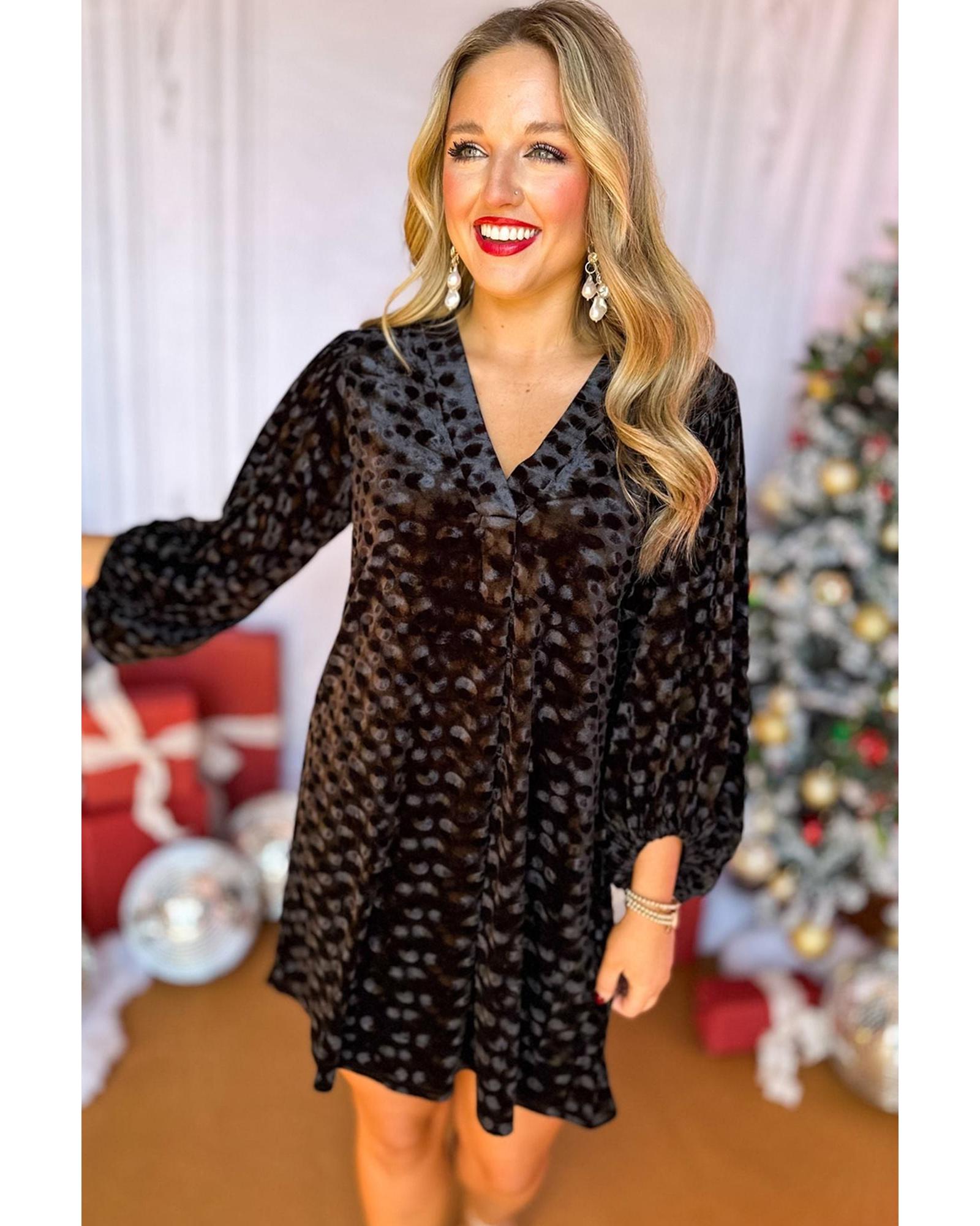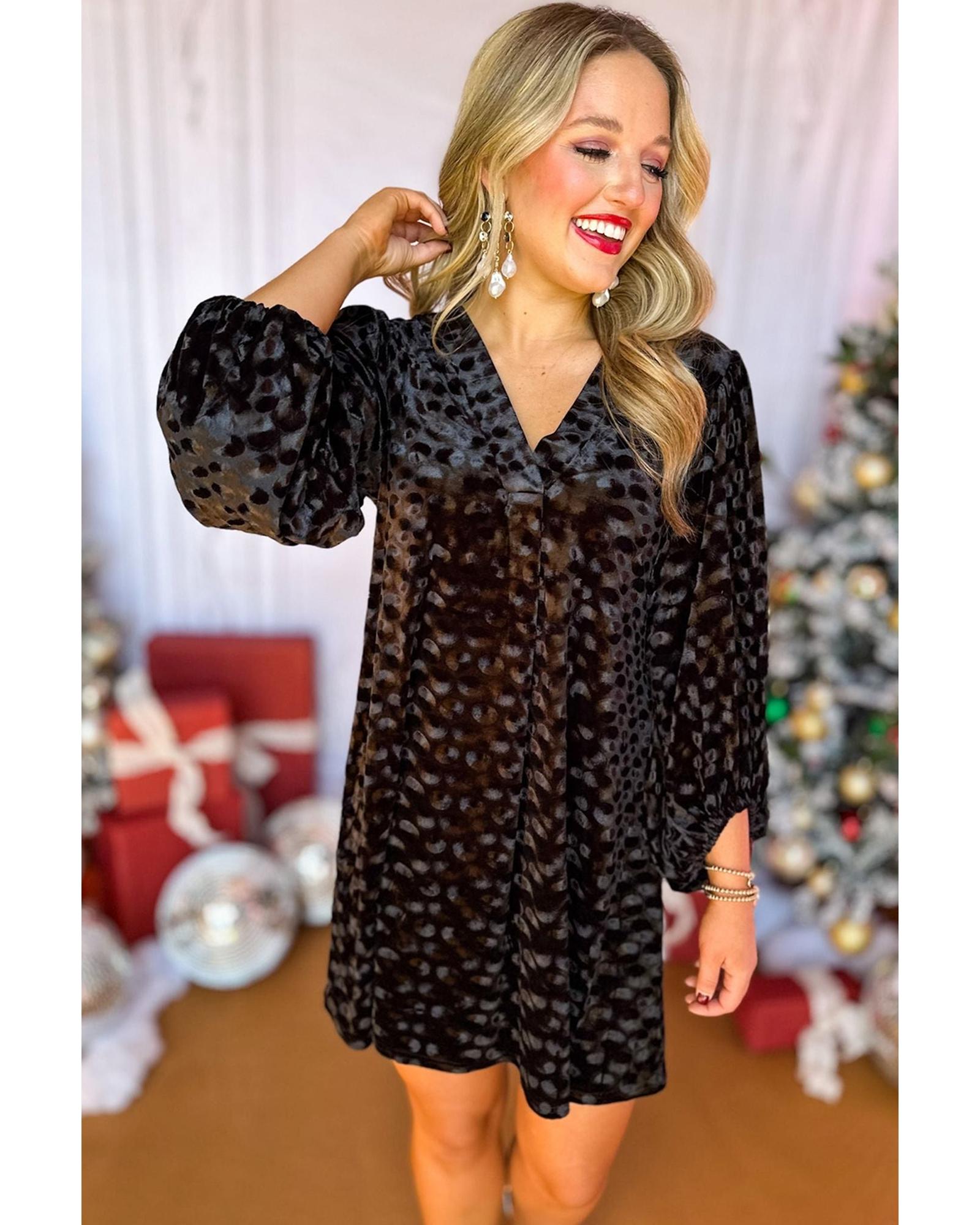 Black Textured V Neck Balloon Sleeve Velvet Mini Dress - L