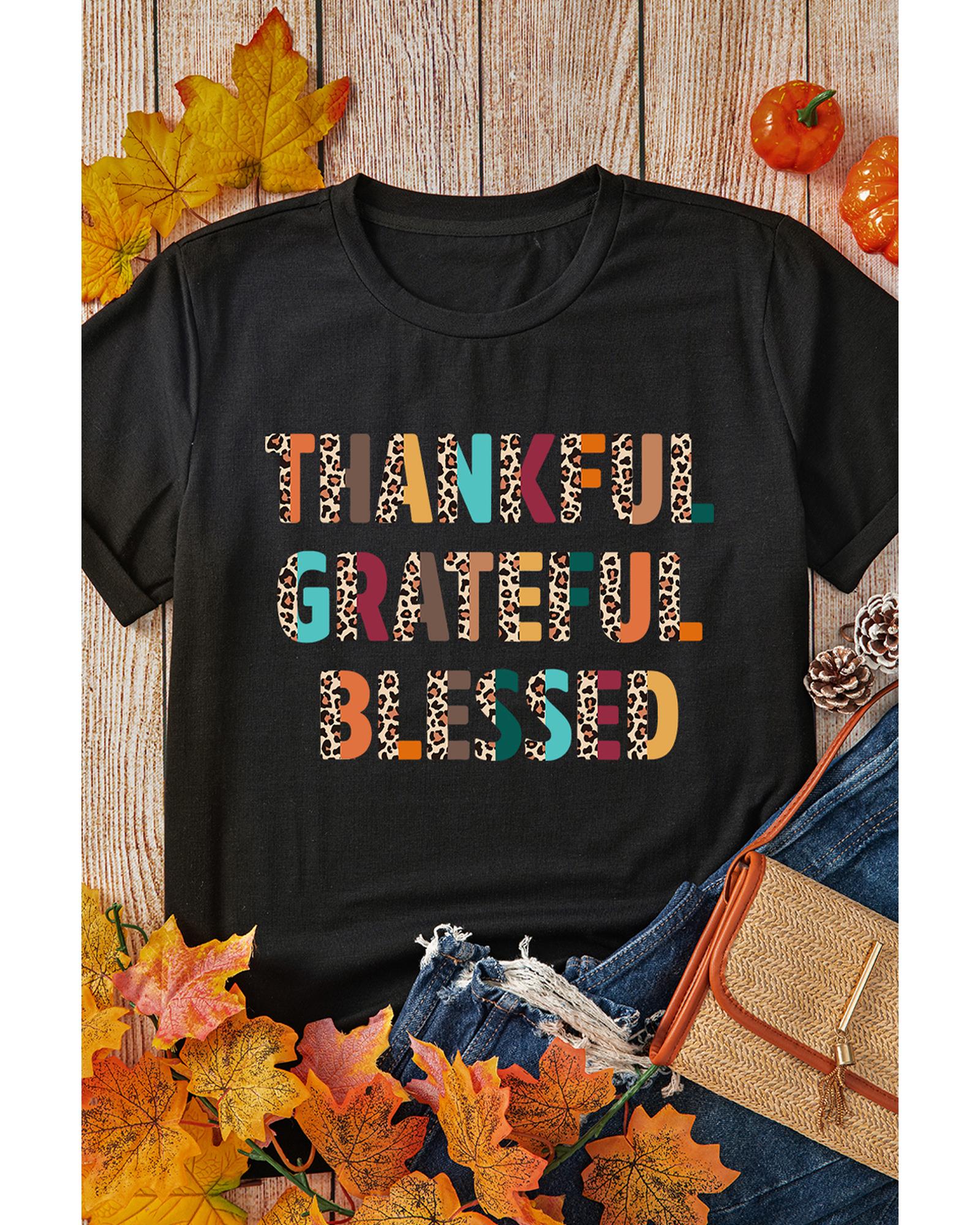 Black Thankful Grateful Blessed Leopard Print Crewneck T Shirt – S