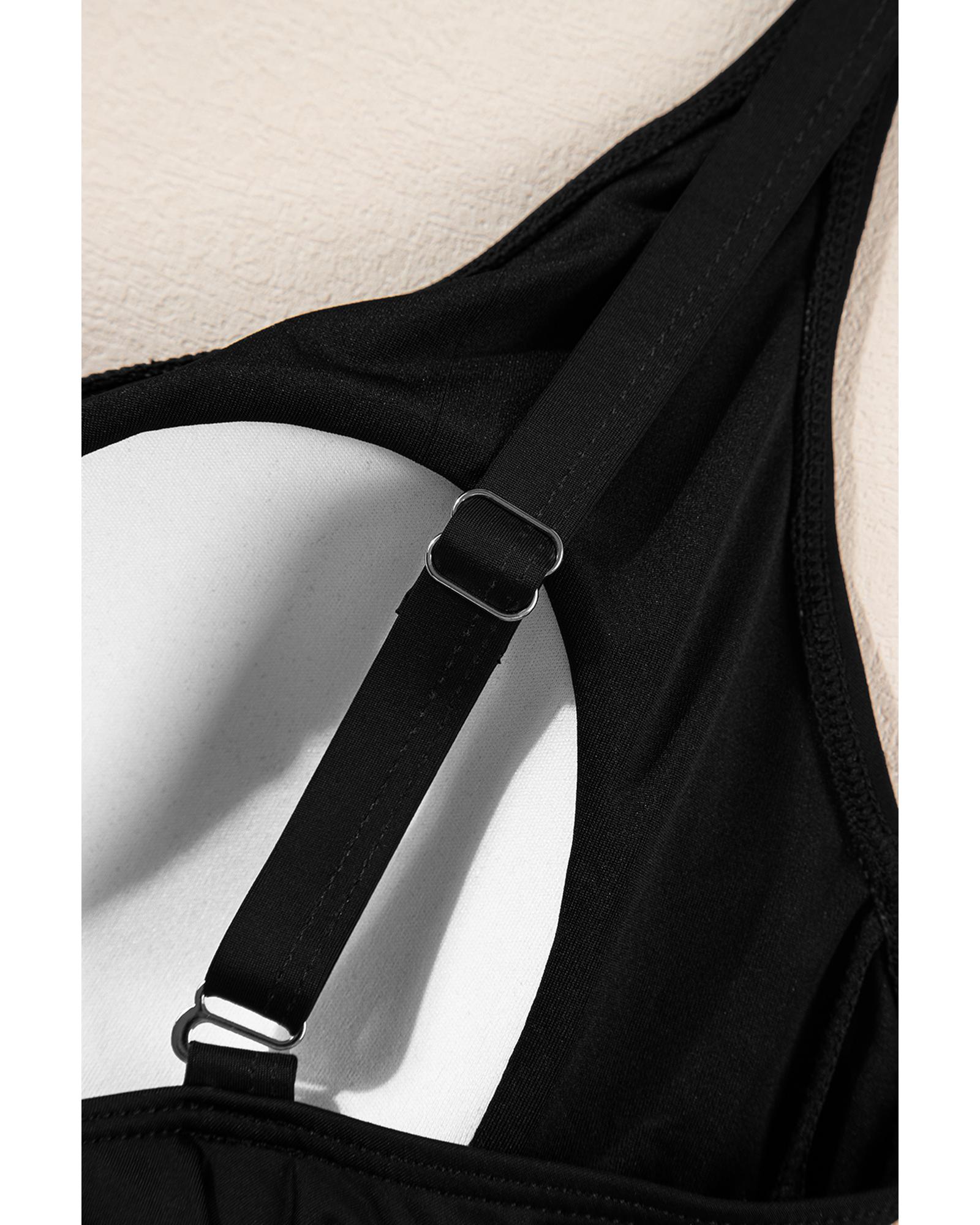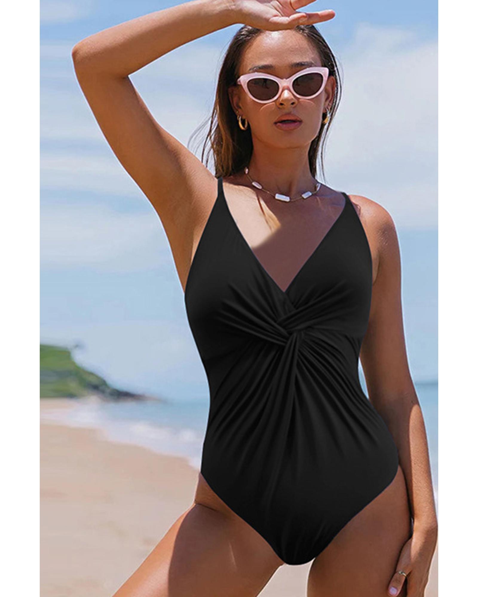 Black V Neck Twist Ruched Crisscross Backless One-Piece Swimsuit – M