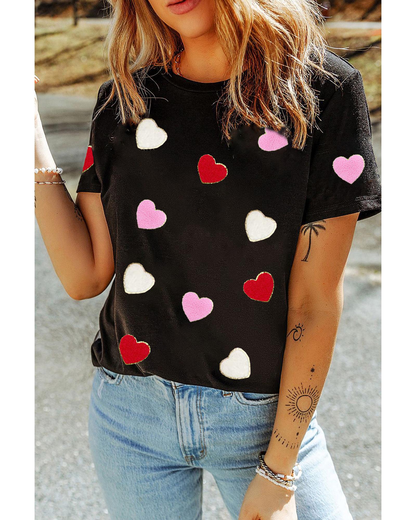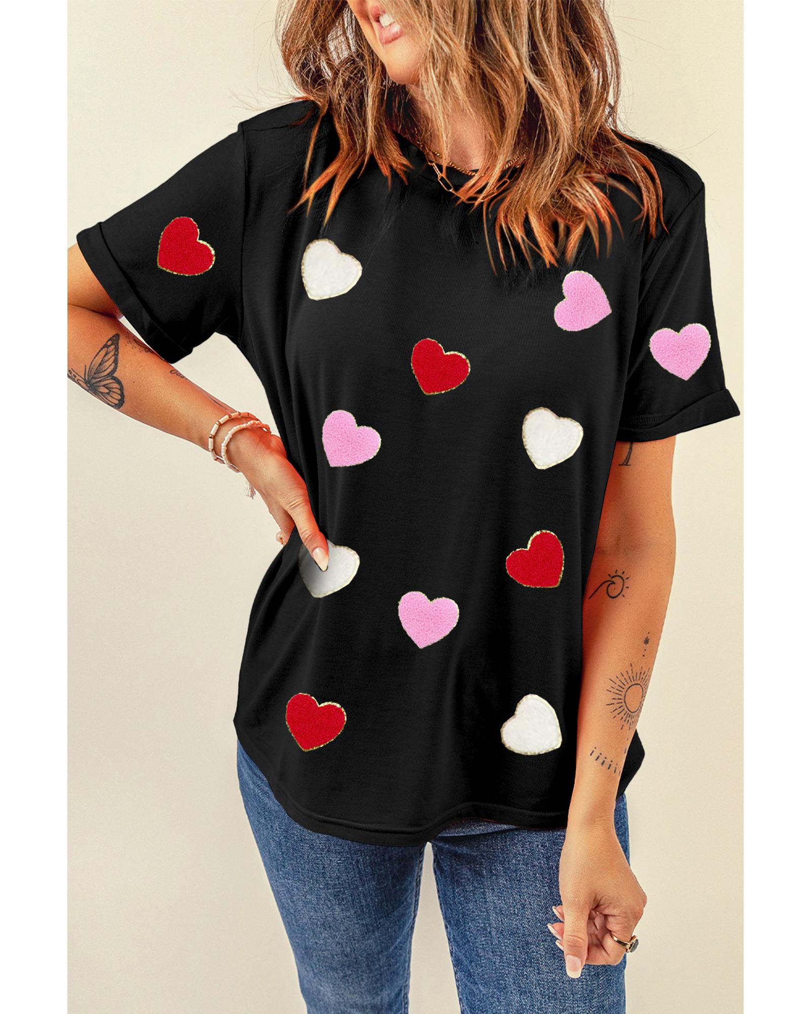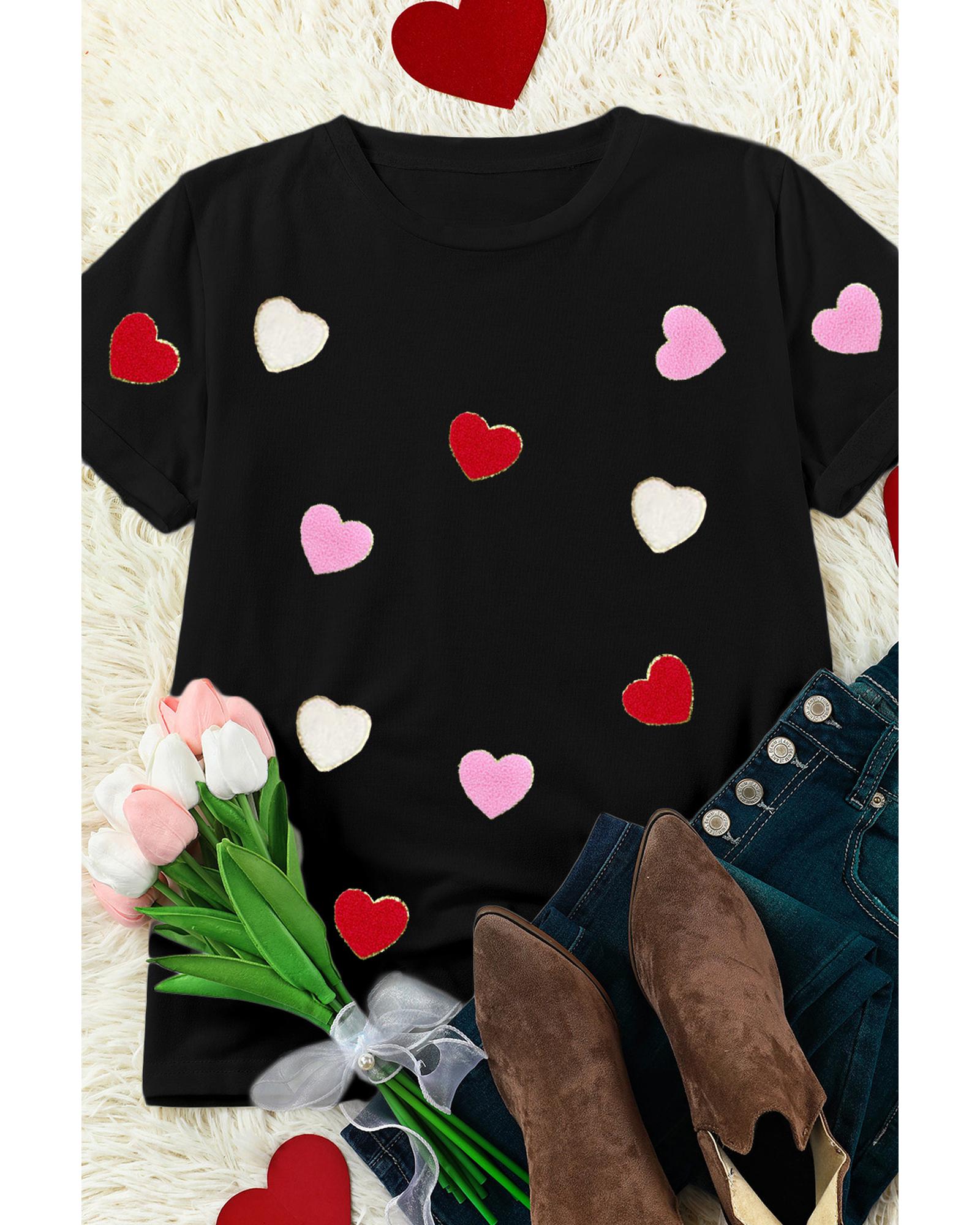 Black Valentines Chenille Heart Patched Pattern Crewneck Tee – 2XL