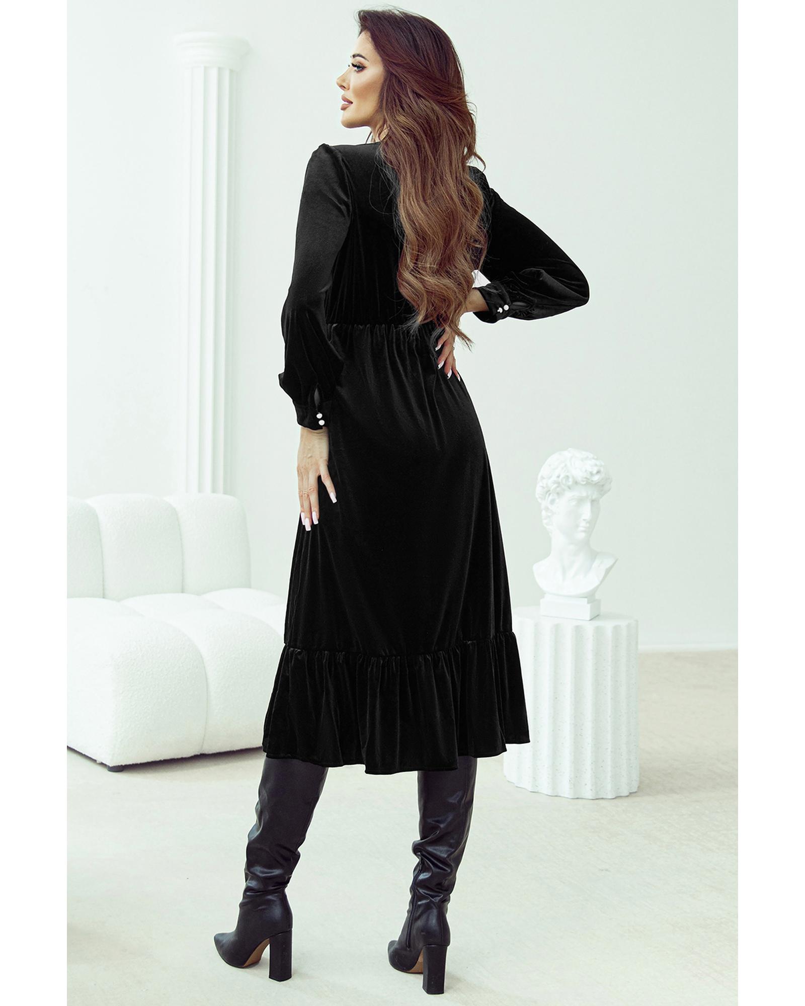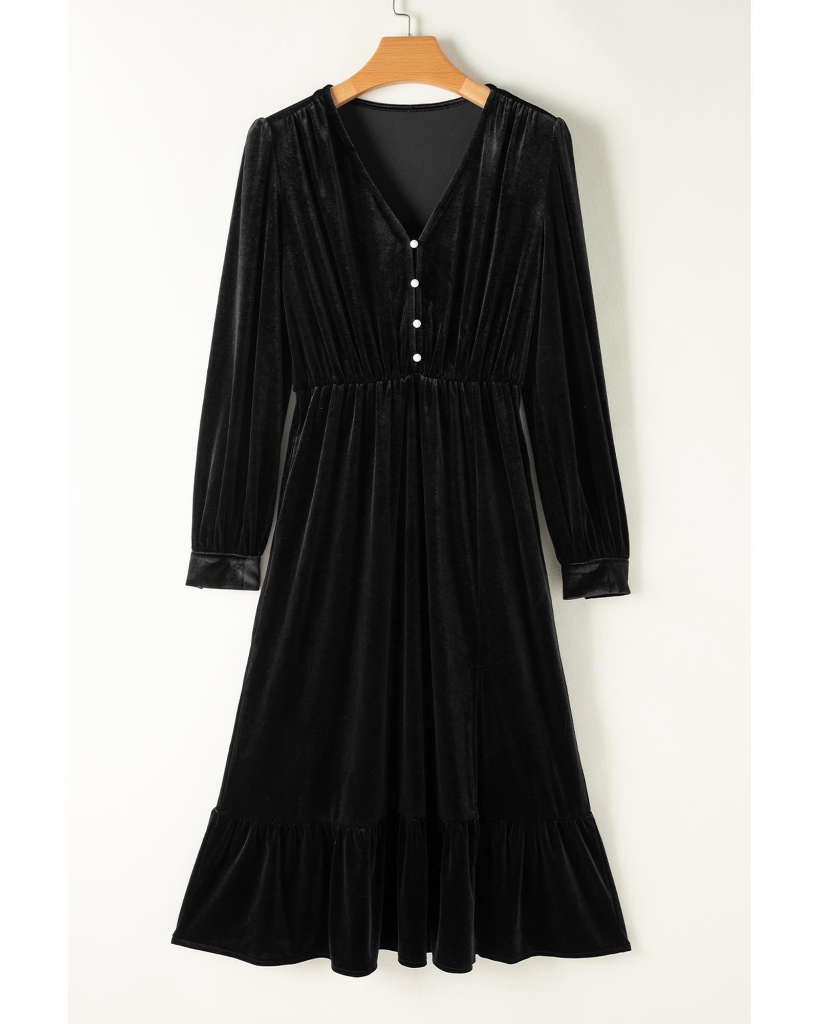 Black Velvet Buttoned Puff Sleeve V Neck Split Midi Dress – S
