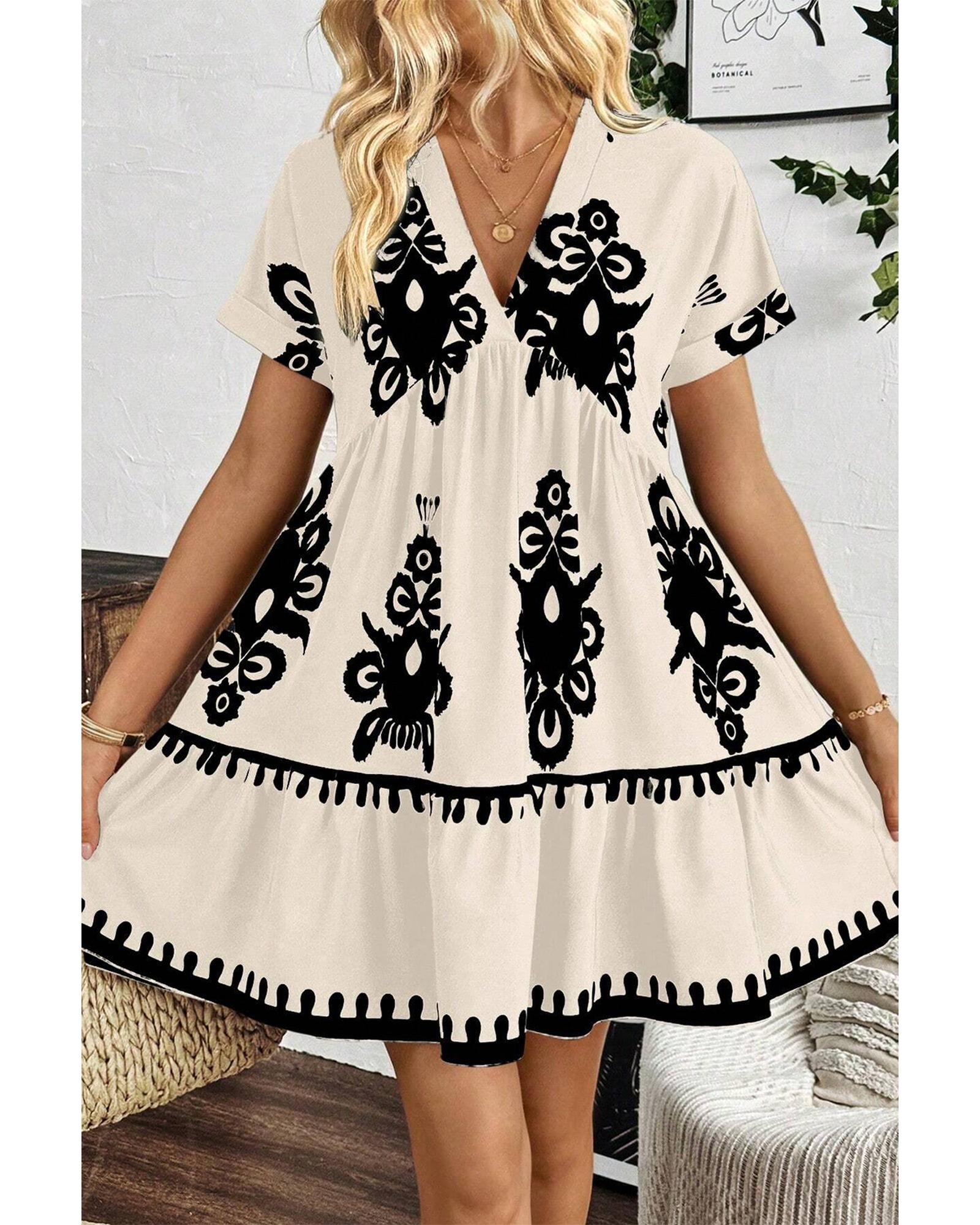 Black Vintage Print V Neck High Waist Short Sleeve Dress – XL