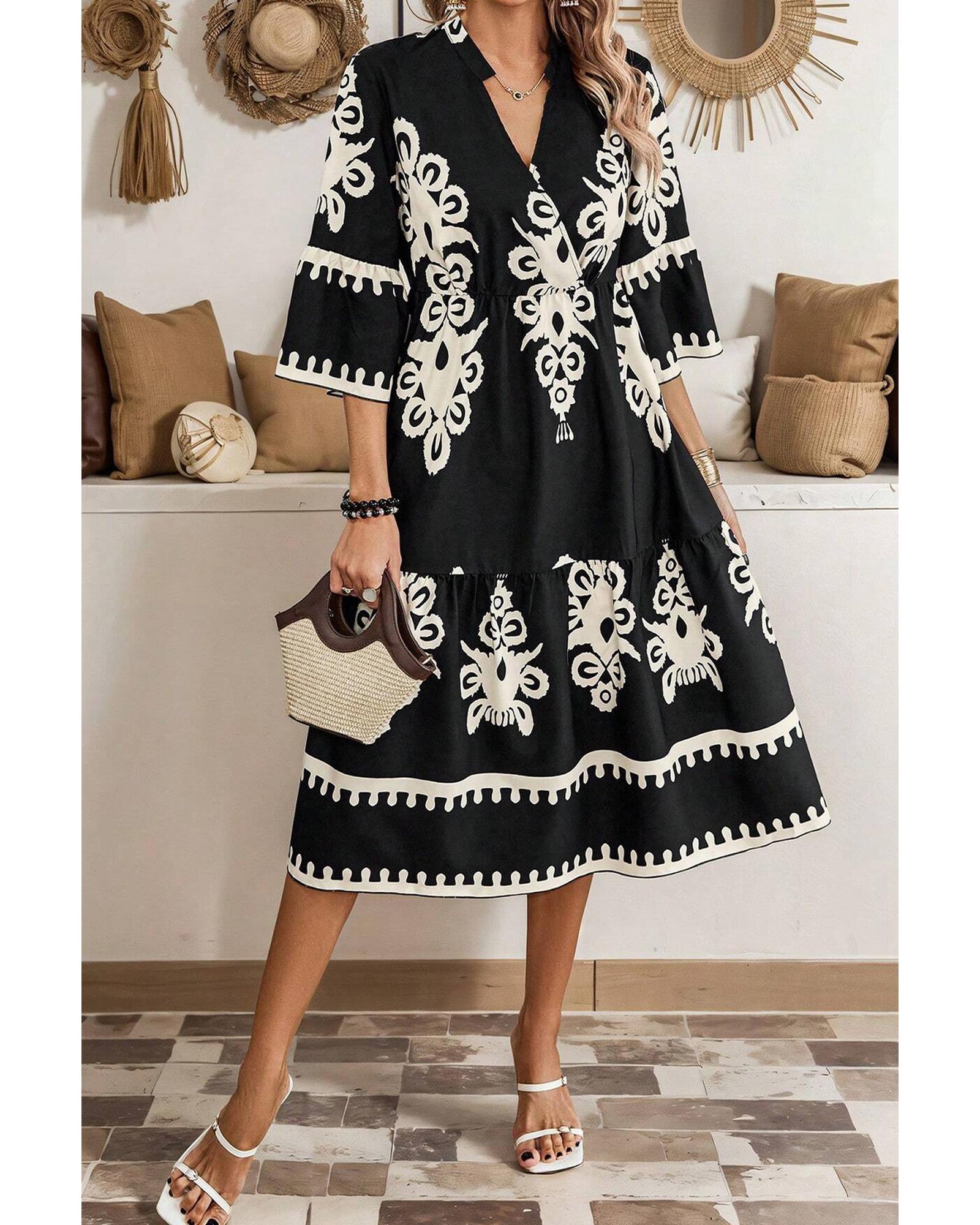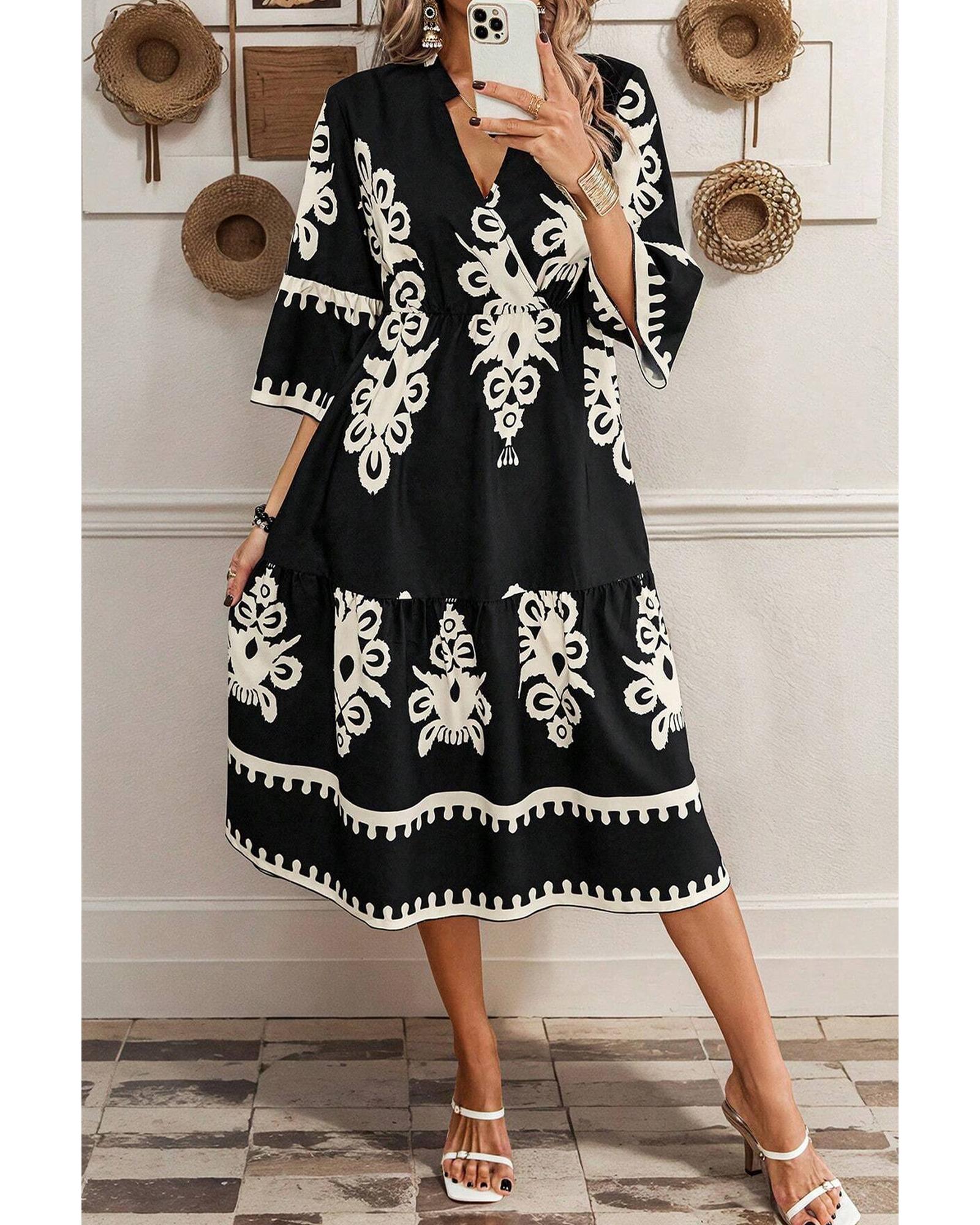 Black Western Geometric Print 3/4 Sleeve Loose Midi Dress – S