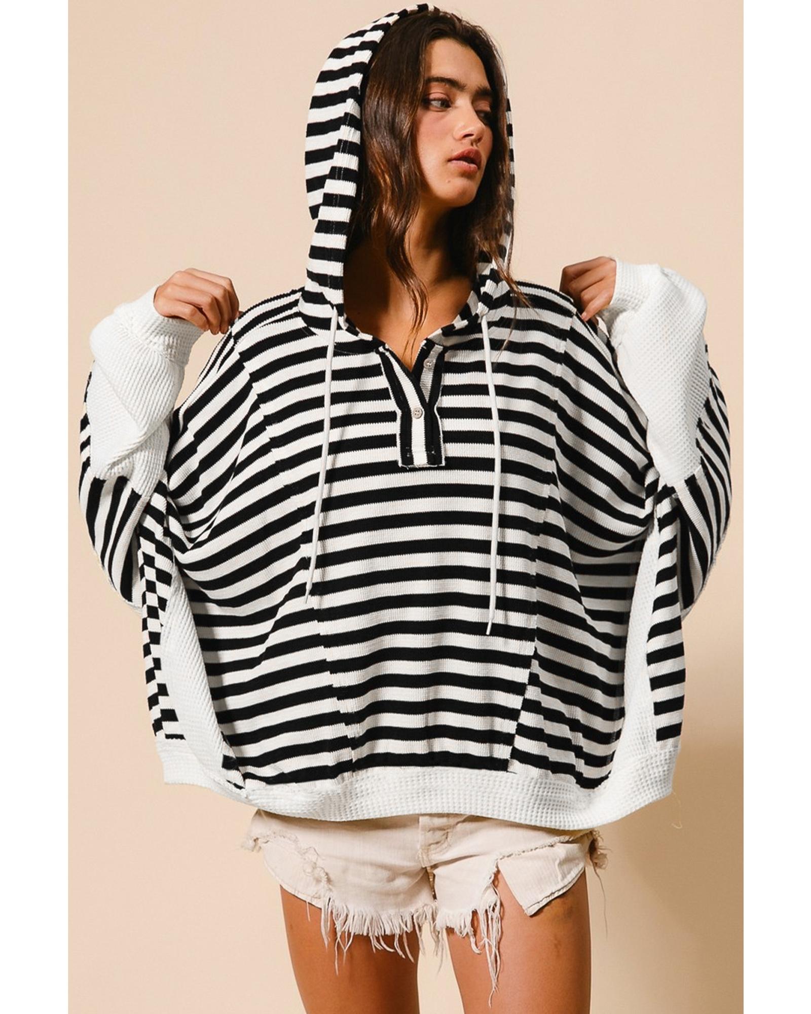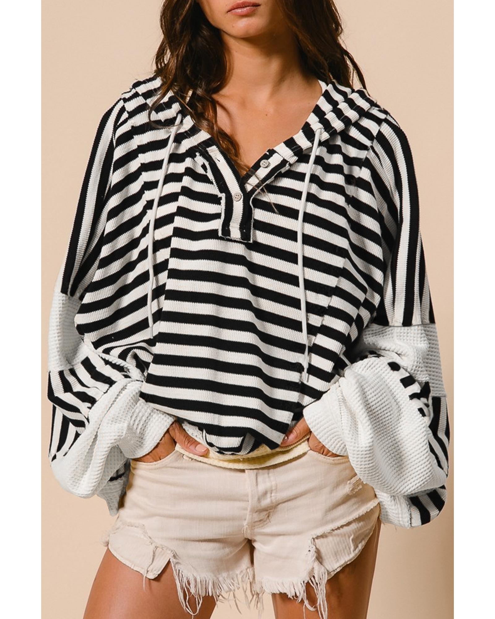 Black white Oversized Striped Henley Buttons Dolman Sleeve Hooded Top – L