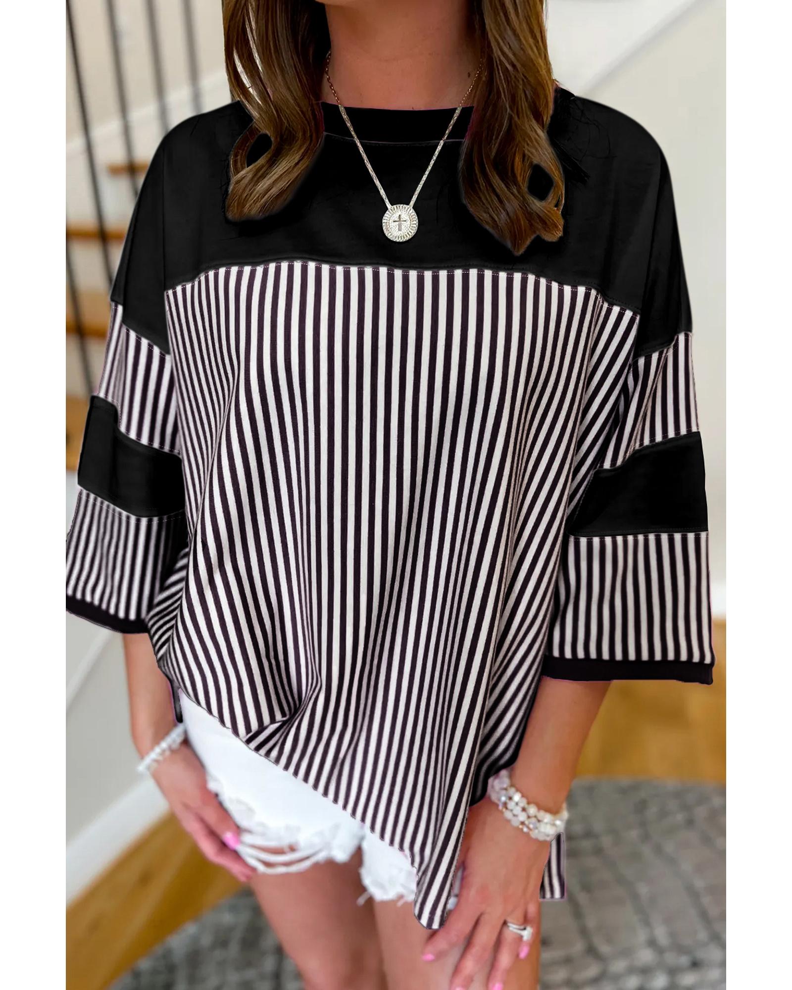 Black White Striped Patchwork 3/4 Sleeve Oversize Top – M