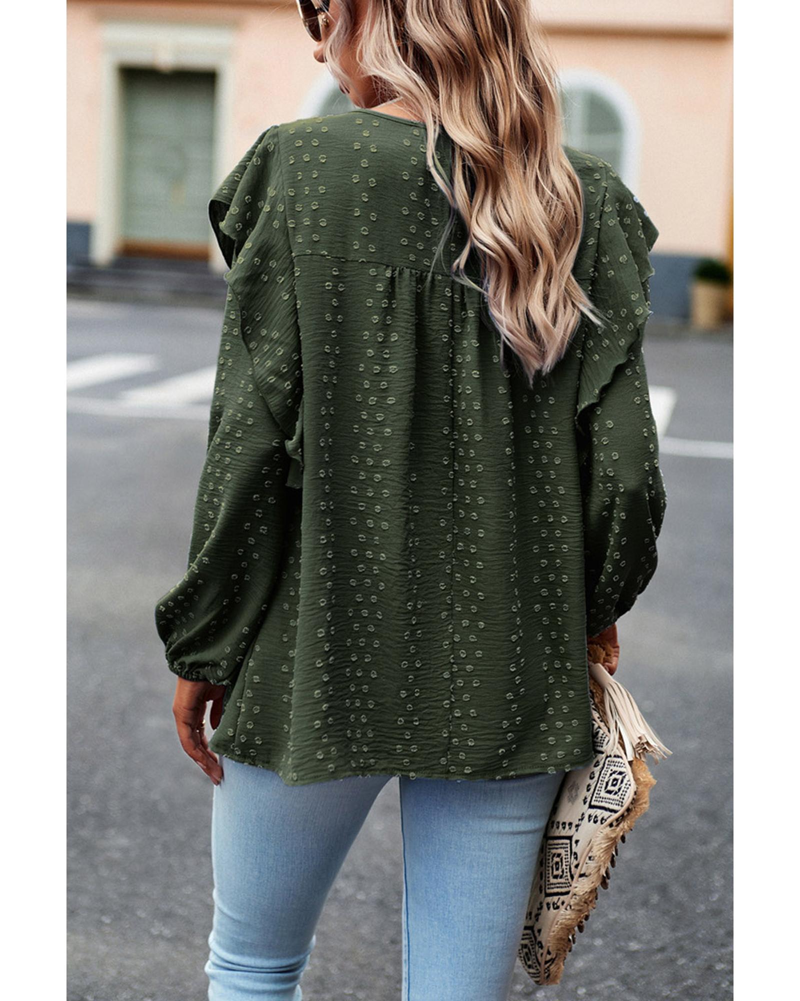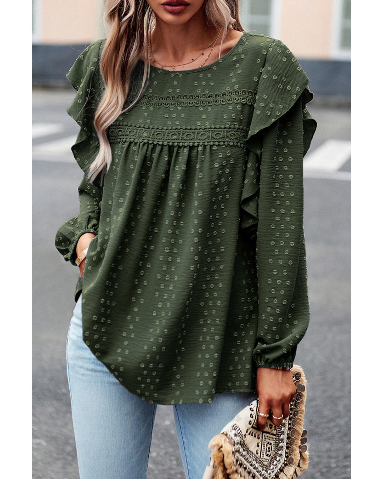 Blackish Green Lace Eyelet Ruffle Shoulder Long Sleeve Blouse – XL