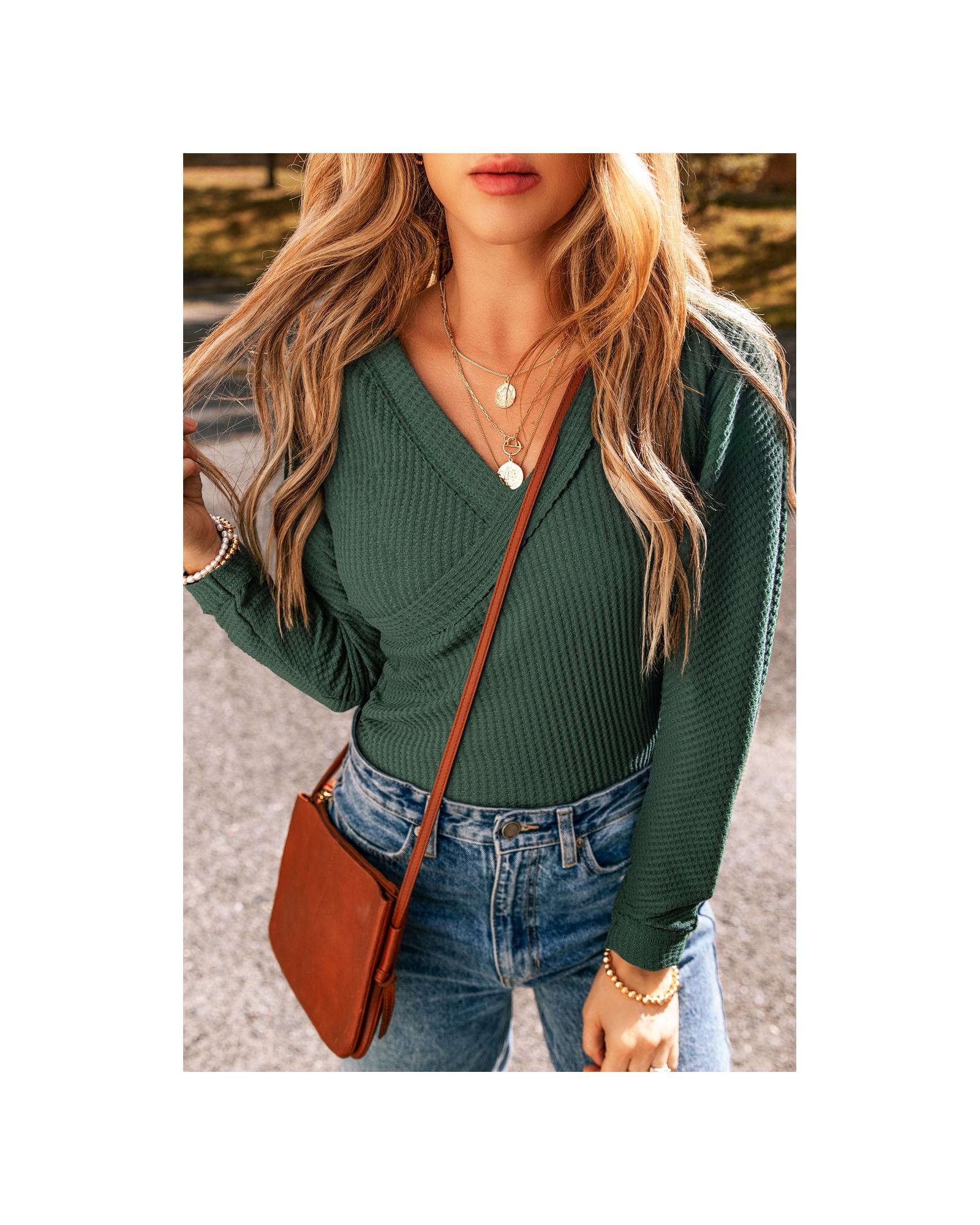 Blackish Green Waffle Knit Slim Fit Wrap V Neck Bodysuit – S