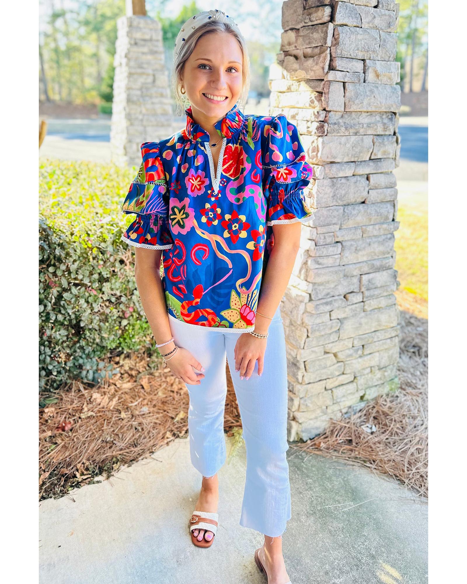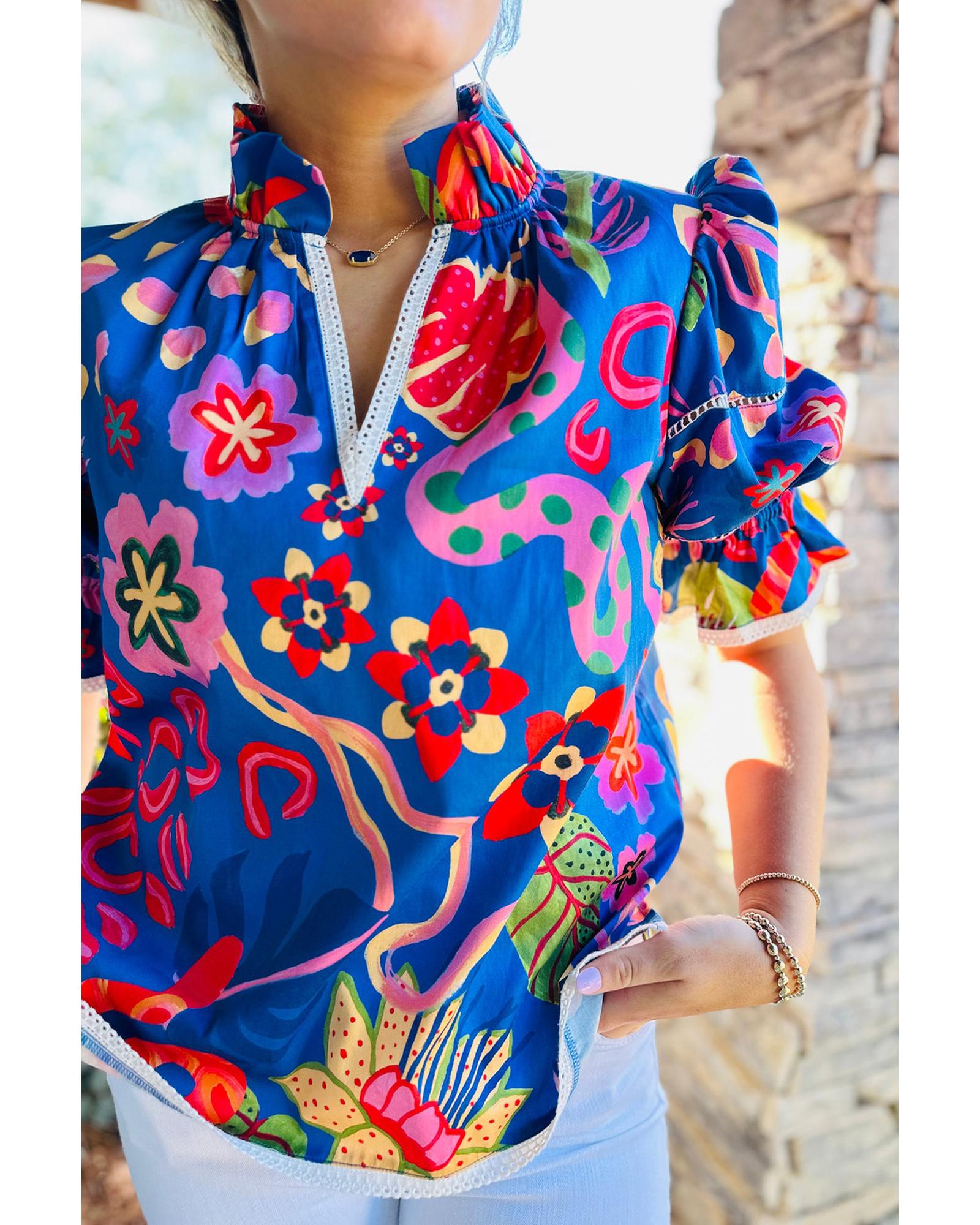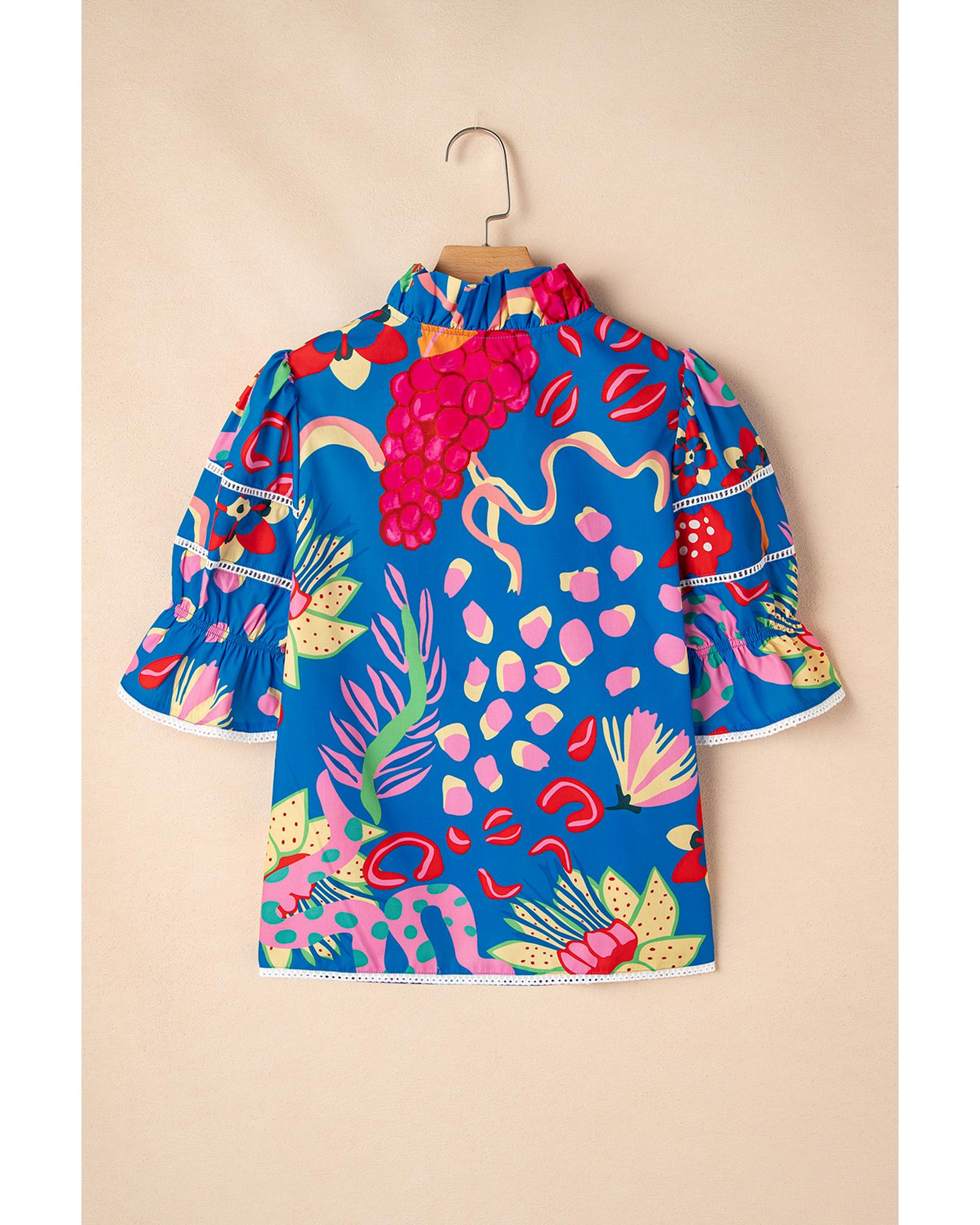 Blue Abstract Print Frilled Collar Ruffled Puff Short Sleeve Top – M